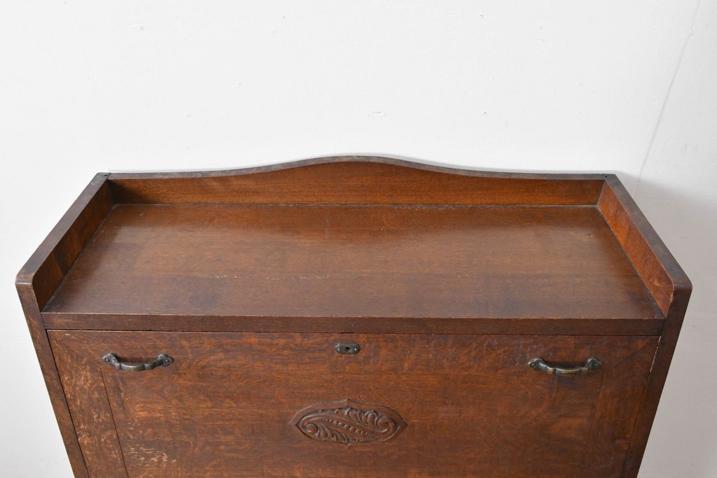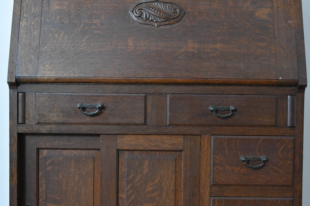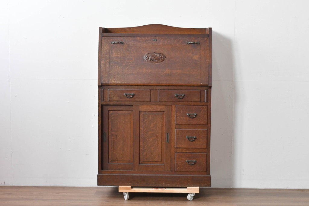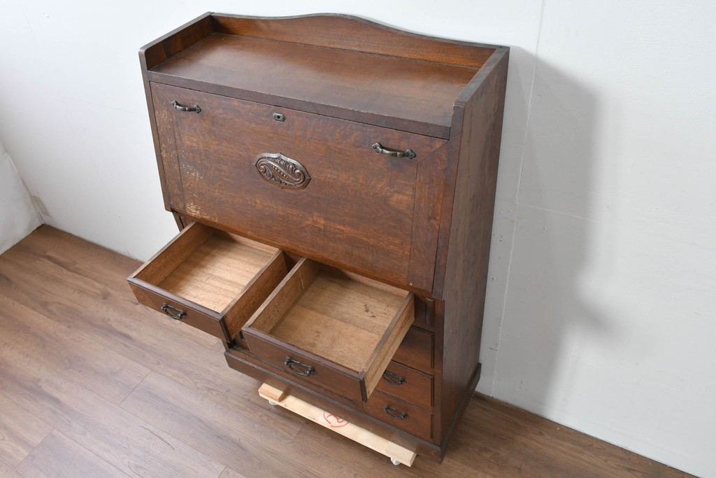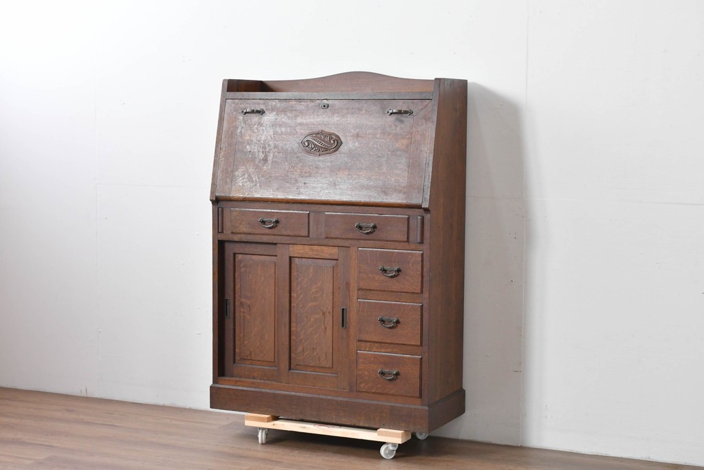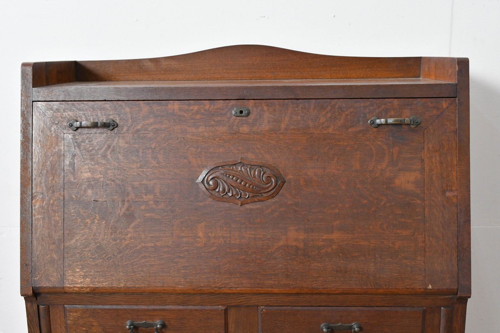 • 和製アンティーク 上手物!! 大正ロマン 繊細な彫刻装飾がアクセントのナラ材製ライティングビューロー (R-085121)