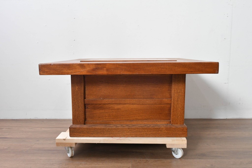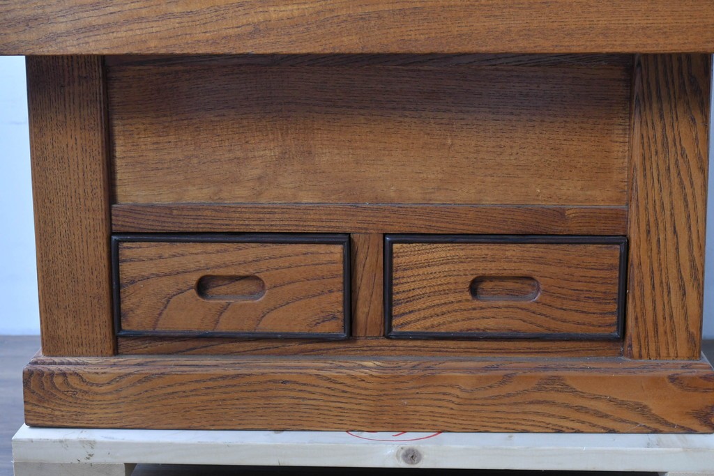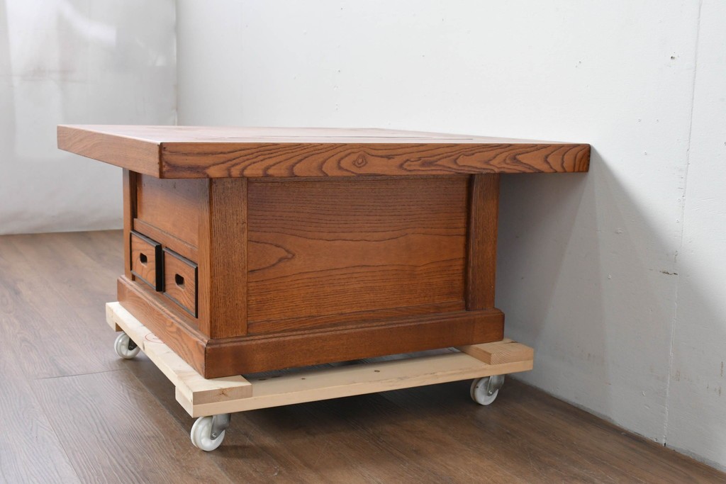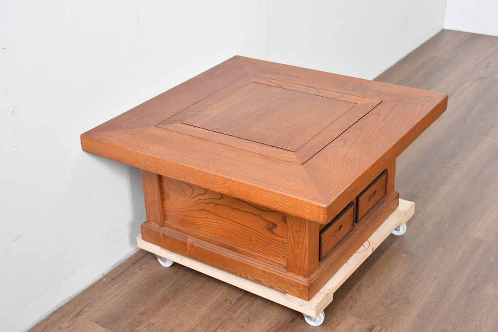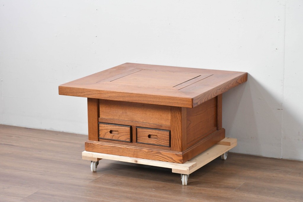 和の趣を感じさせる、囲炉裏テーブルです。中央には金属製の火鉢が収められ、古き良き団らんの情景がよみがえります。下部には小引き出しが2杯備わり、火箸などの収納にも便利な造りです。重厚な木地の風合いと丁寧な仕口が美しく、現代のインテリアにも自然に馴染む一台です。ディスプレイテーブルやセンターテーブルとしてもおすすめです。