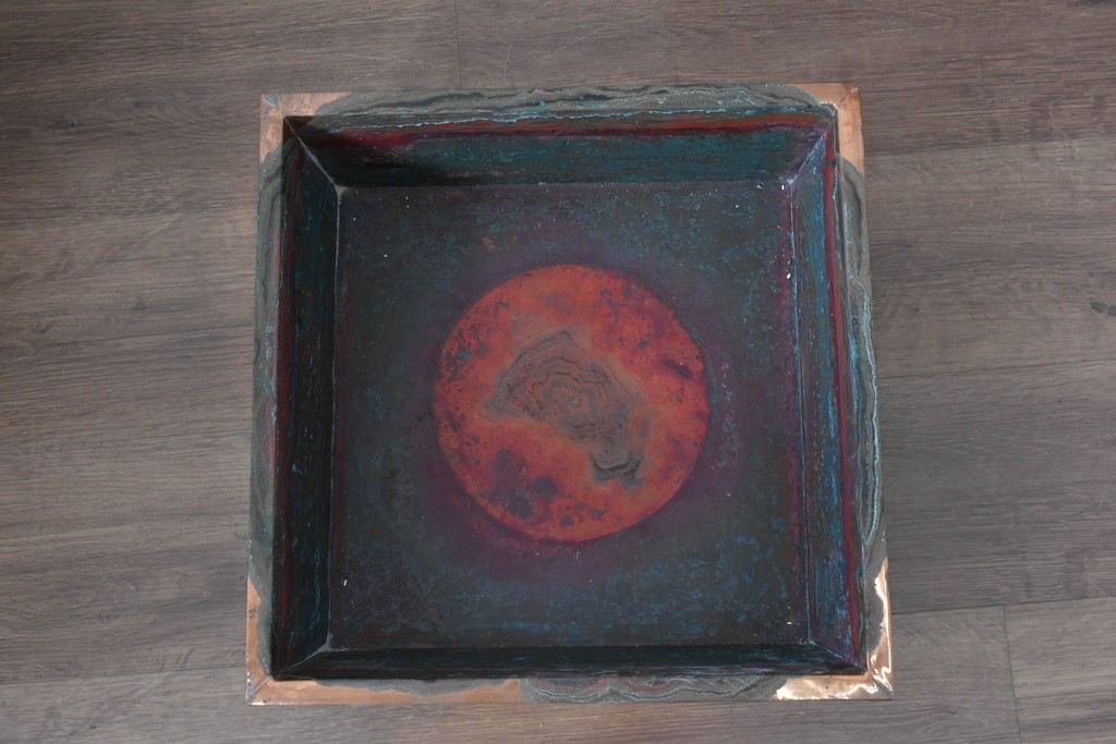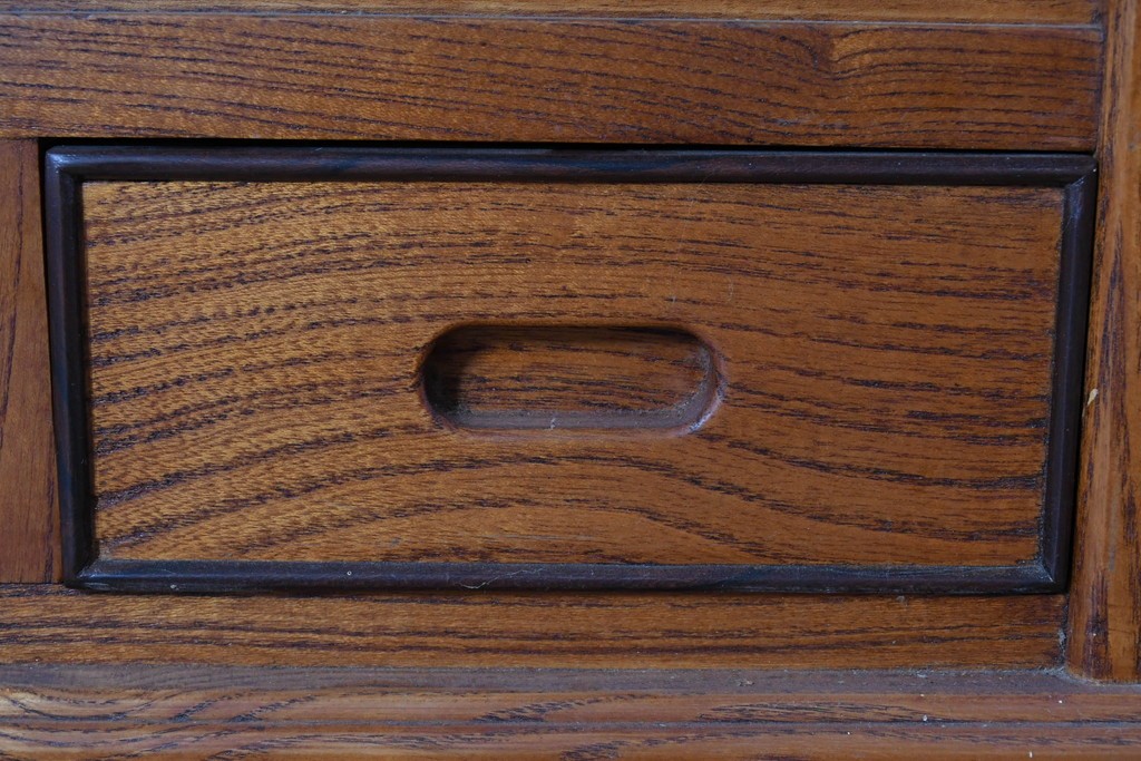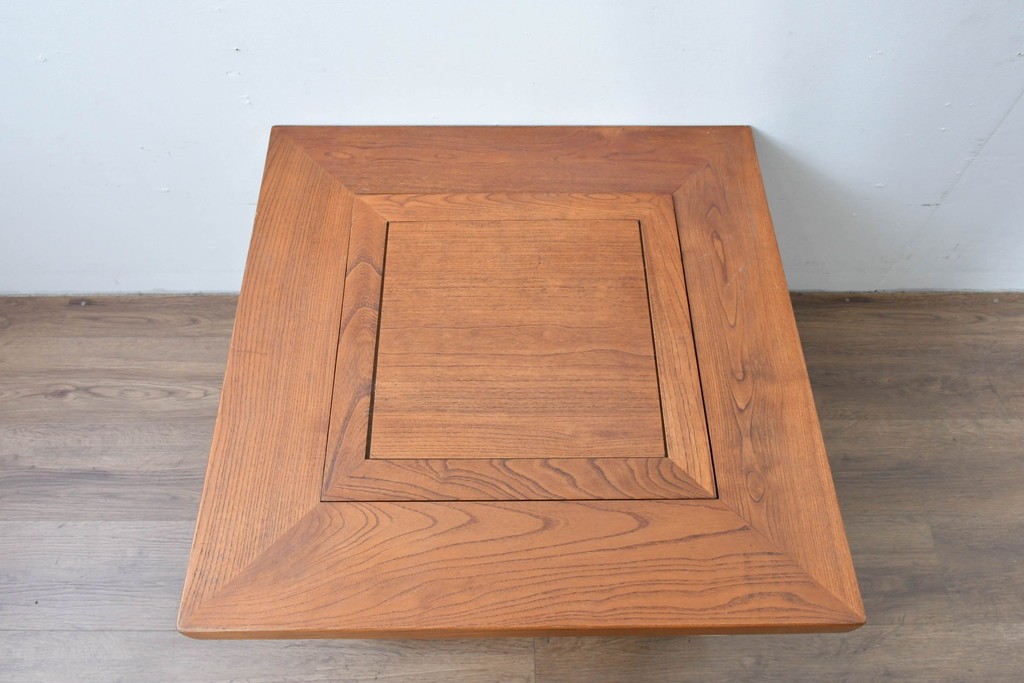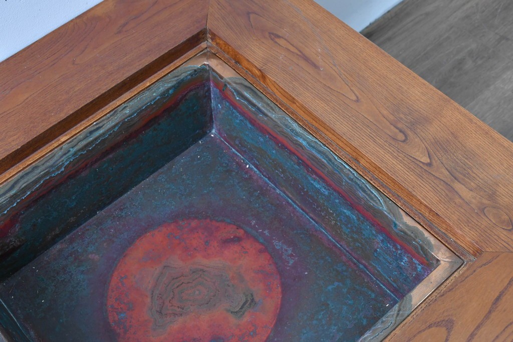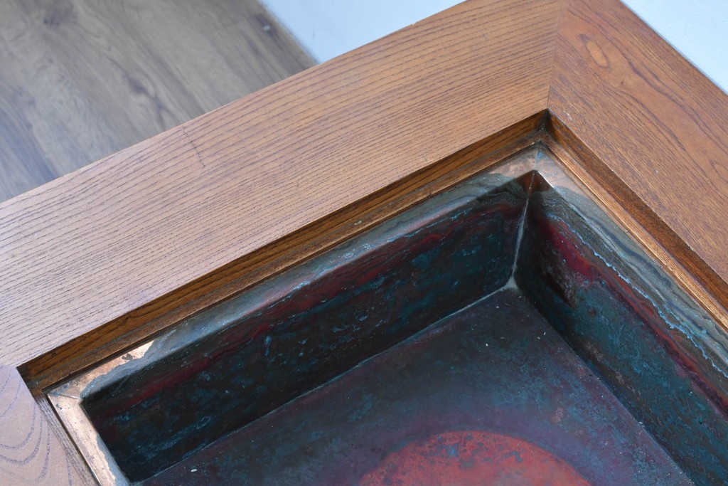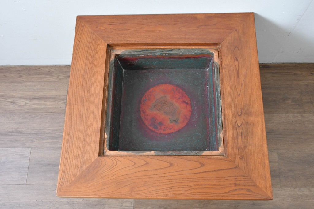 和の趣を感じさせる、囲炉裏テーブルです。中央には金属製の火鉢が収められ、古き良き団らんの情景がよみがえります。下部には小引き出しが2杯備わり、火箸などの収納にも便利な造りです。重厚な木地の風合いと丁寧な仕口が美しく、現代のインテリアにも自然に馴染む一台です。ディスプレイテーブルやセンターテーブルとしてもおすすめです。