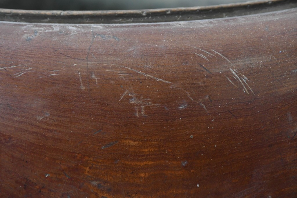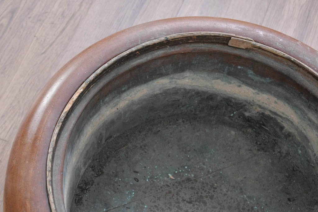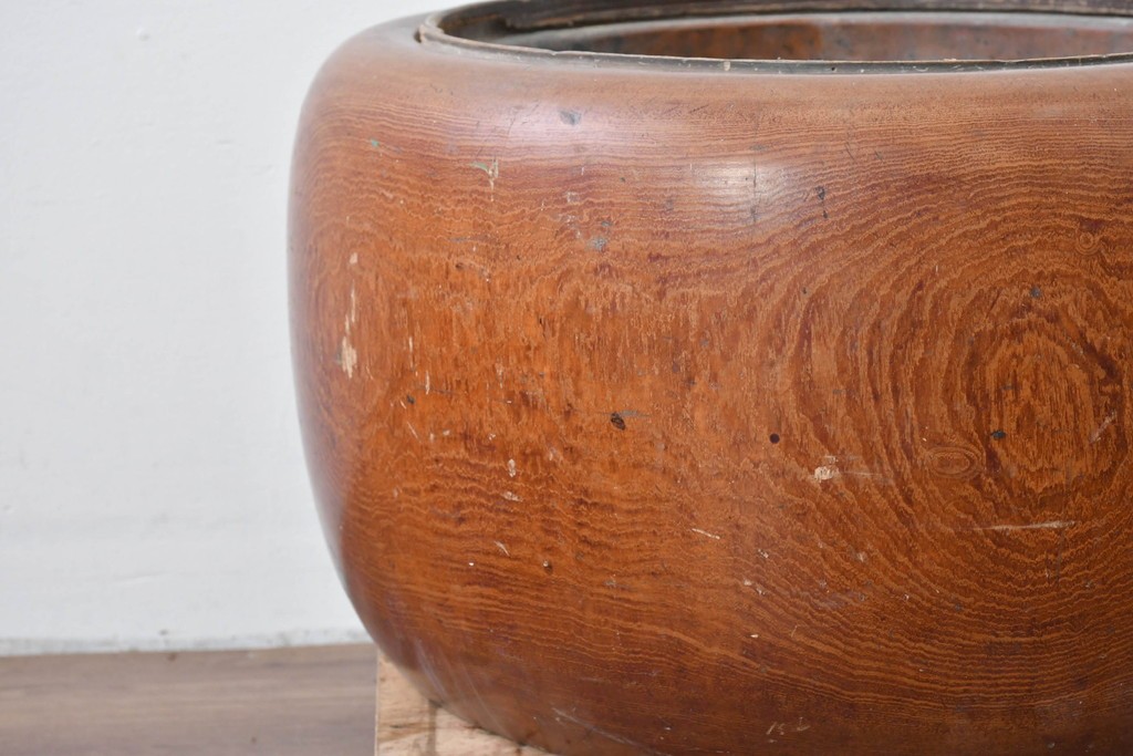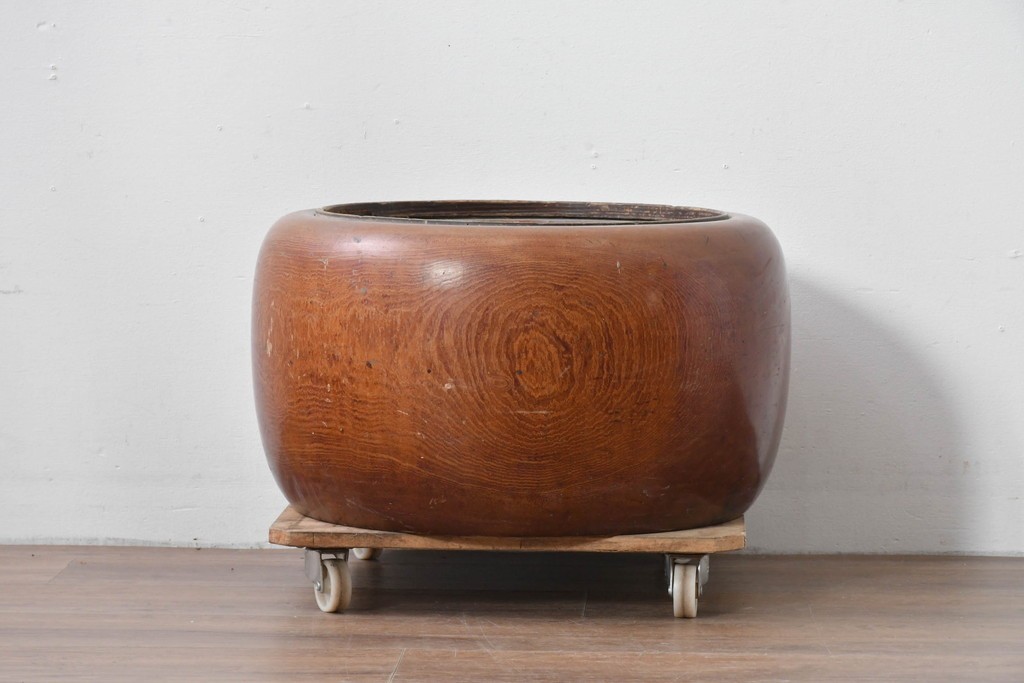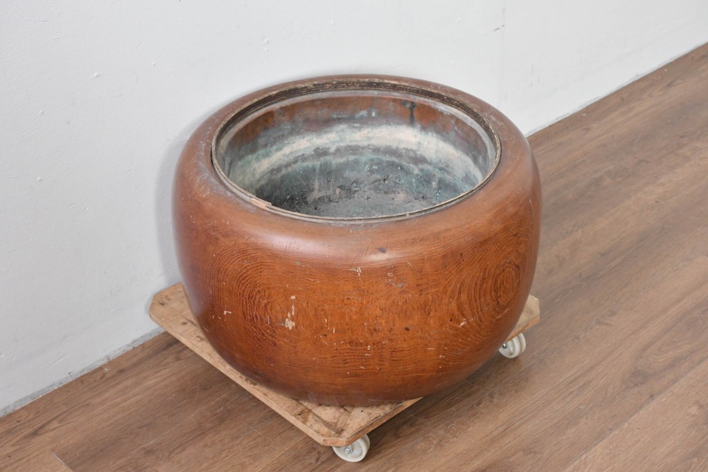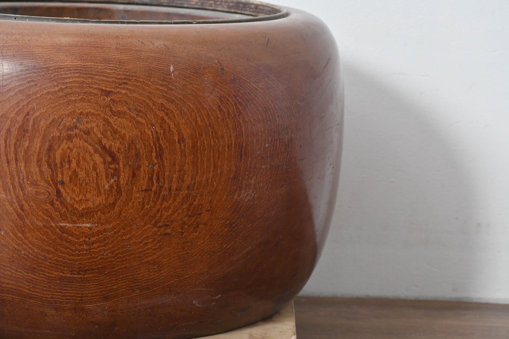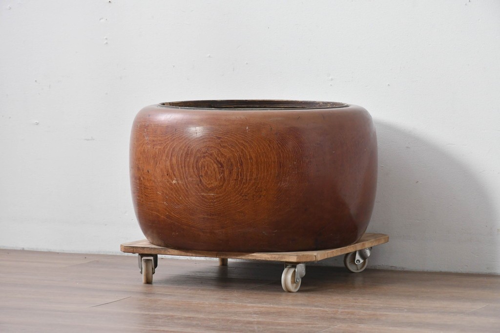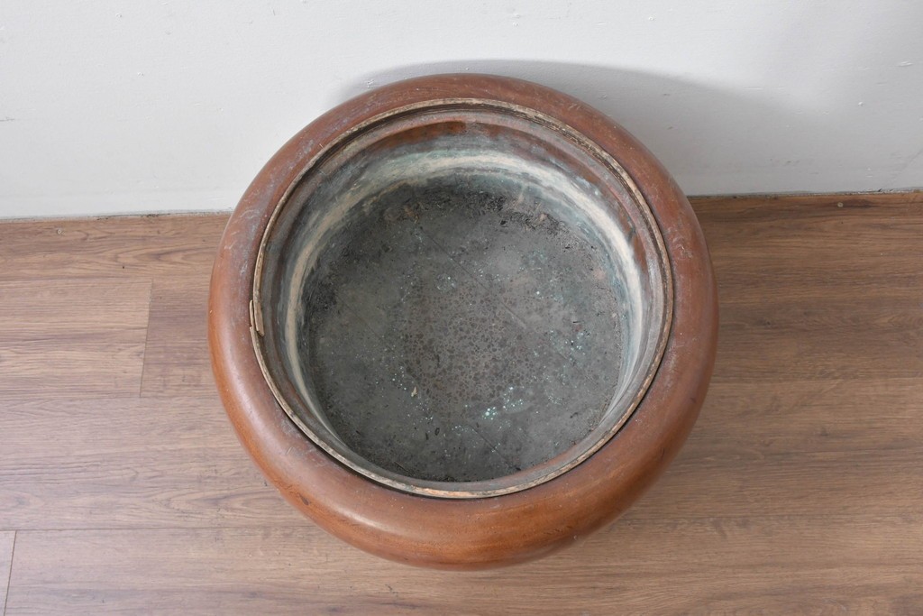 欅(ケヤキ)材をくり抜いてつくられた、温かみのある漆塗りの火鉢です。木目の力強さがよく表れた滑らかな丸みのある造形で、和の道具としての趣が感じられます。明治~大正期のこちらのお品は、長い時間を経てきた風合いが感じられる、アンティークならではの表情が魅力です。花器やインテリアのアクセントとしても取り入れやすく、和室はもちろん、現代の空間に自然に馴染んでくれます。
