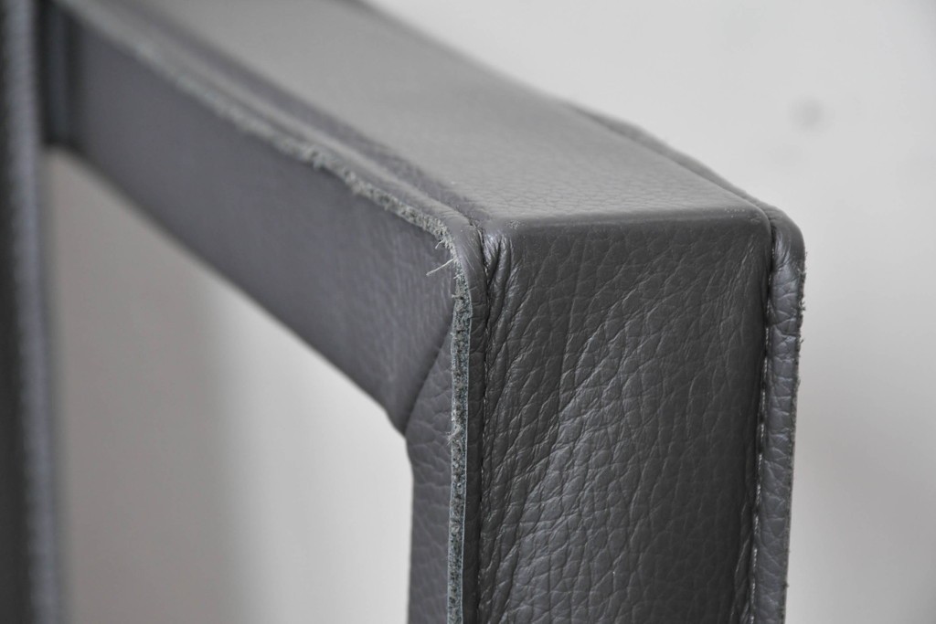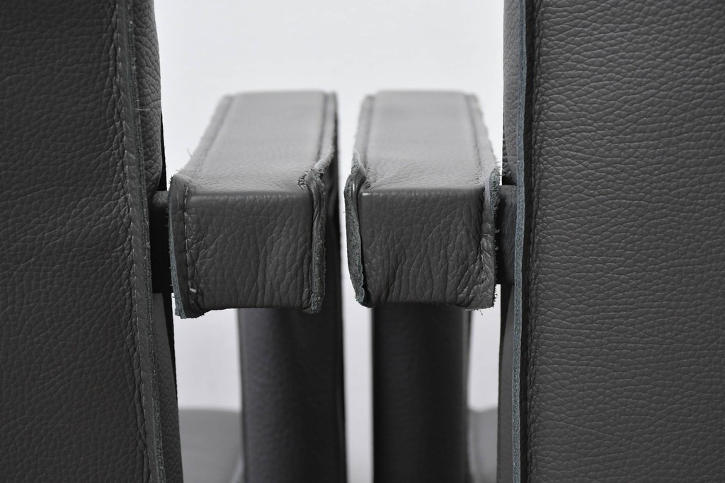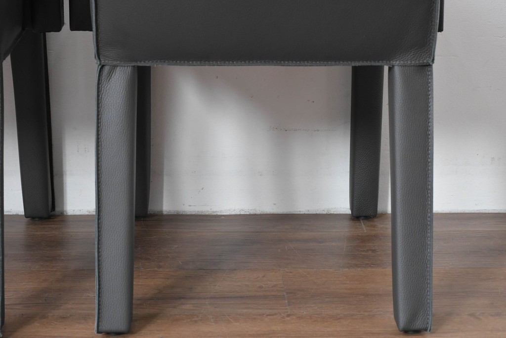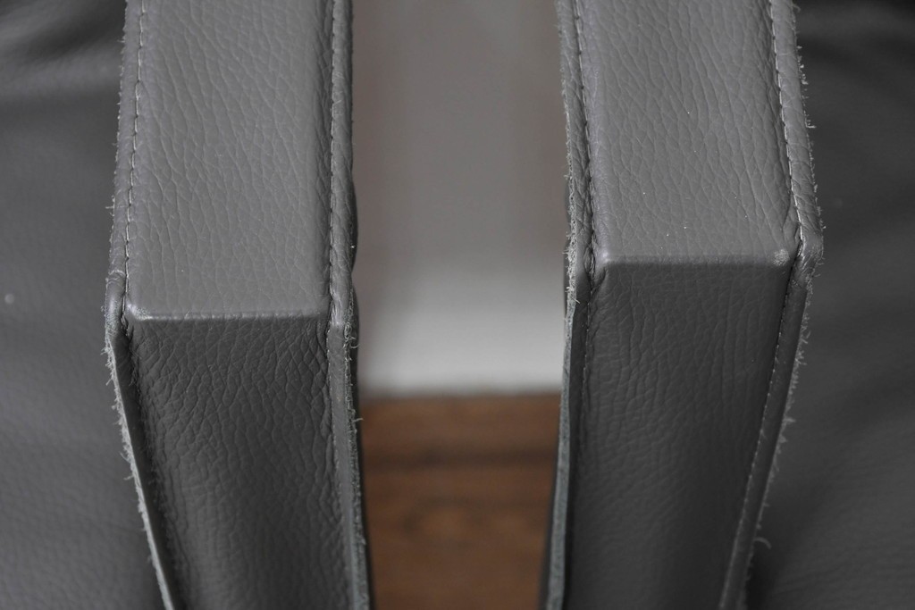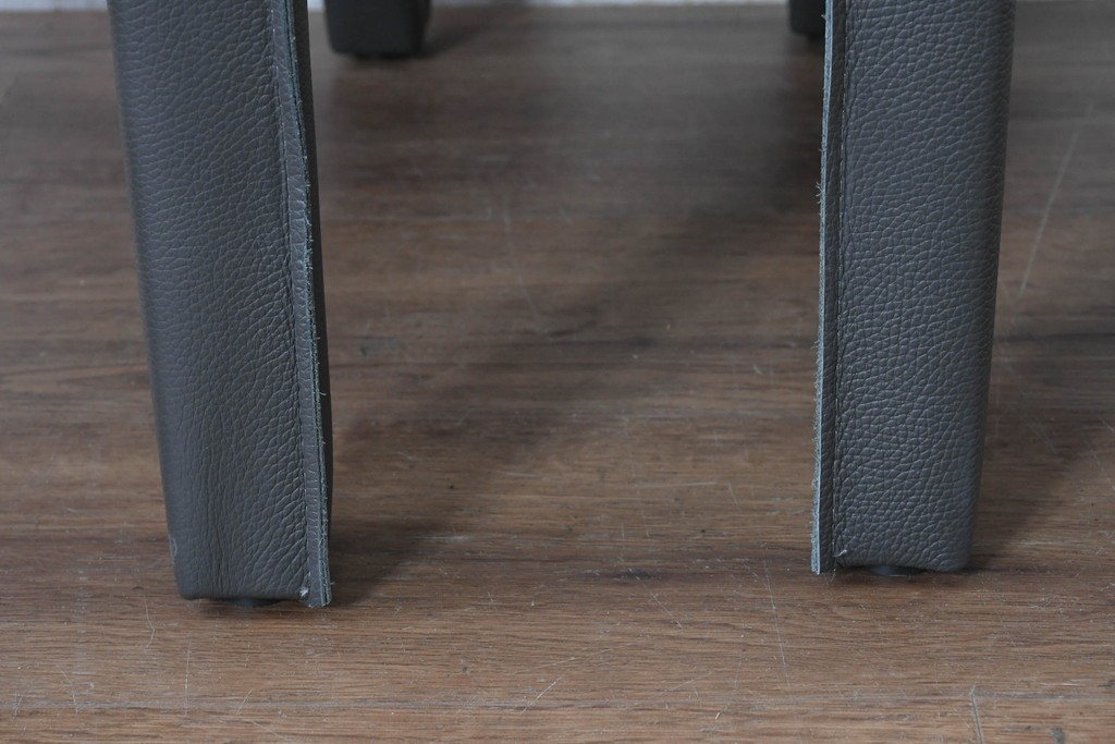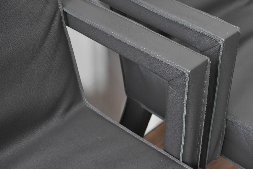 脚部やアームに至るまでレザーで包み込むように張り込まれており、椅子全体に統一された美しい表情を持たせています。面ごとに整えられた縫製ラインは、丁寧な作りの証。ミニマルでありながらも、高級感をしっかりと感じられる作りです。