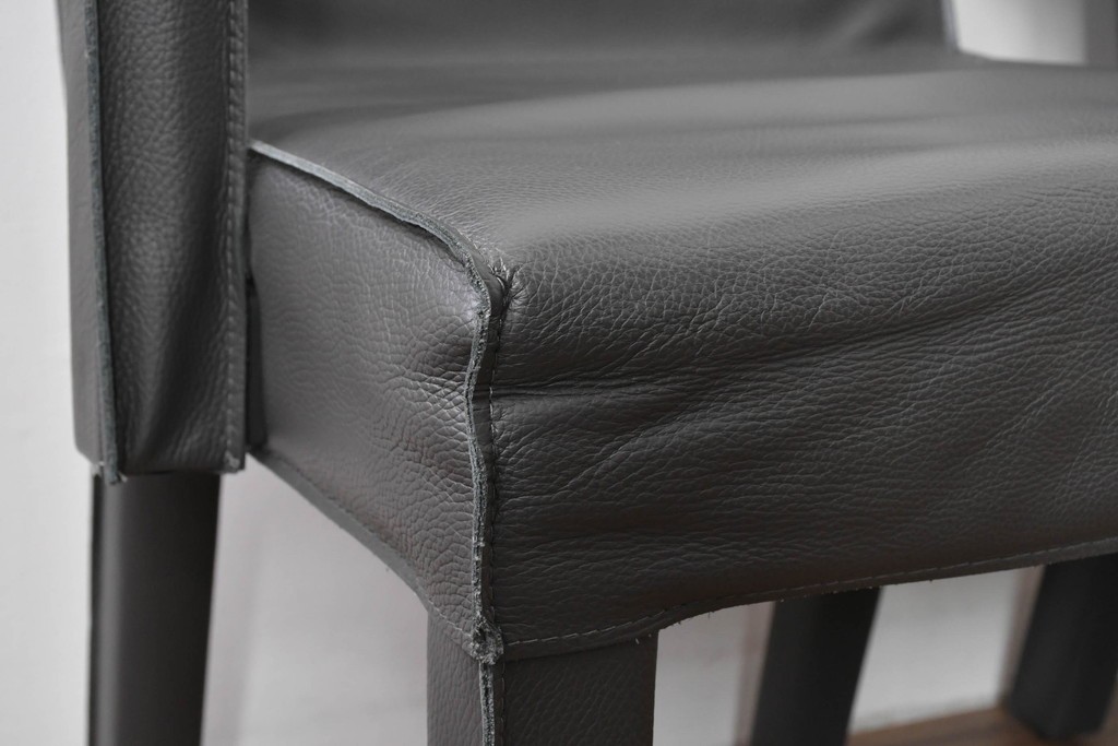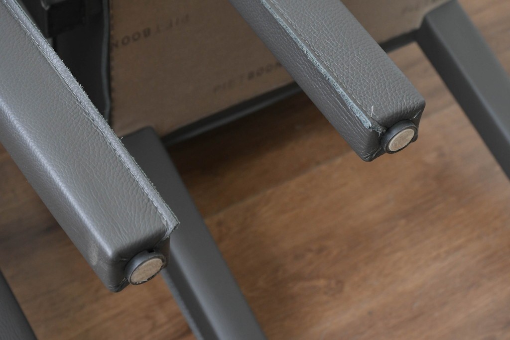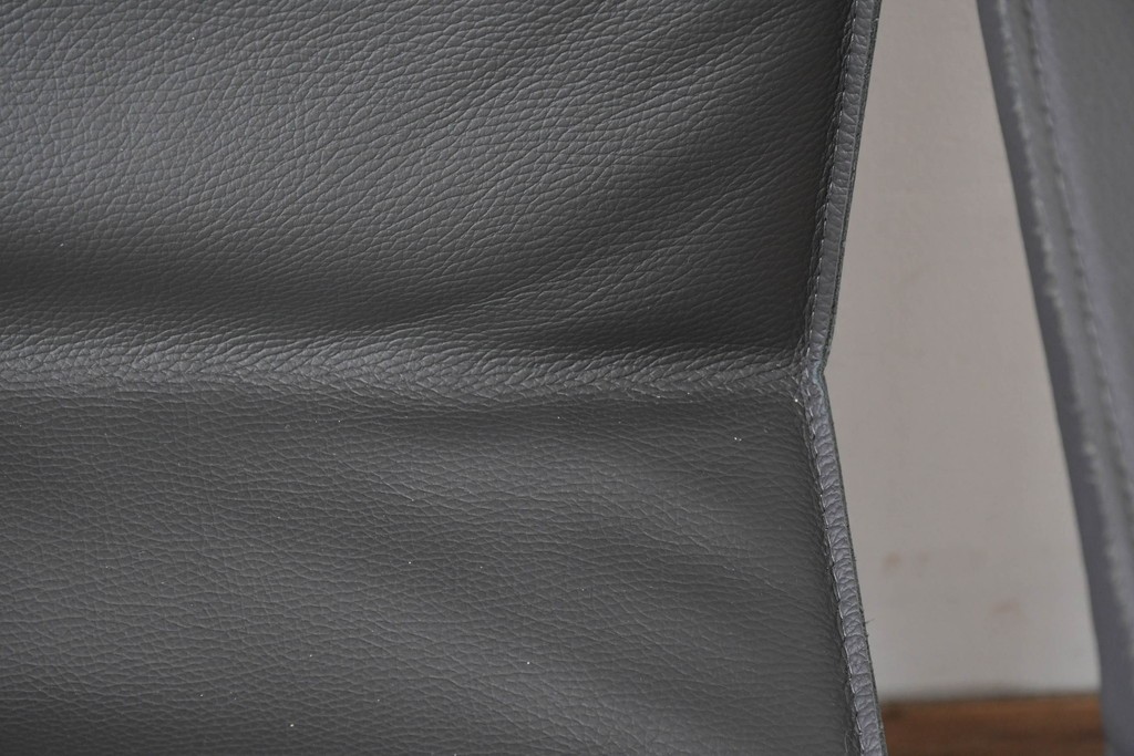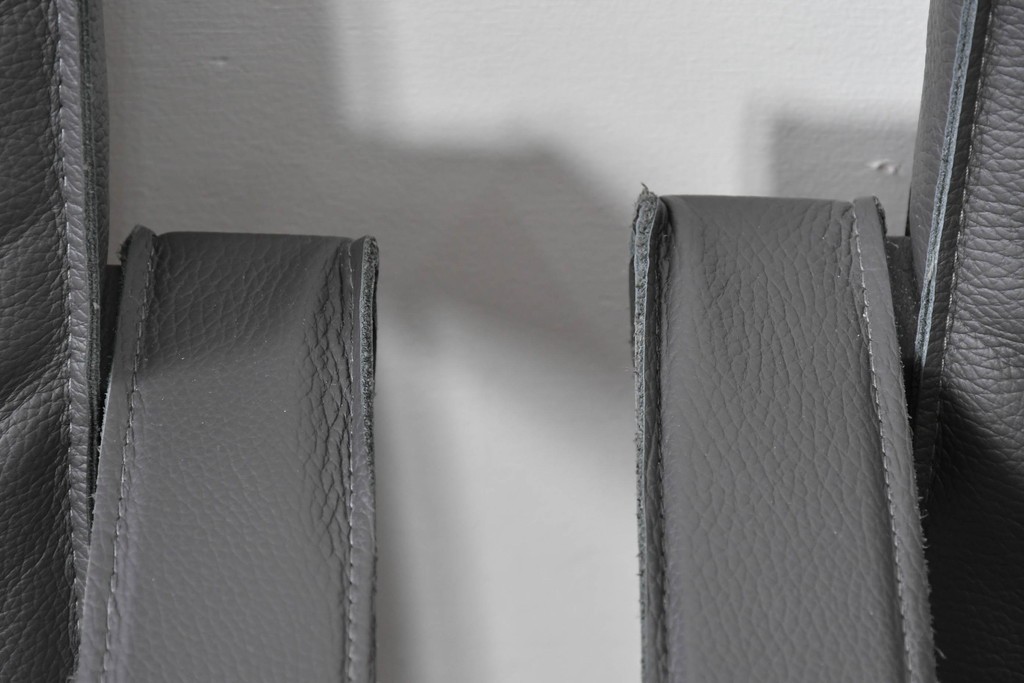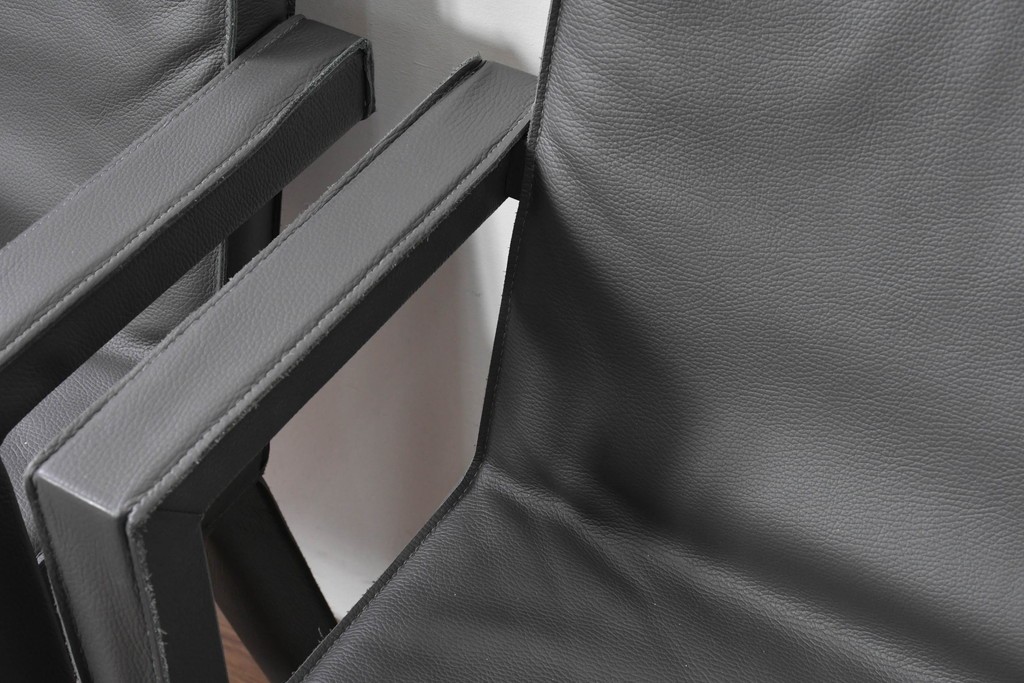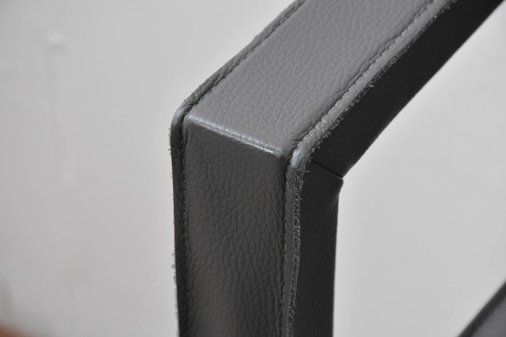 脚部やアームに至るまでレザーで包み込むように張り込まれており、椅子全体に統一された美しい表情を持たせています。面ごとに整えられた縫製ラインは、丁寧な作りの証。ミニマルでありながらも、高級感をしっかりと感じられる作りです。