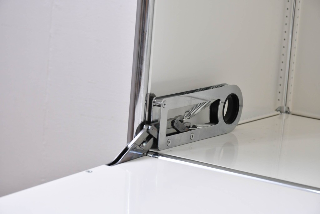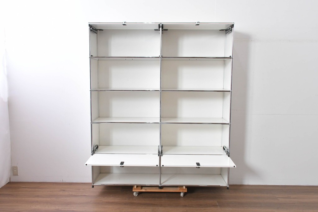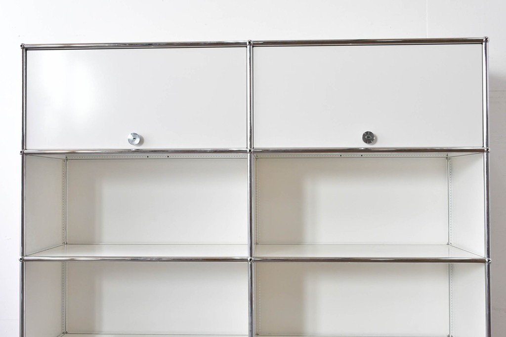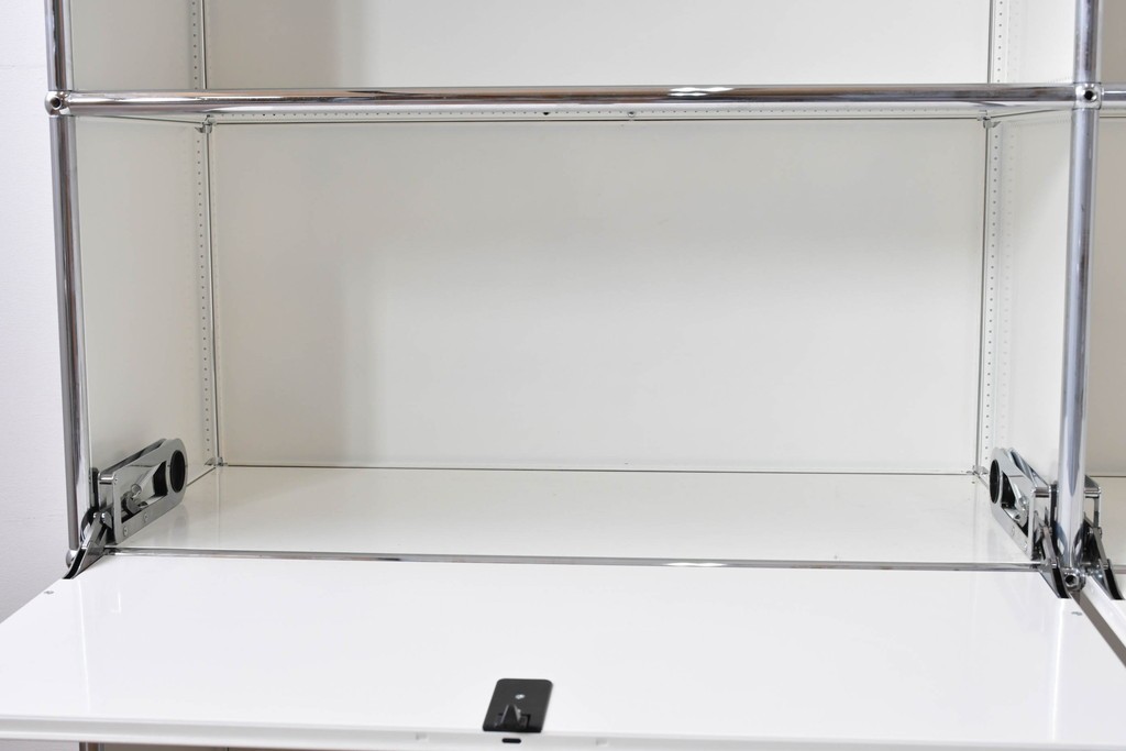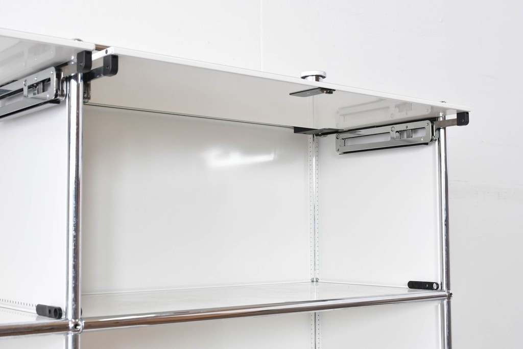 上下に開閉式のフリップアップ/ドロップダウンドアを備えた5段構成で、見せる収納と隠す収納を上手に使い分けできます。見た目の美しさと実用性を兼ね備えた、USMらしい完成度の高いシェルフです。