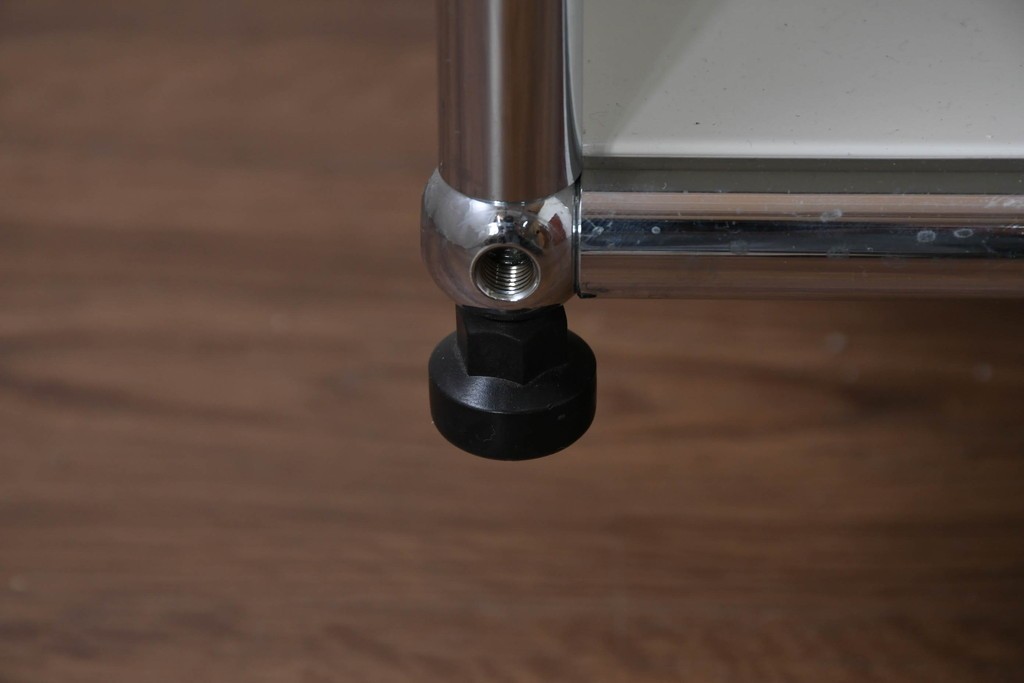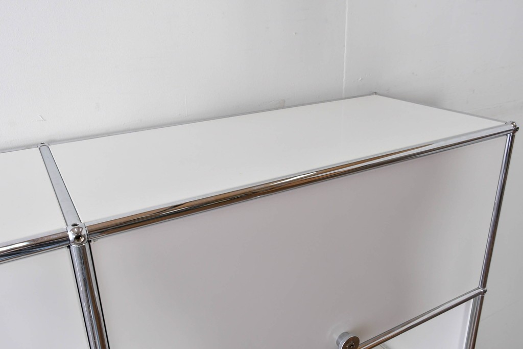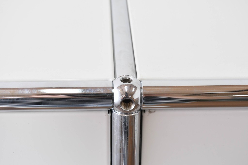 スイスの名作家具USMハラーならではの、スチールパイプとメタルパネルを組み合わせたモジュール構造。堅牢でありながら、自由に拡張や組み換えが可能な設計により、時代を超えて愛され続けるデザインです。