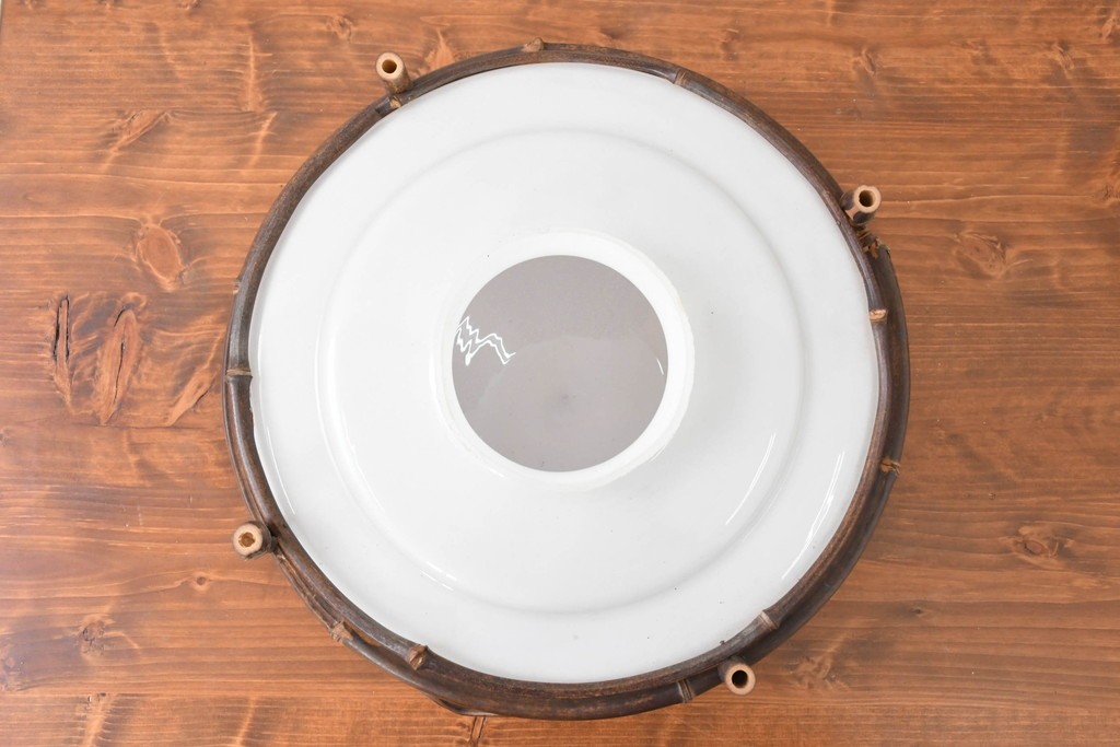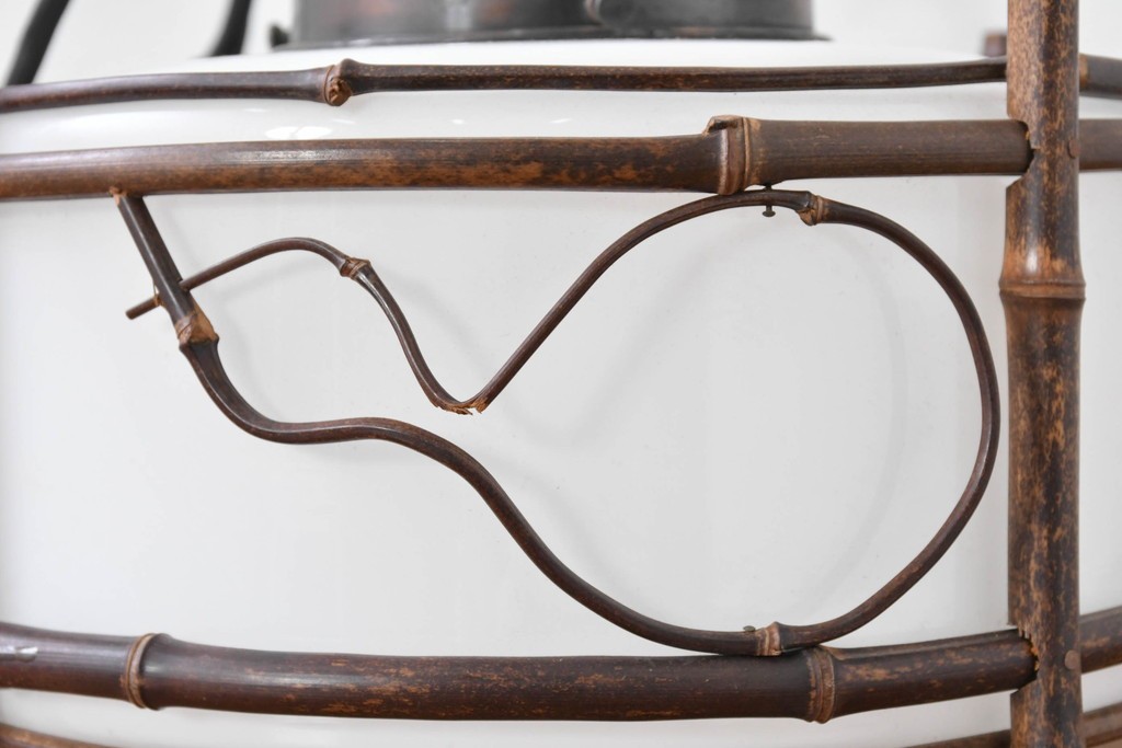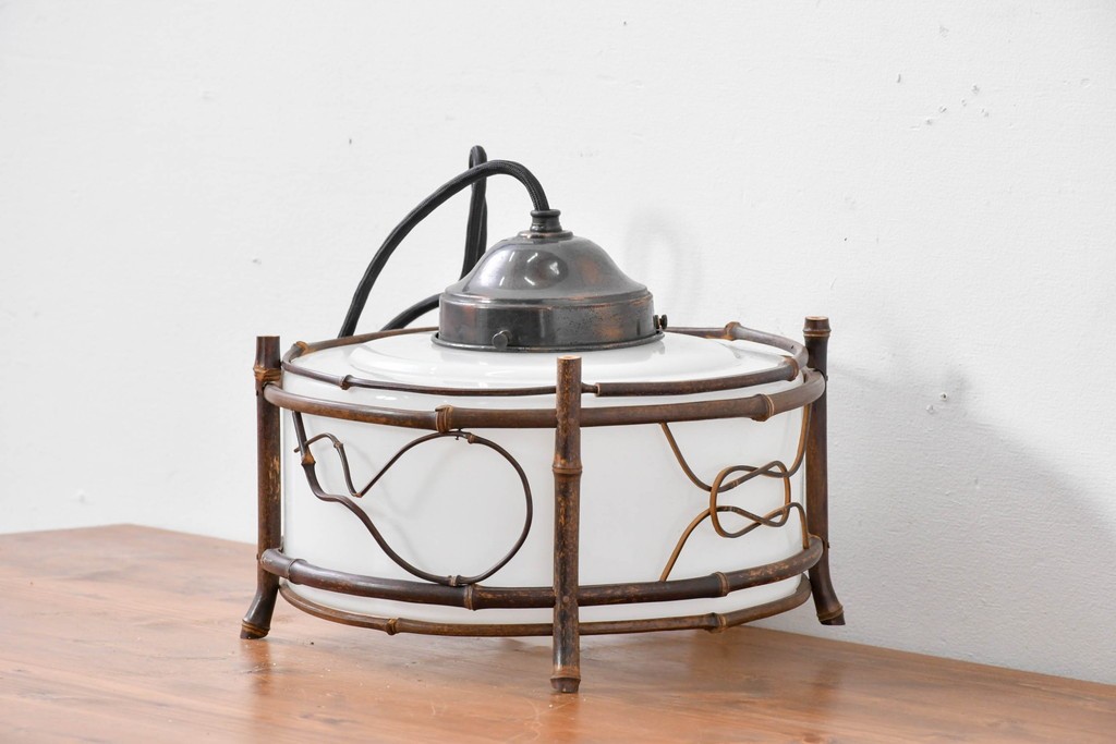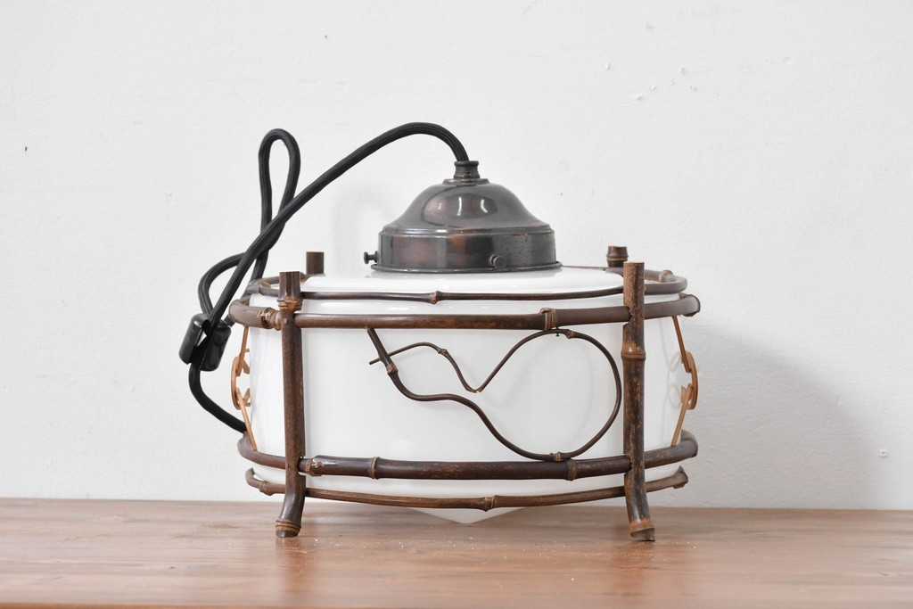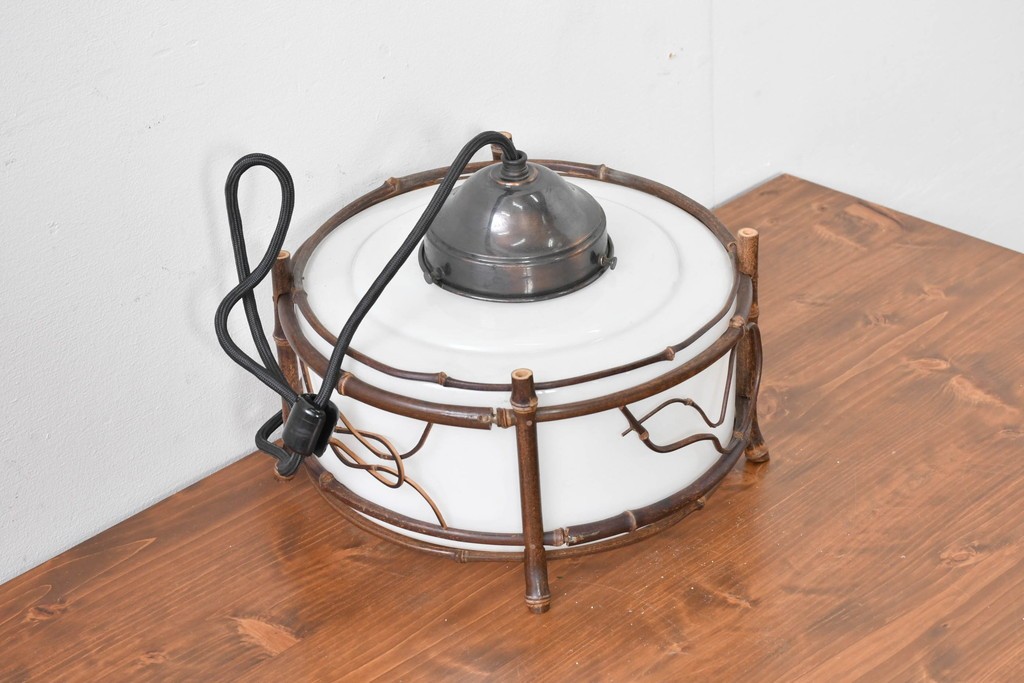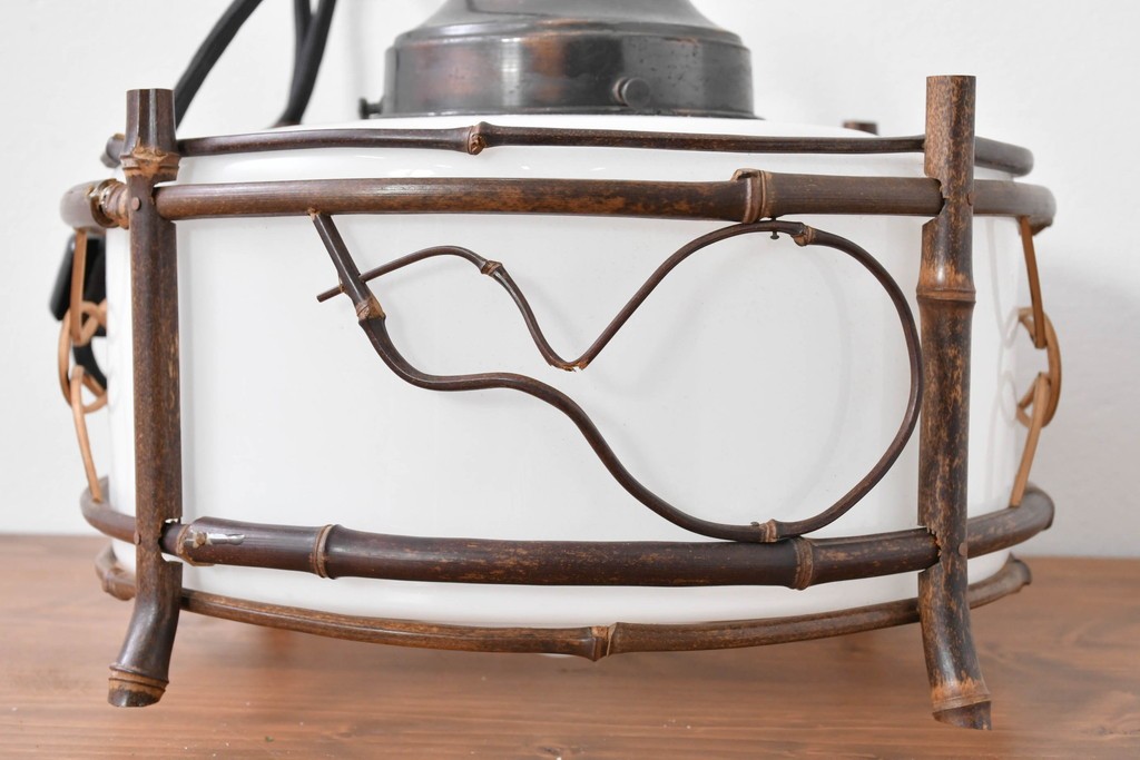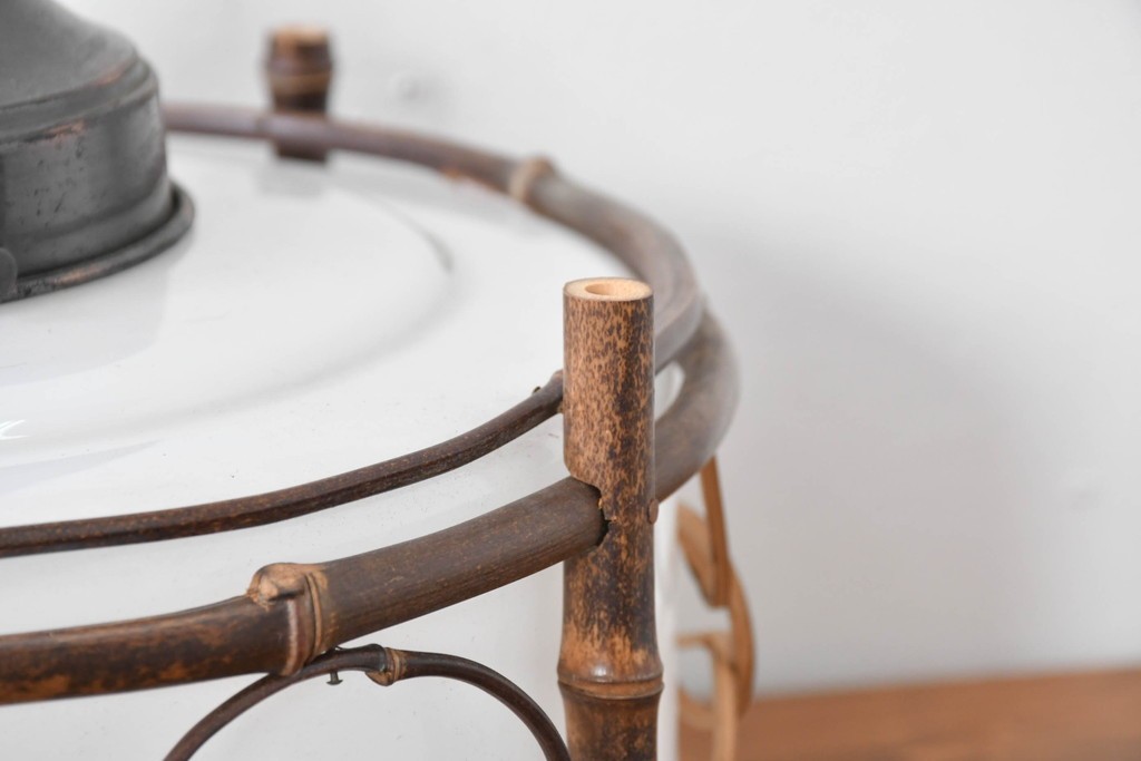 白いガラスシェードを竹細工の枠がやさしく囲み、素朴さの中に温かみのある風合いが宿っています。