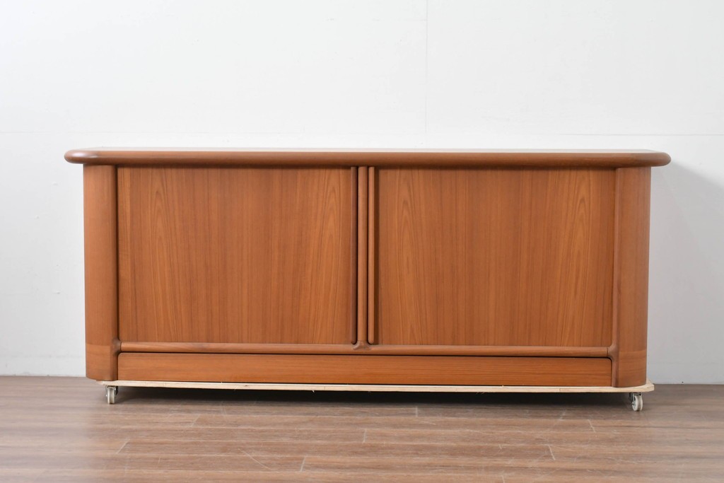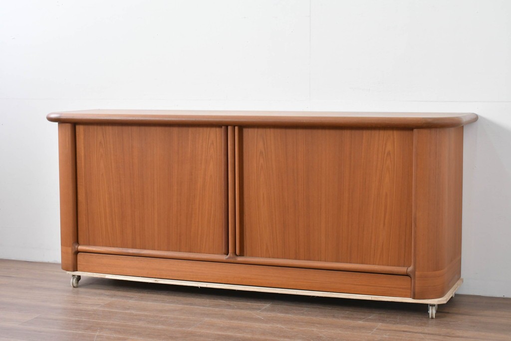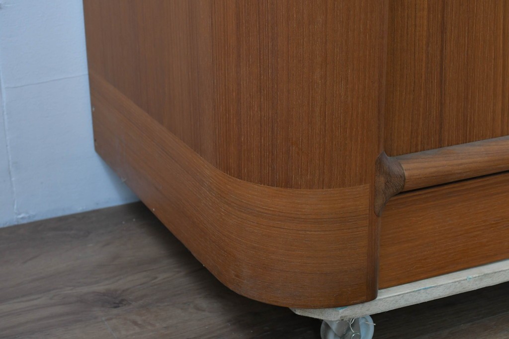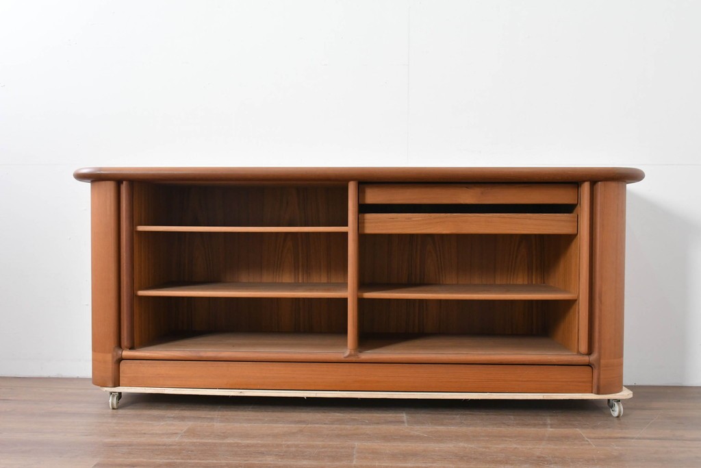 前面にはシャッター式の蛇腹扉を採用しており、扉を大きく開放することができる使い勝手の良さと、角を丸く仕上げた柔らかなフォルムが魅力的な一品です。棚板や内部の木目も整っており、収納家具として完成度の高いサイドボードです。
