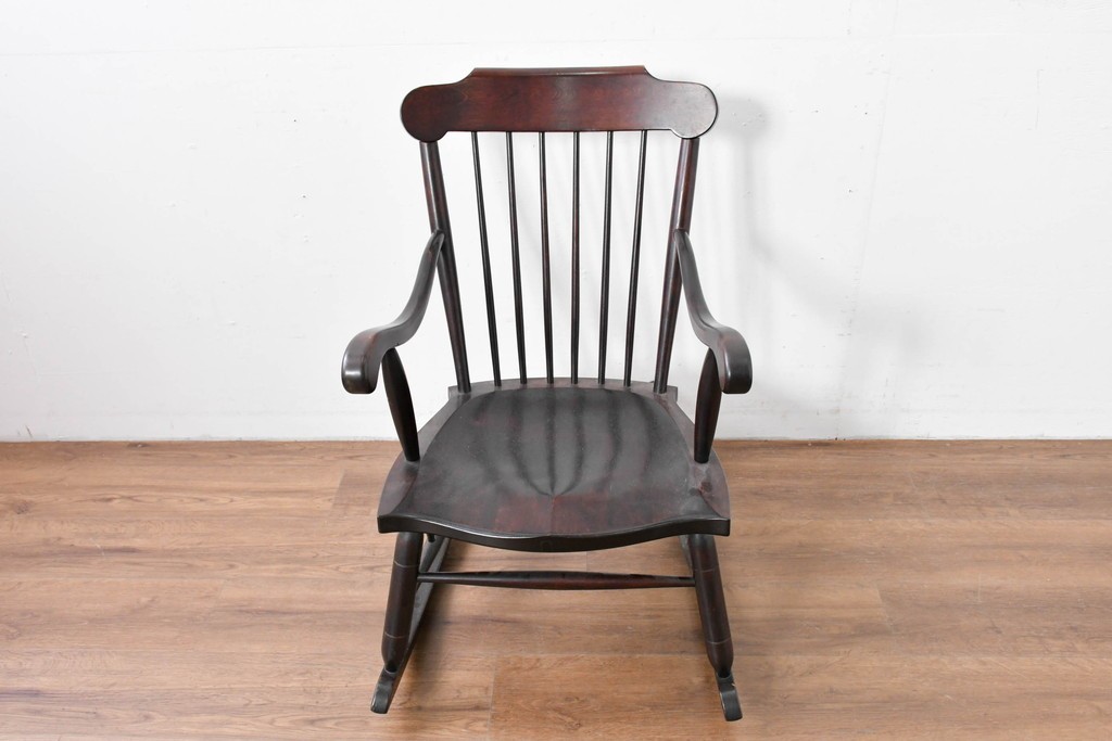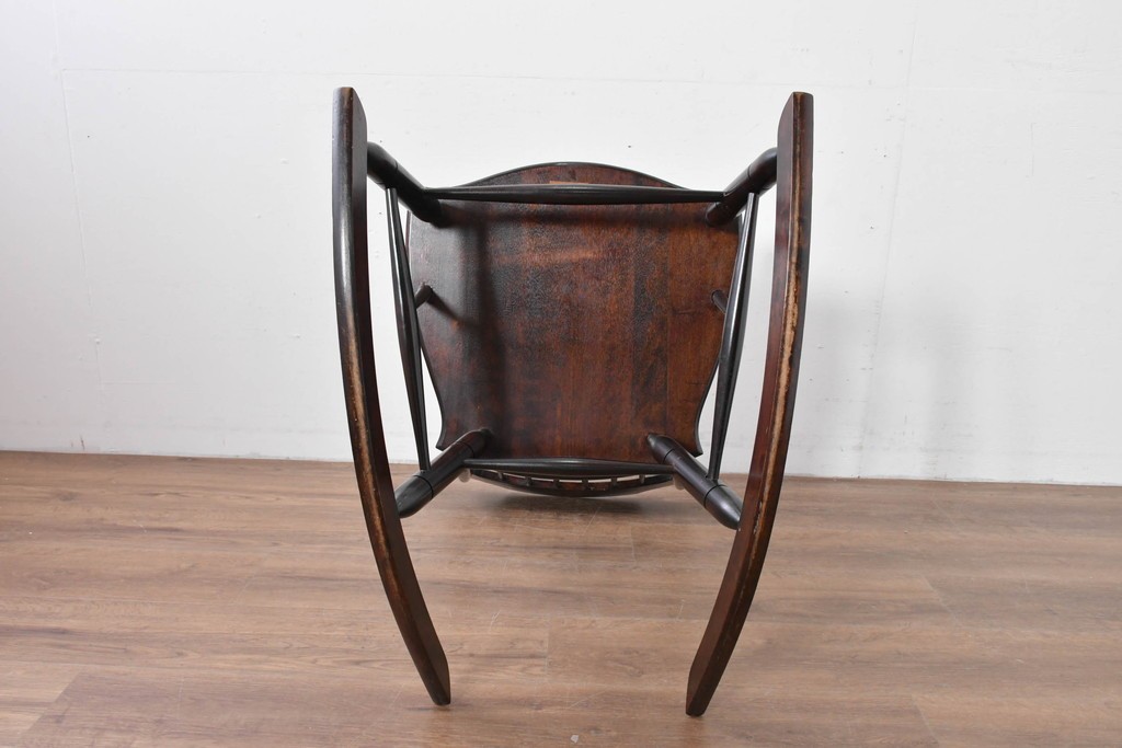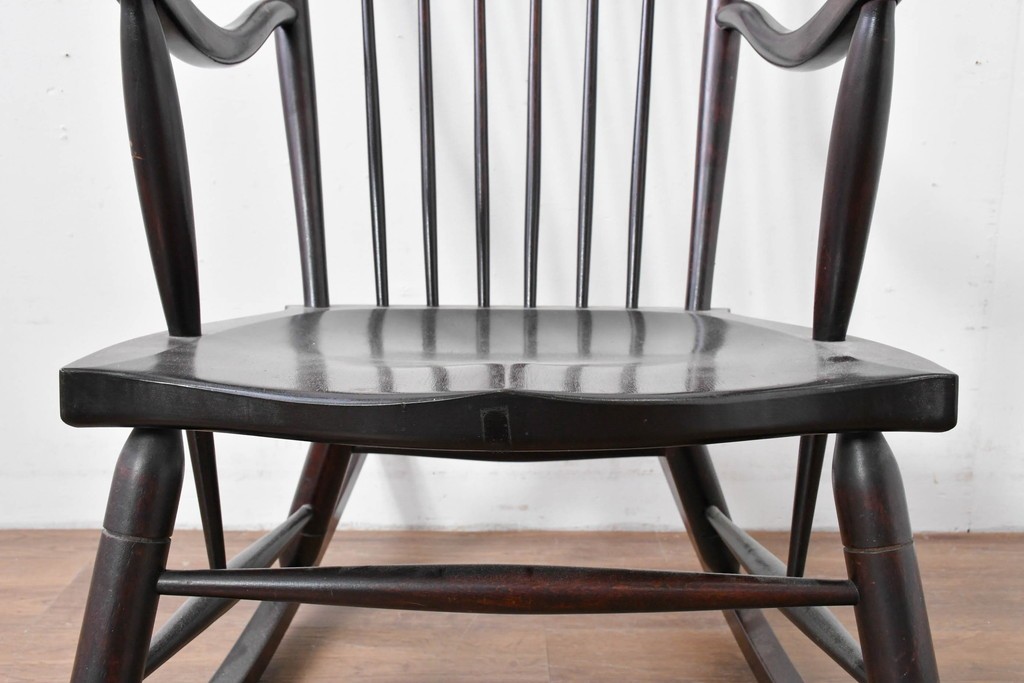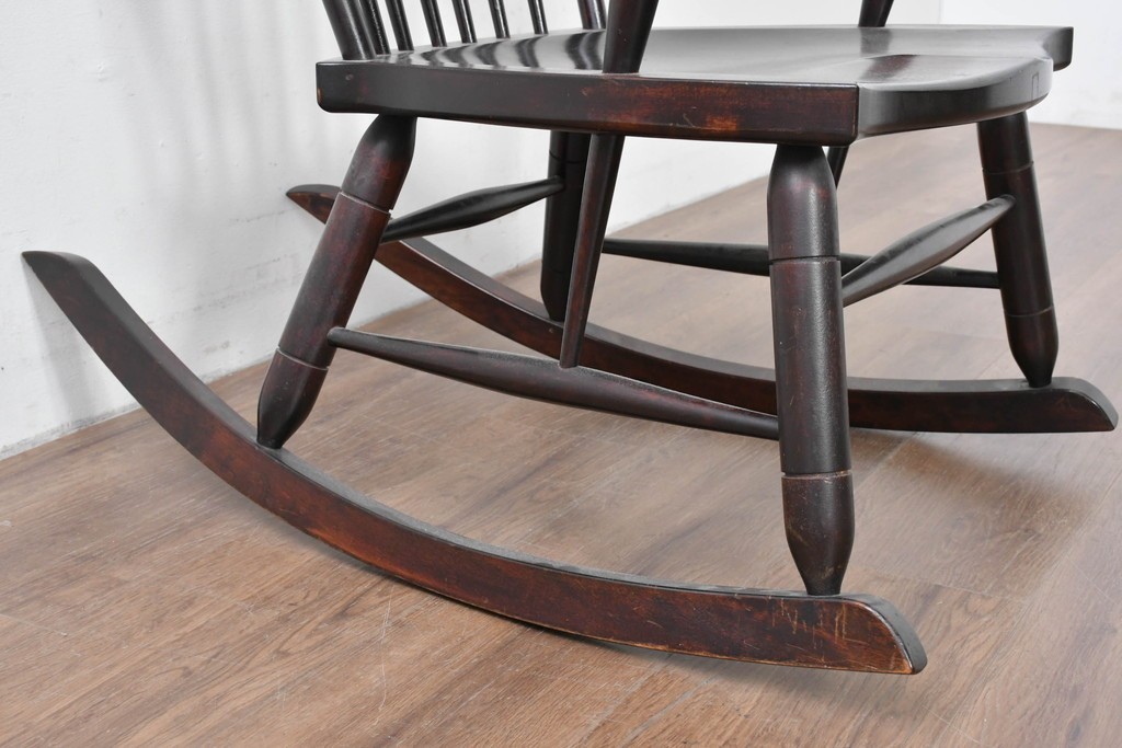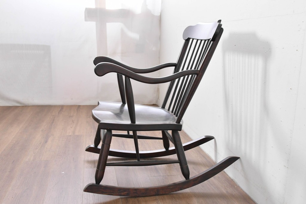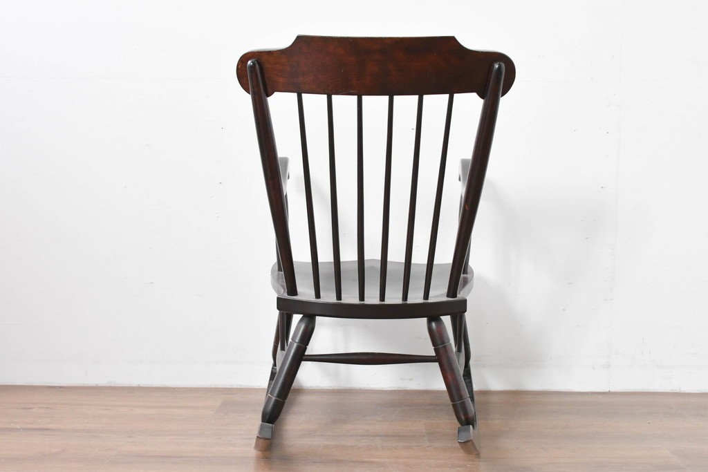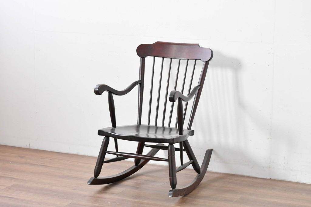 日本の伝統家具ブランド「松本民芸家具」による51B型ロッキングチェアです。堅牢な木材を用い、手仕事で仕上げられた美しい曲線が魅力。背もたれからアームにかけての流れるようなラインや、深みのある色合いが上質な空間を演出します。心地よい揺れと安定感のある座り心地で、リラックスシーンにぴったりの一脚です。