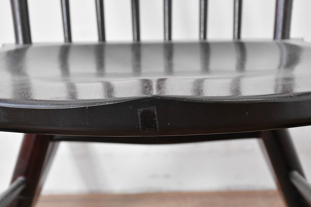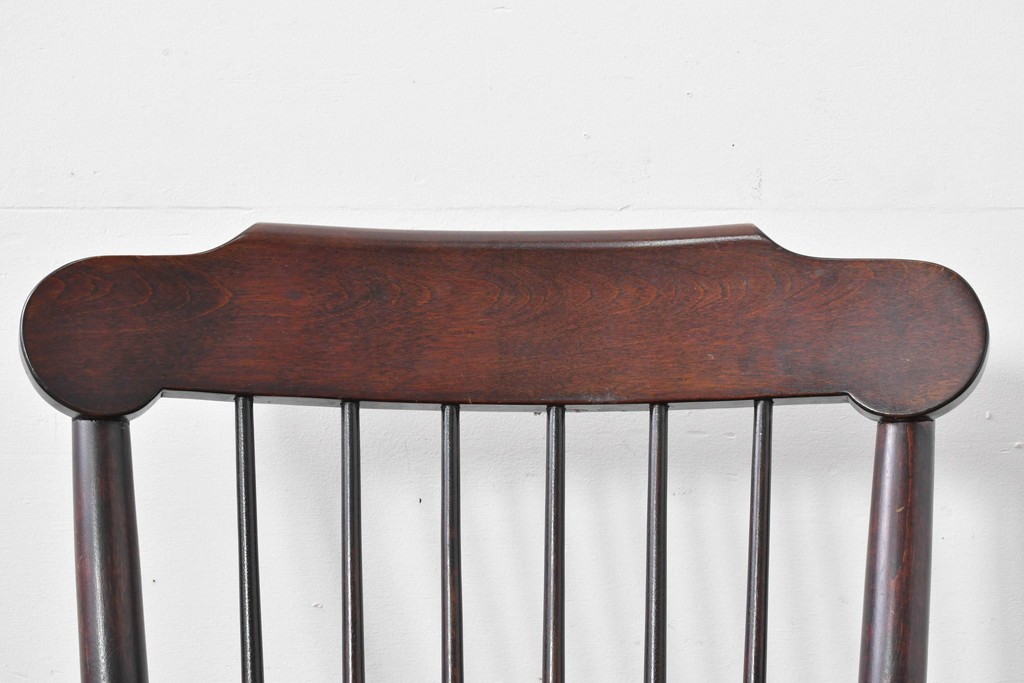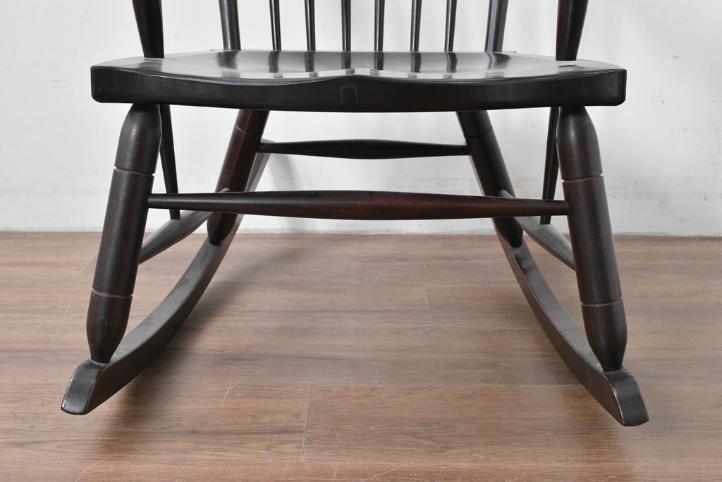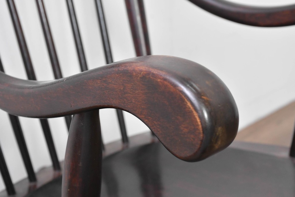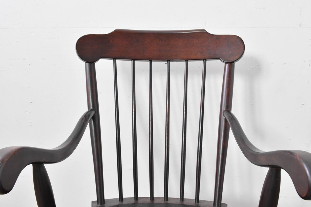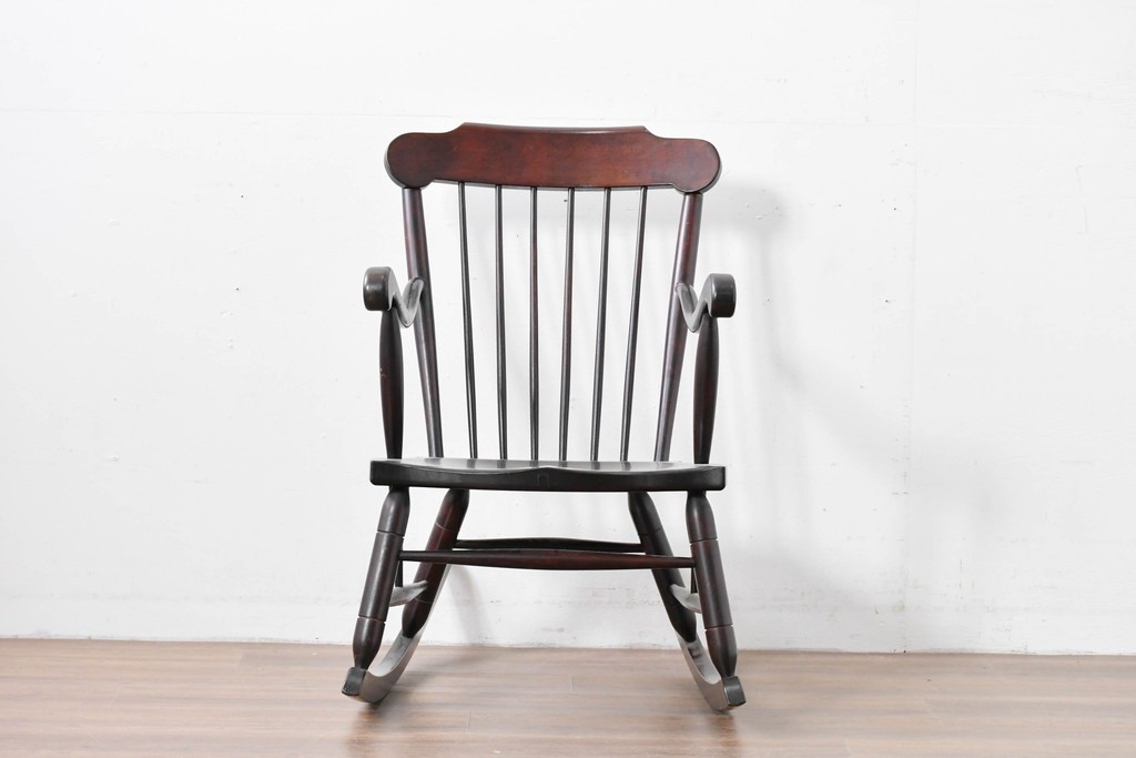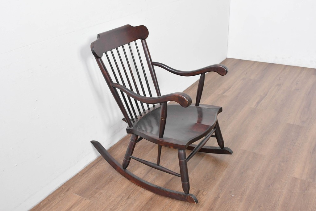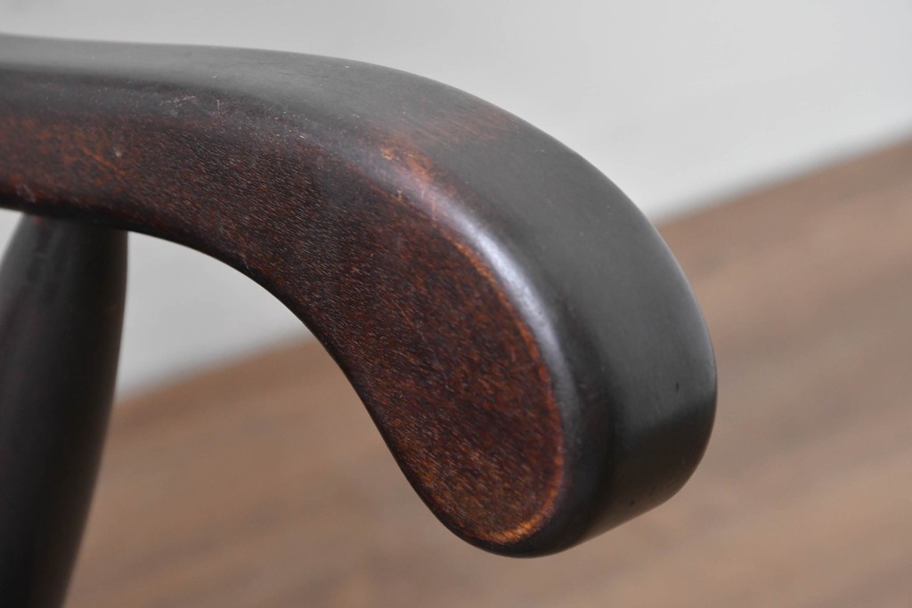 日本の伝統家具ブランド「松本民芸家具」による51B型ロッキングチェアです。堅牢な木材を用い、手仕事で仕上げられた美しい曲線が魅力。背もたれからアームにかけての流れるようなラインや、深みのある色合いが上質な空間を演出します。心地よい揺れと安定感のある座り心地で、リラックスシーンにぴったりの一脚です。