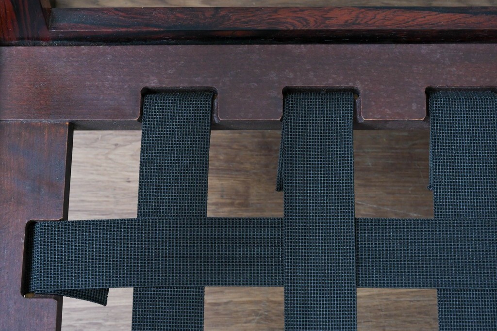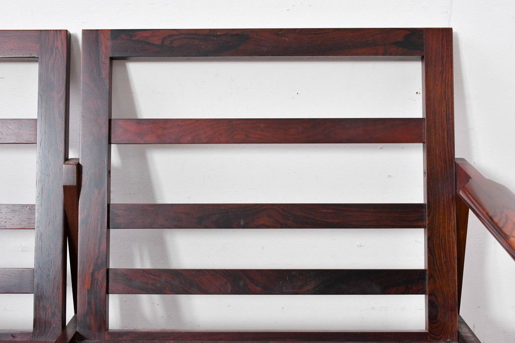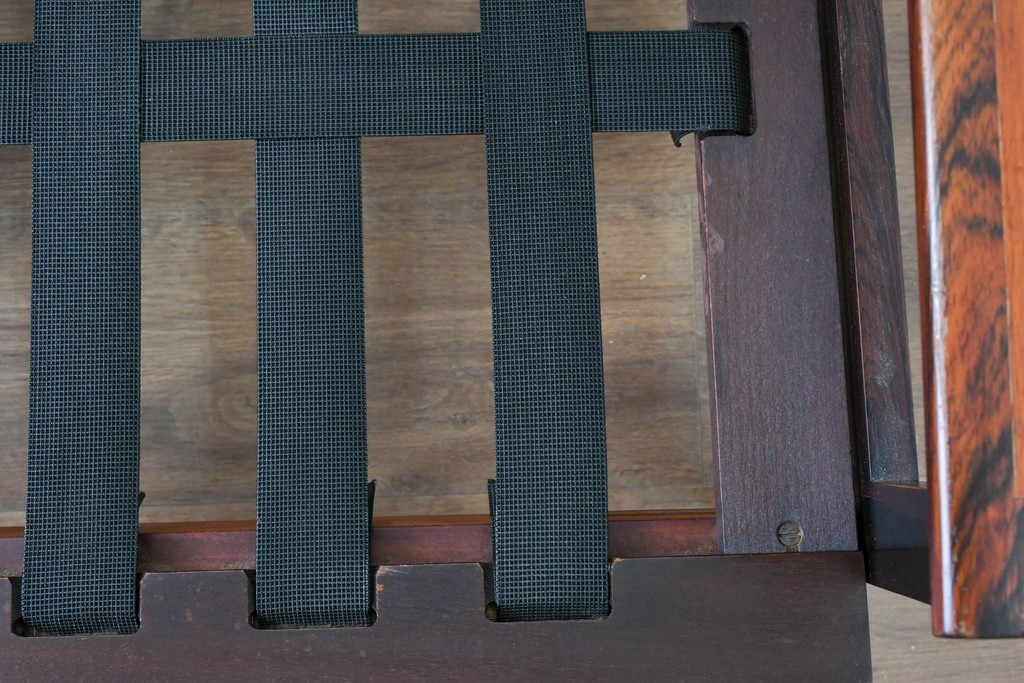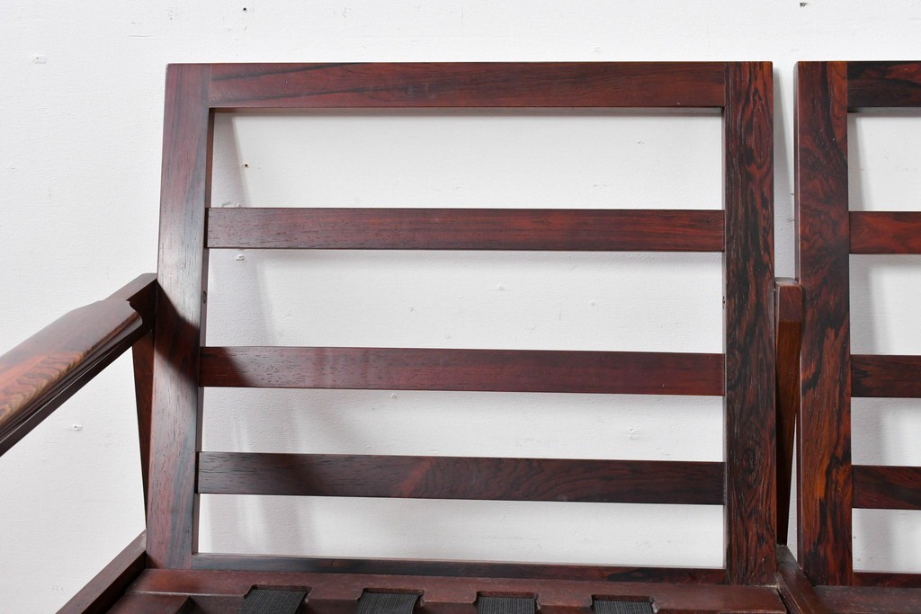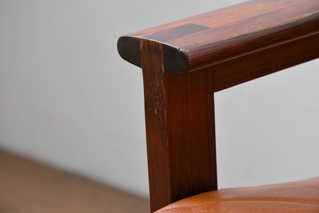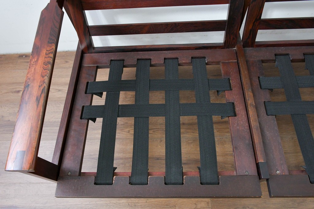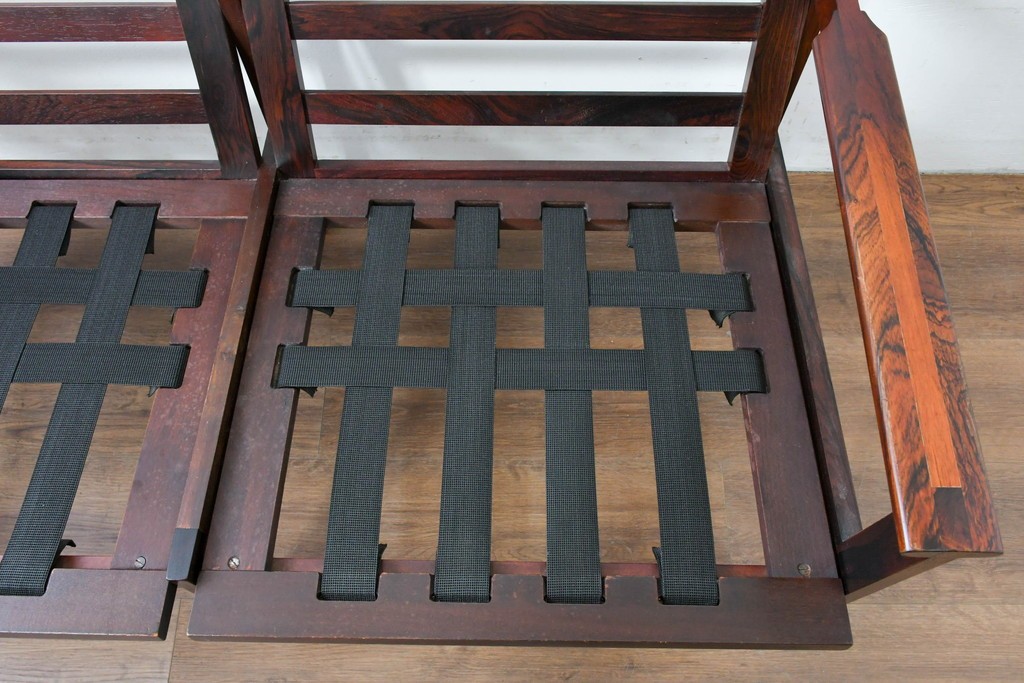 フレームには希少材として知られるローズウッド材が使われ、濃淡のある木目が深い味わいを感じさせます。アーム部分には接合の工夫も見られ、素材本来の質感を活かした丁寧なつくりが印象的です。年月を経たローズウッドならではの艶と色の奥行きが目を引く一品です。