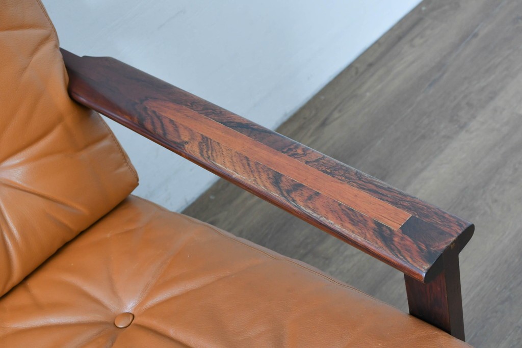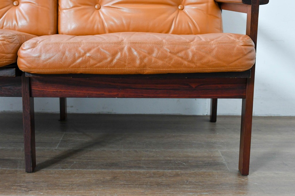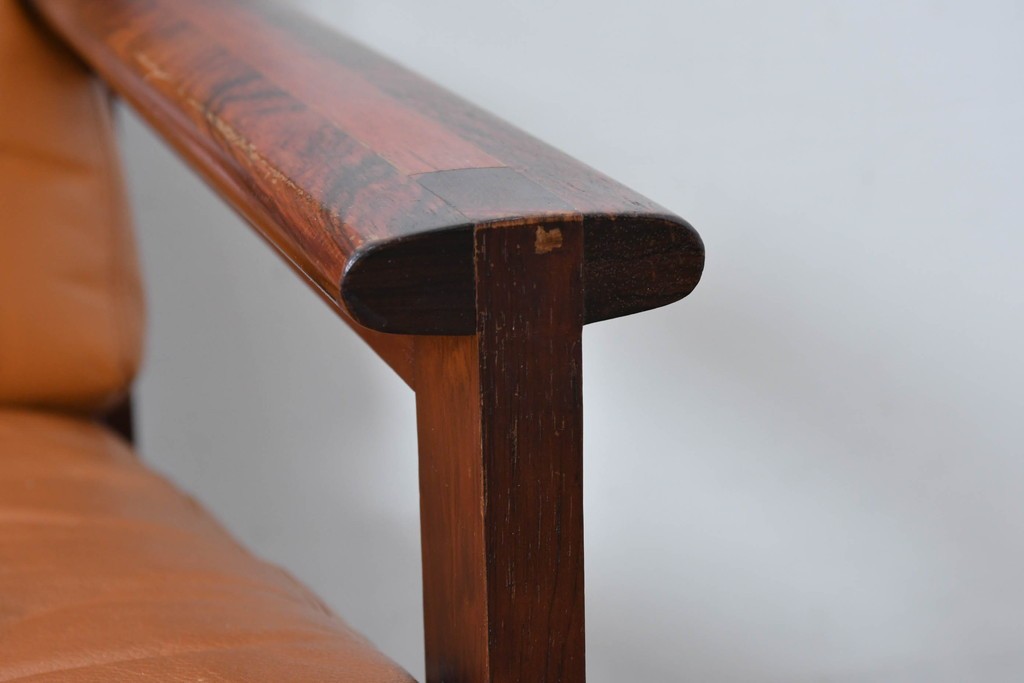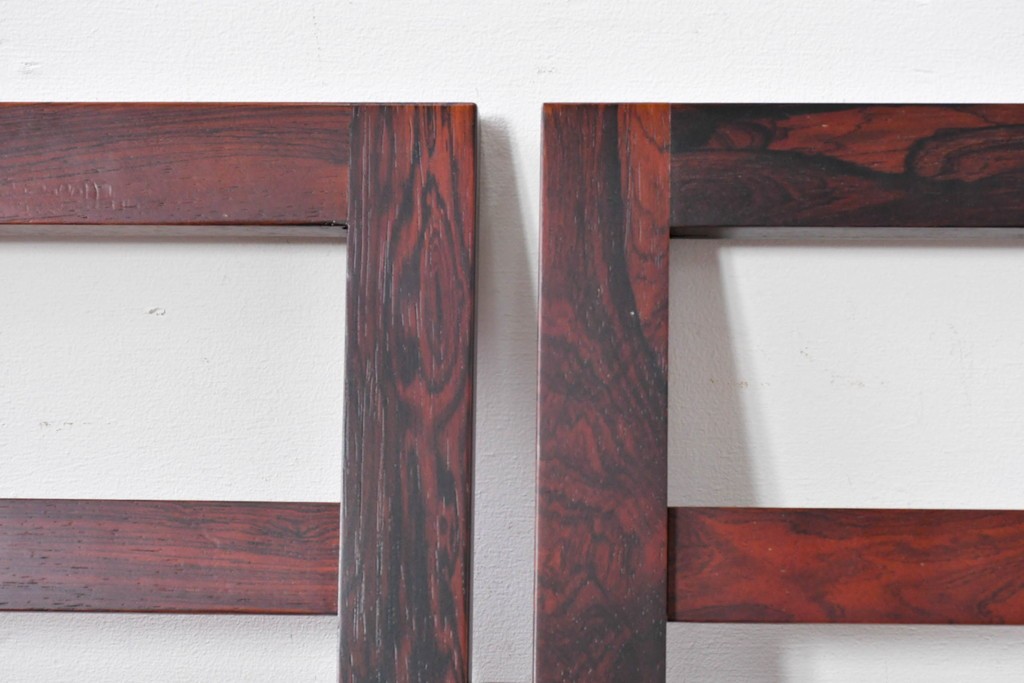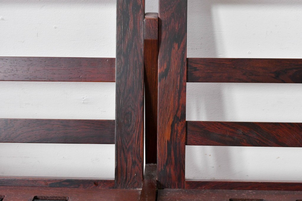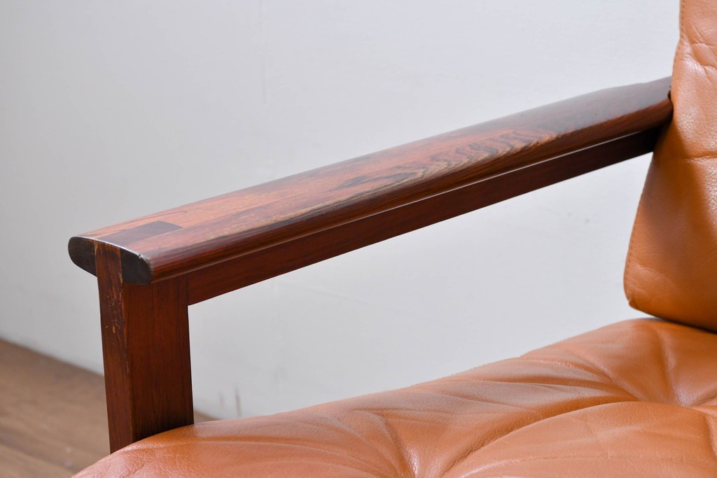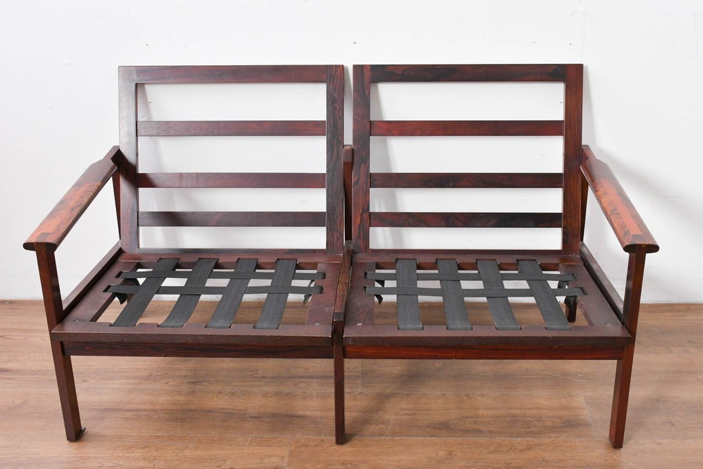 フレームには希少材として知られるローズウッド材が使われ、濃淡のある木目が深い味わいを感じさせます。アーム部分には接合の工夫も見られ、素材本来の質感を活かした丁寧なつくりが印象的です。年月を経たローズウッドならではの艶と色の奥行きが目を引く一品です。