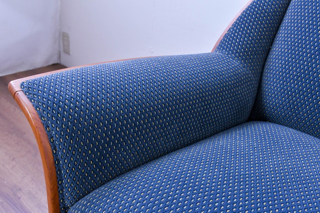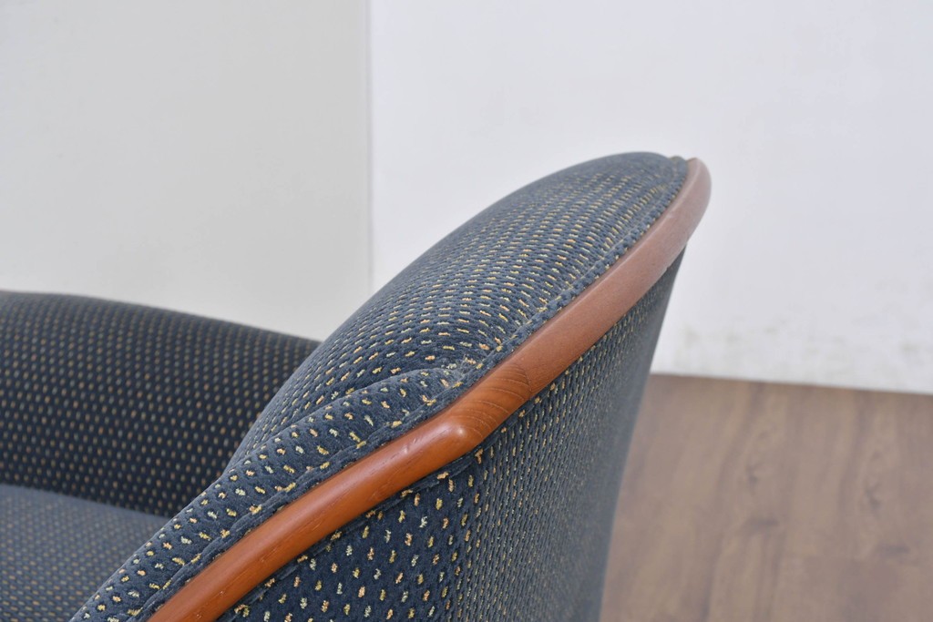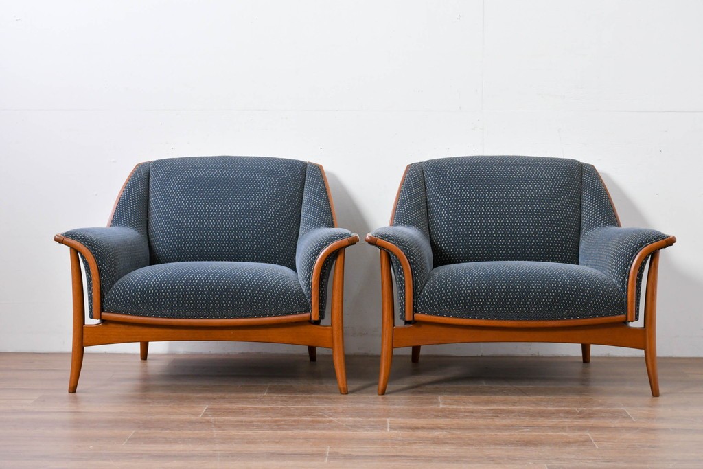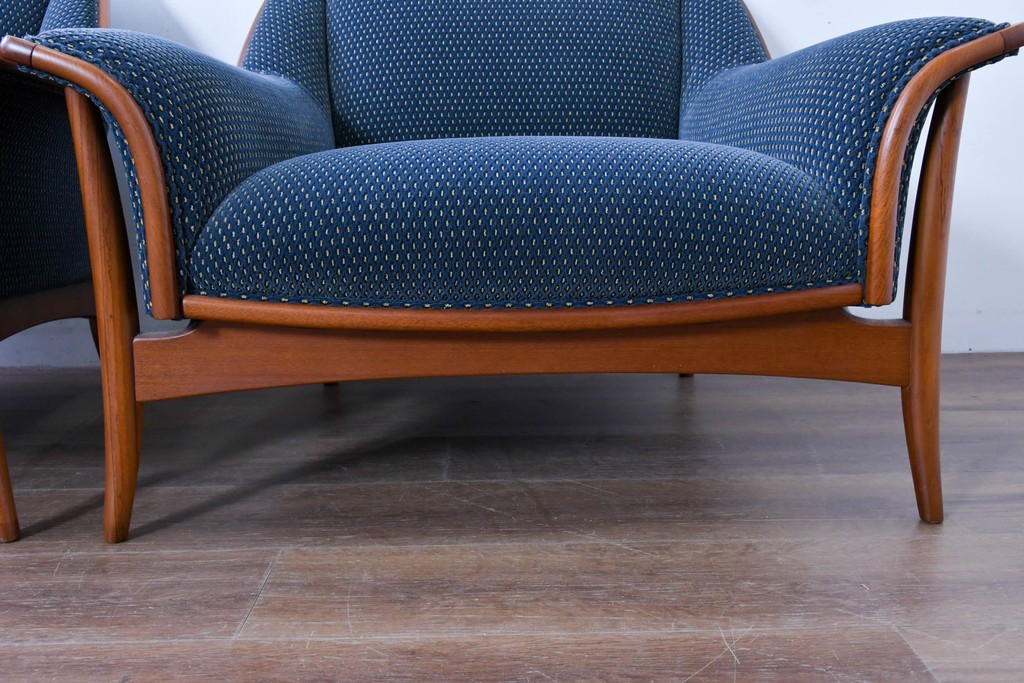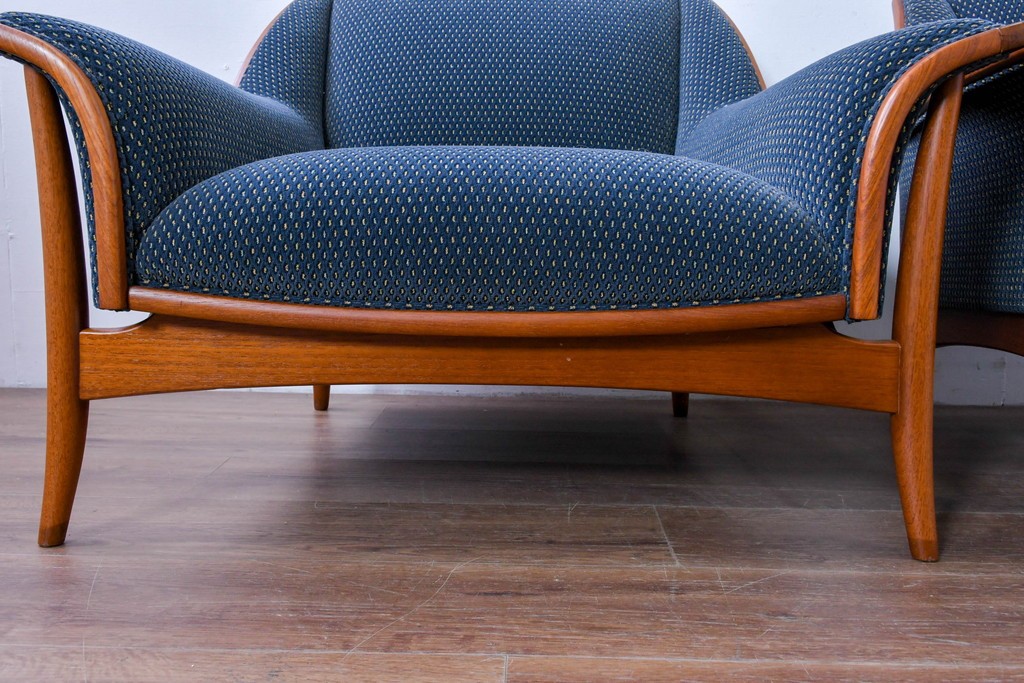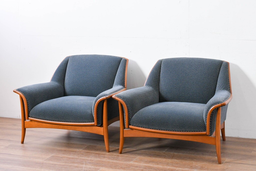 日本を代表する高級家具ブランド、モリシゲ(MORISHIGE)によるレジェシリーズの1Pソファ2脚セットです。優雅な曲線を描く木製フレームと、深みのあるブルーの張り地の組み合わせが上品な印象です。しっかりとした座り心地と包み込まれるような背もたれで、快適なリラックスタイムを演出します。モリシゲらしい丁寧な仕立てと高級感を感じられる一品です。