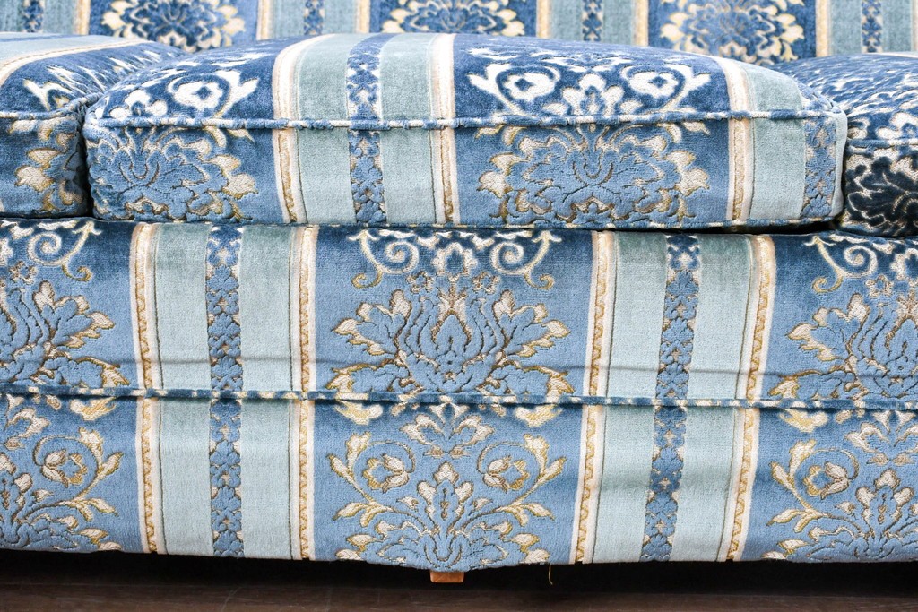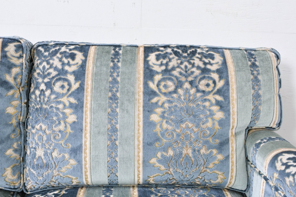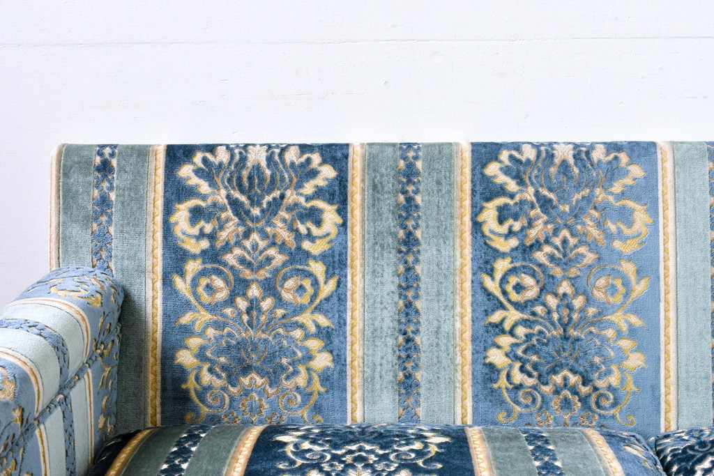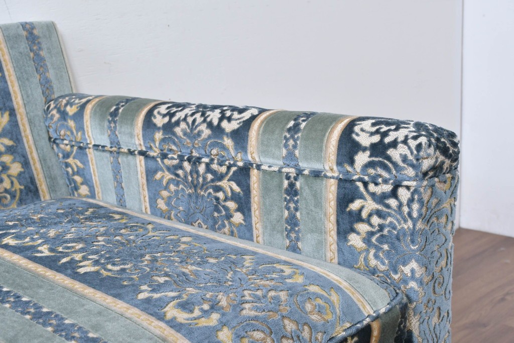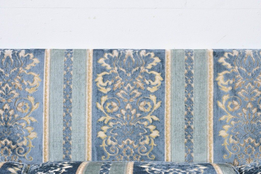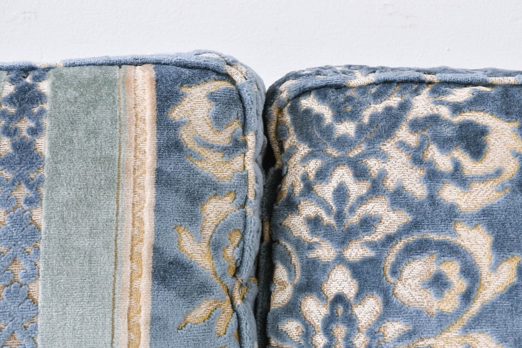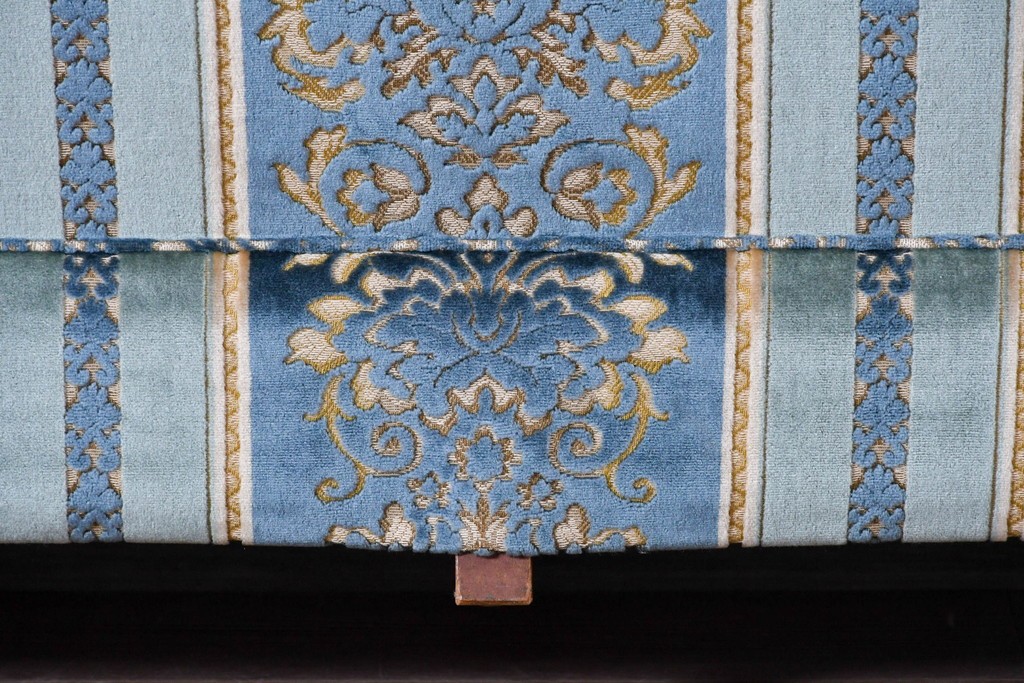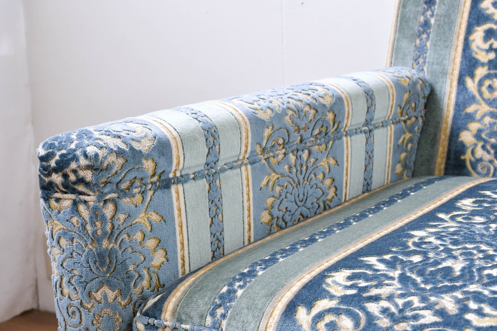 ブルーを基調に金糸調の織り模様を組み合わせたファブリックが、エレガントで柔らかな印象を与えます。ほどよい光沢のある生地感が美しく、クラシックインテリアとの相性も抜群です。