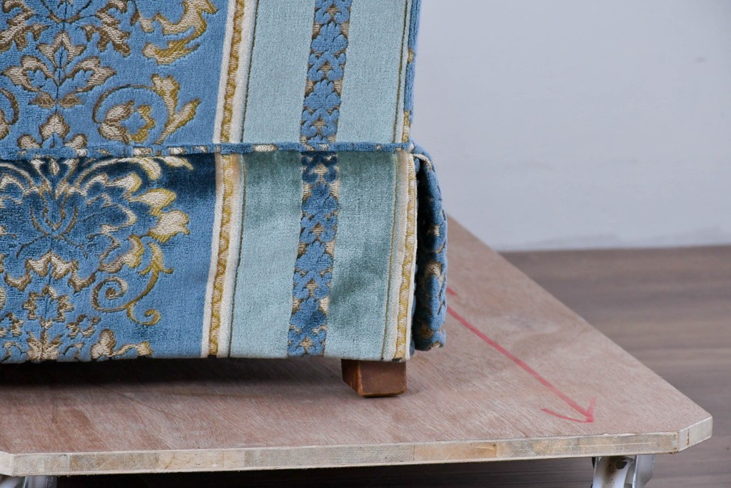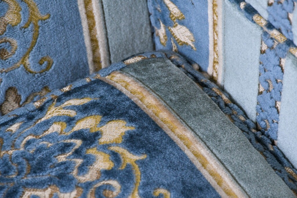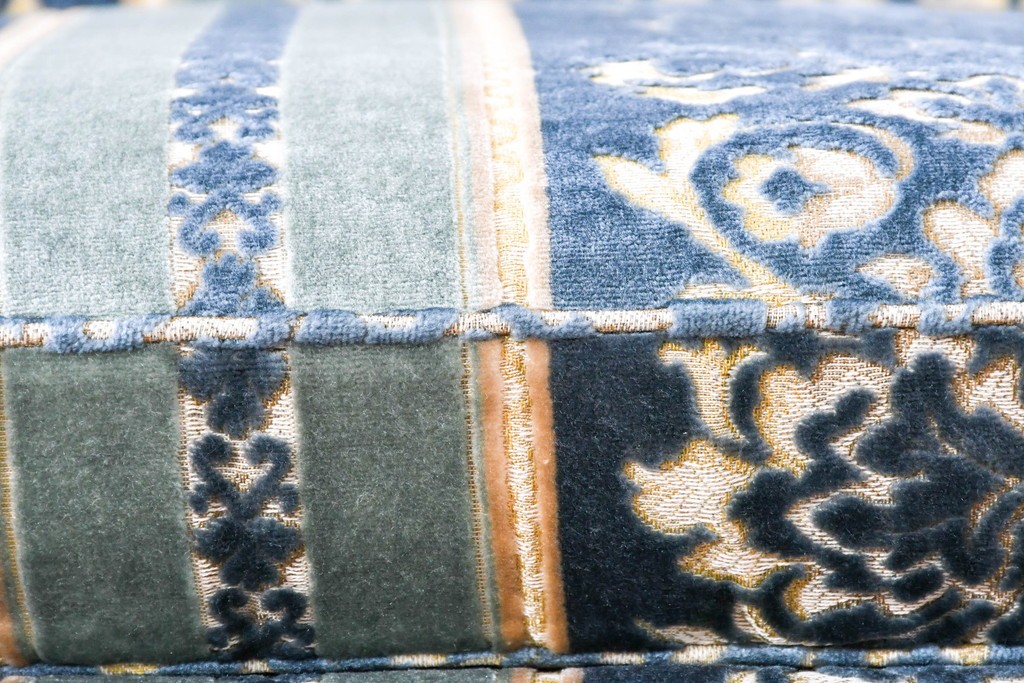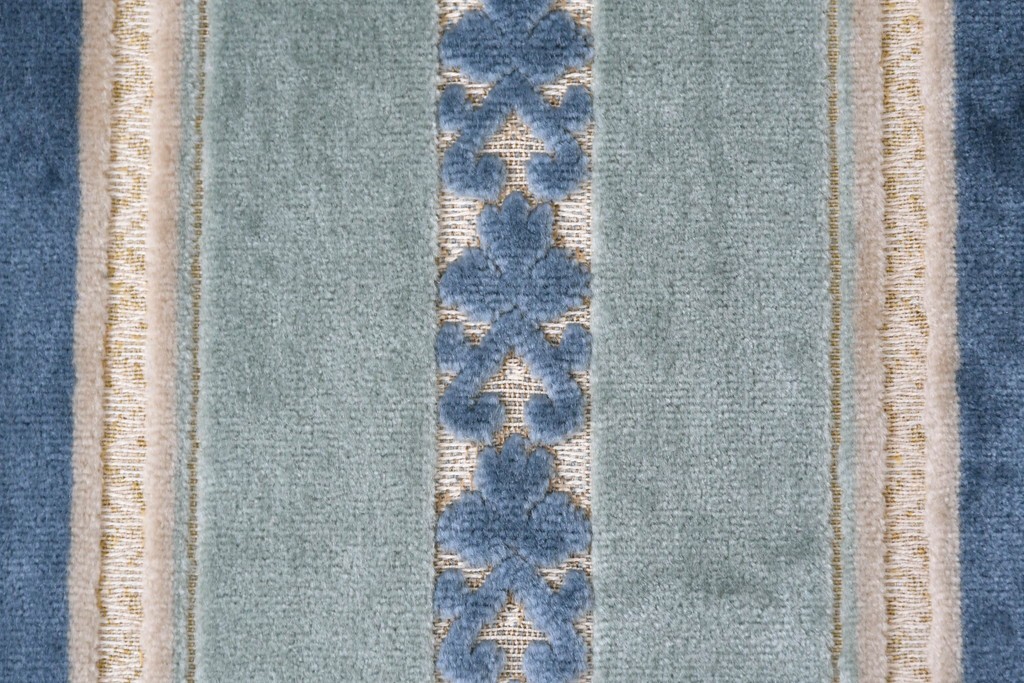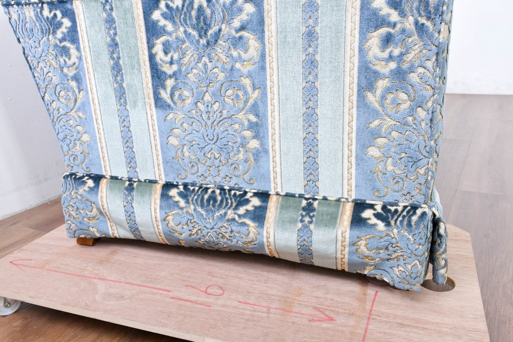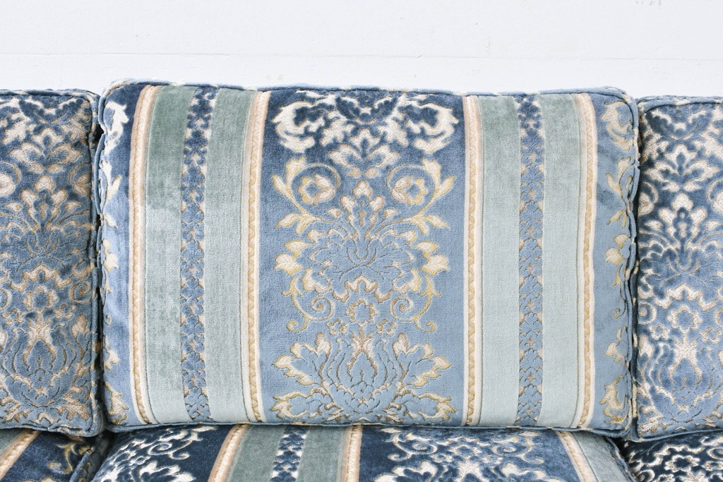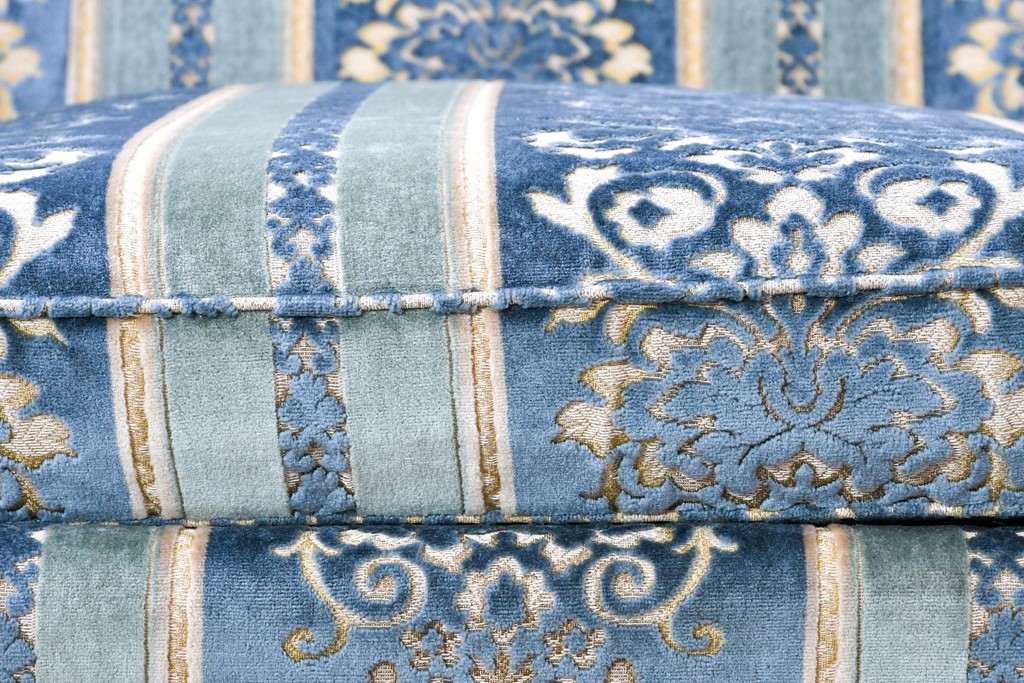 ブルーを基調に金糸調の織り模様を組み合わせたファブリックが、エレガントで柔らかな印象を与えます。ほどよい光沢のある生地感が美しく、クラシックインテリアとの相性も抜群です。
