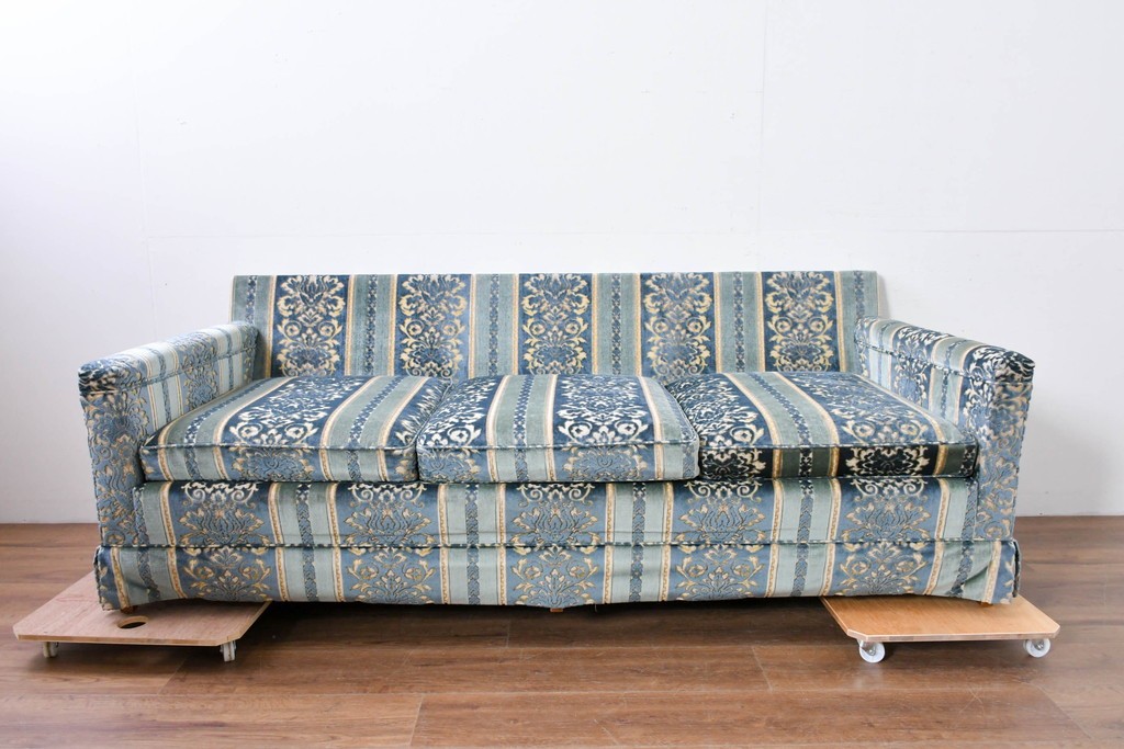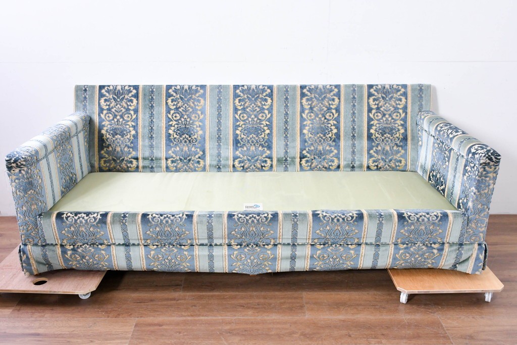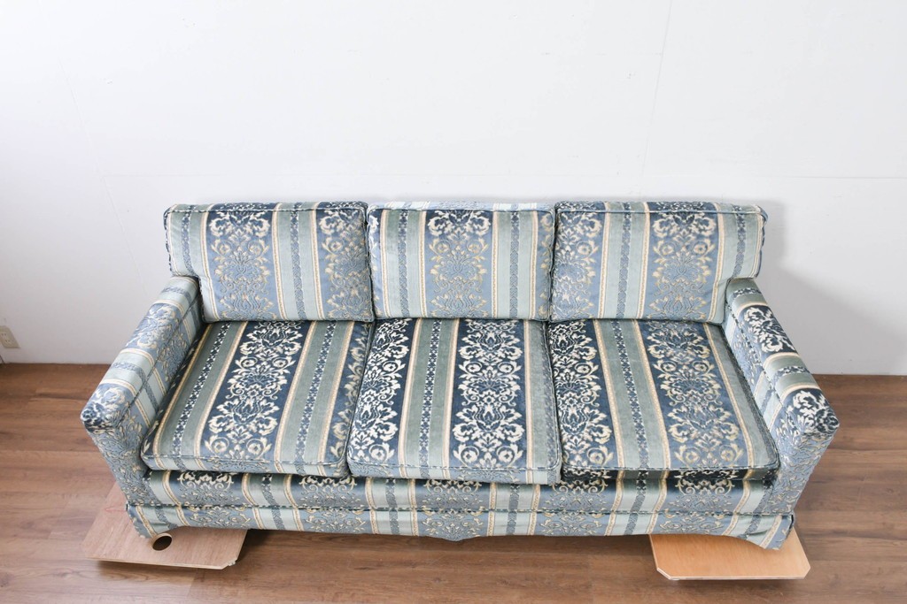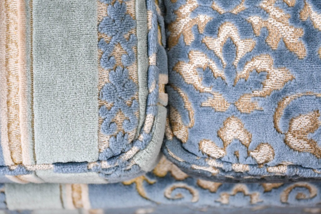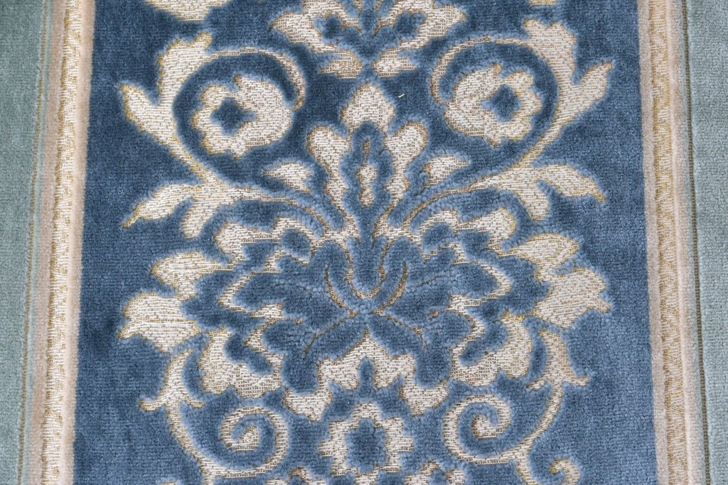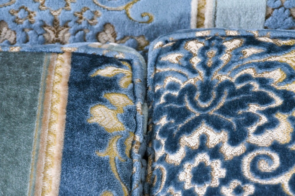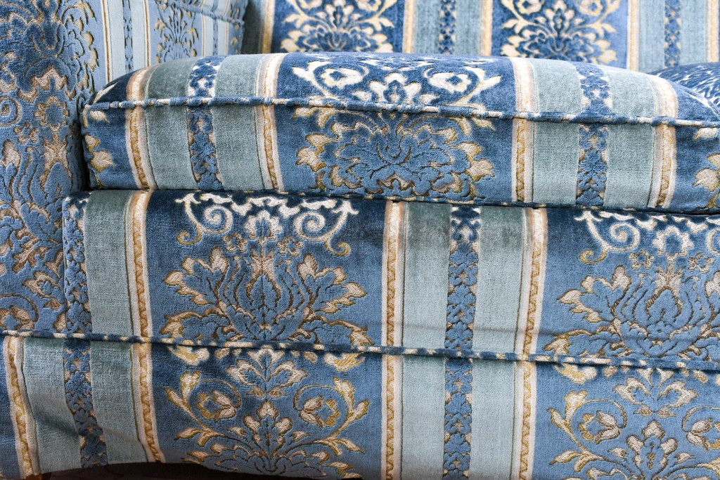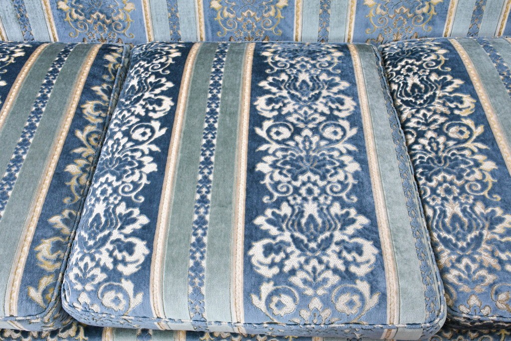 ブルーを基調に金糸調の織り模様を組み合わせたファブリックが、エレガントで柔らかな印象を与えます。ほどよい光沢のある生地感が美しく、クラシックインテリアとの相性も抜群です。