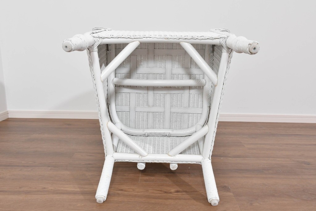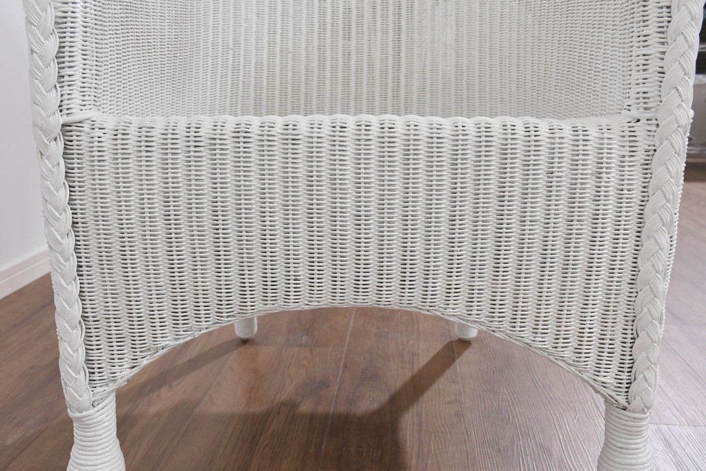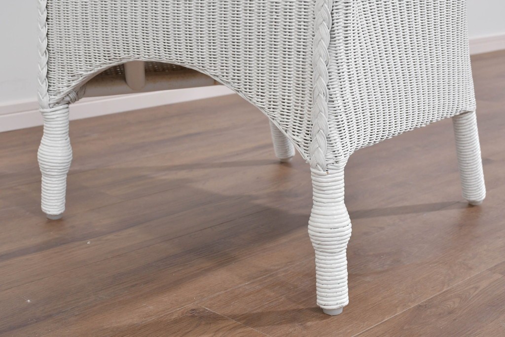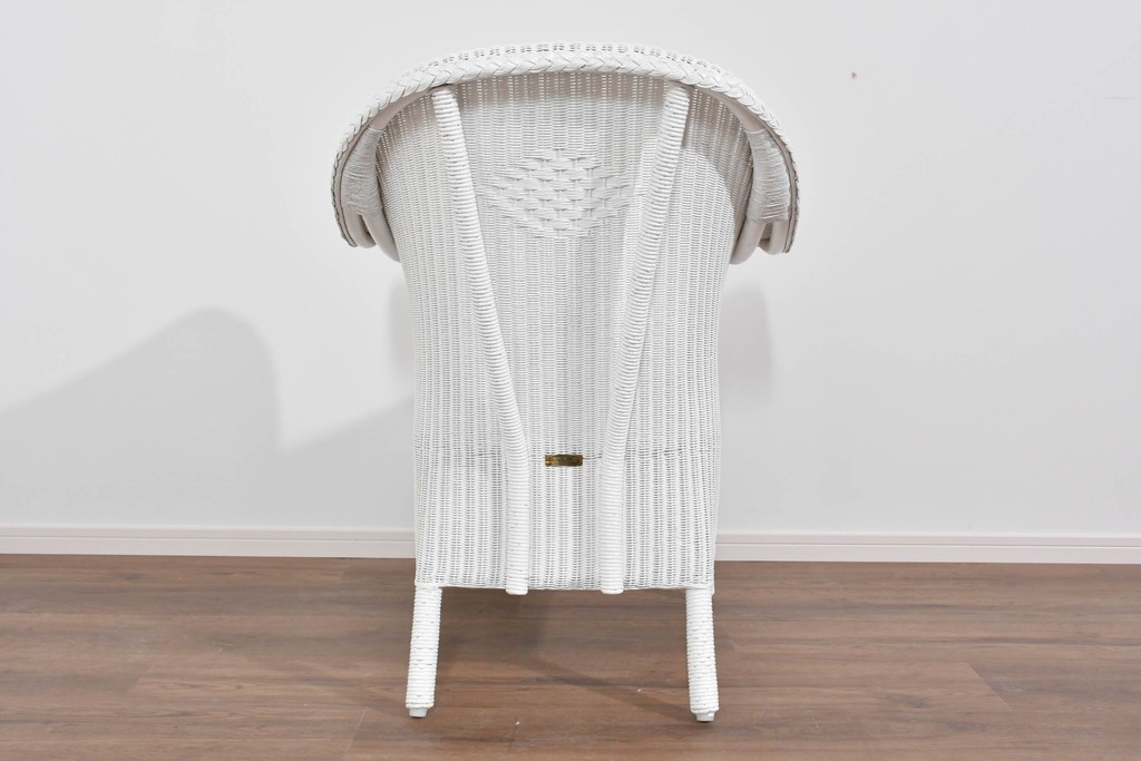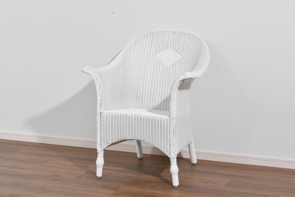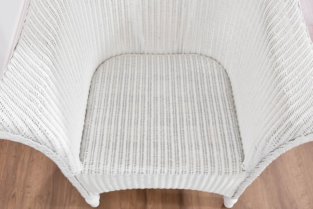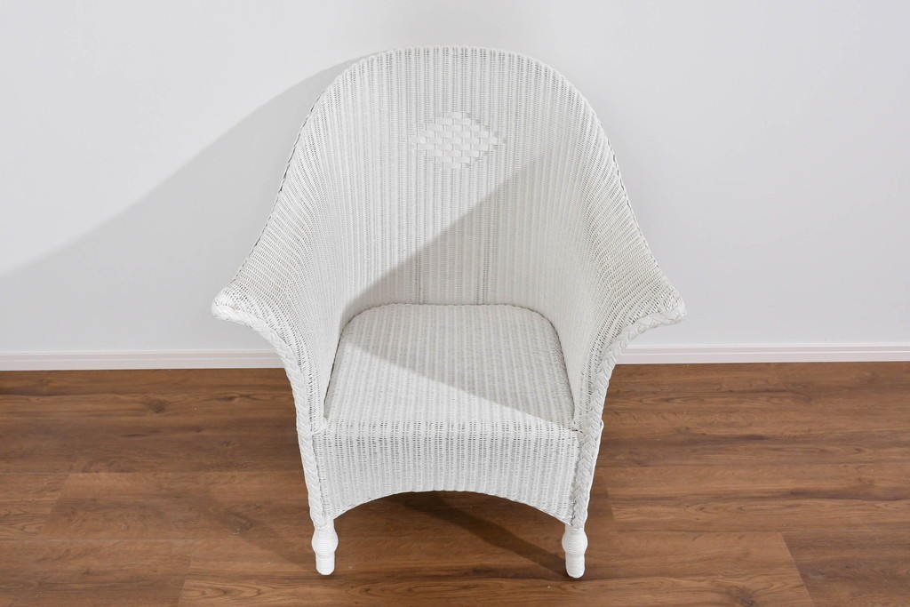 背もたれの編み模様が上品なアクセントになっているロイドルームのアームチェアです。清潔感のある軽やかなホワイトカラーは空間を明るく演出します。均一で美しい編み目が生み出す滑らかな質感は、ロイドルーム家具が長年愛され続ける理由のひとつです。背から肘掛けへと流れるようなカーブと、クラシカルで優美な佇まいはリビングやサンルームにもぴったりの一脚です。