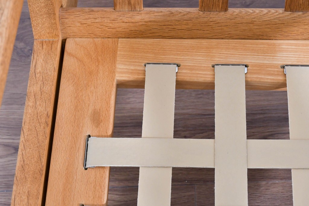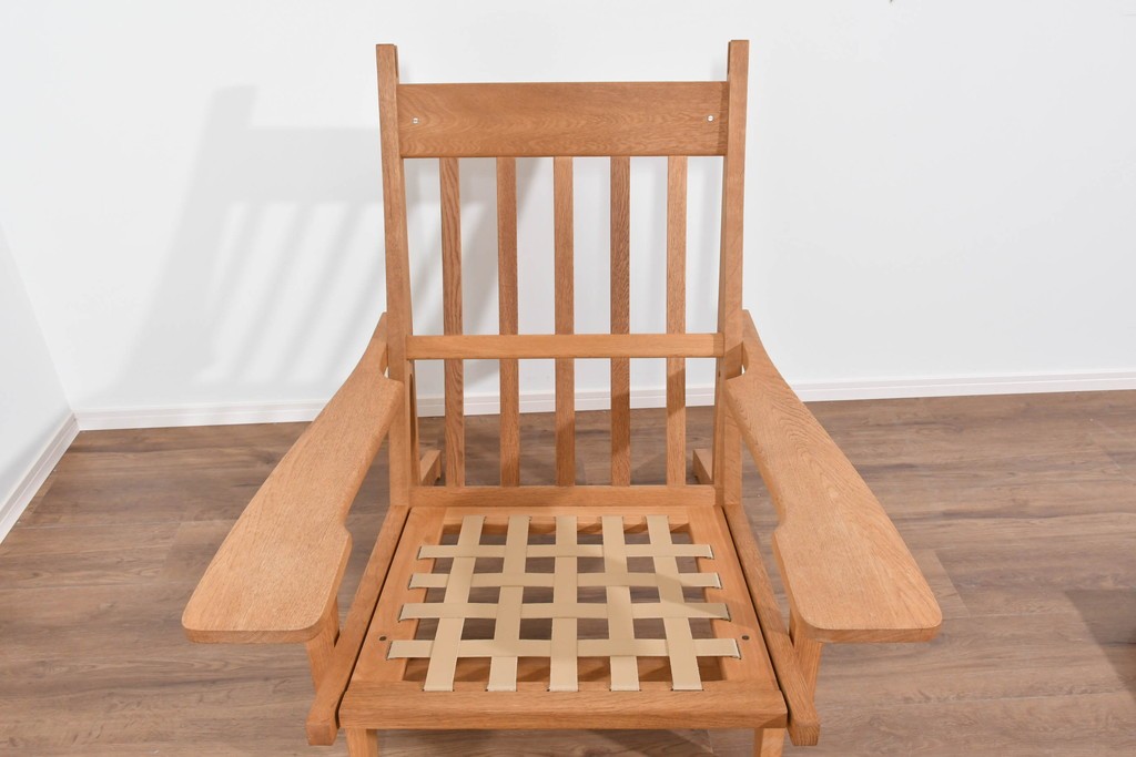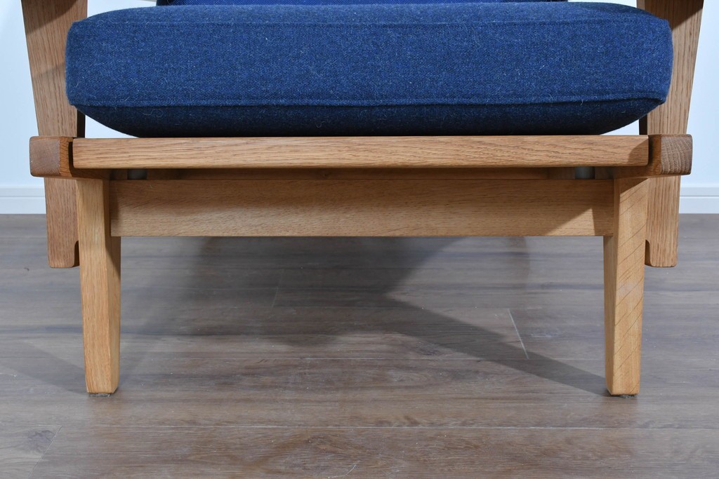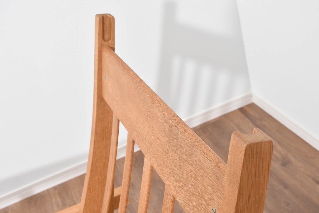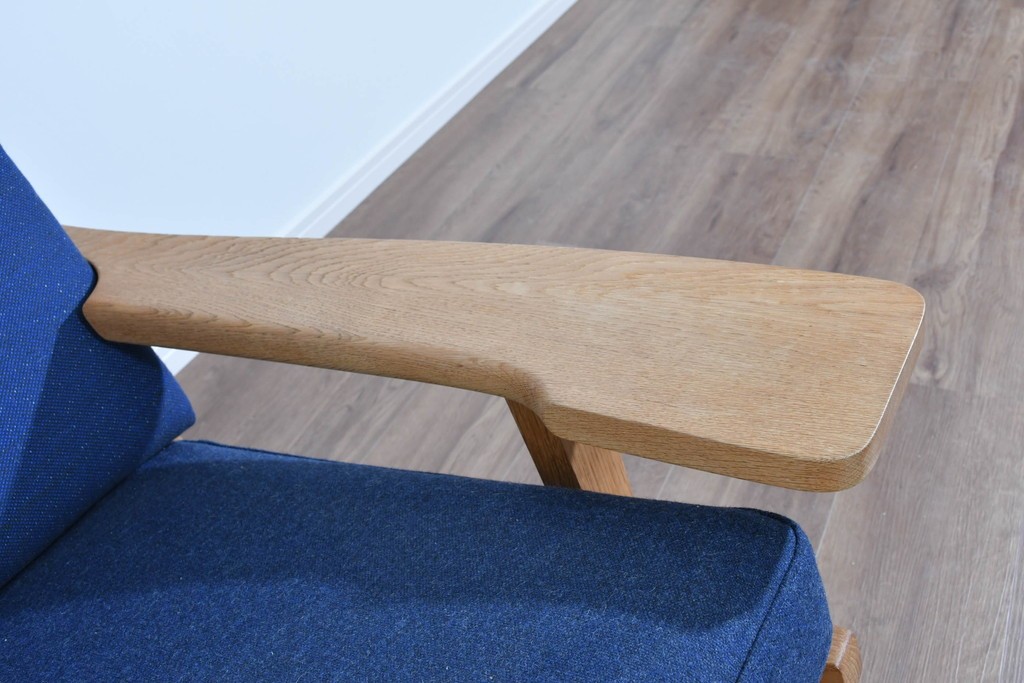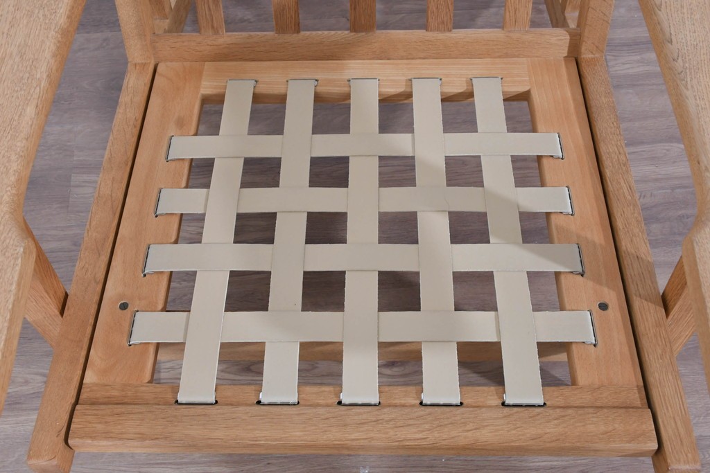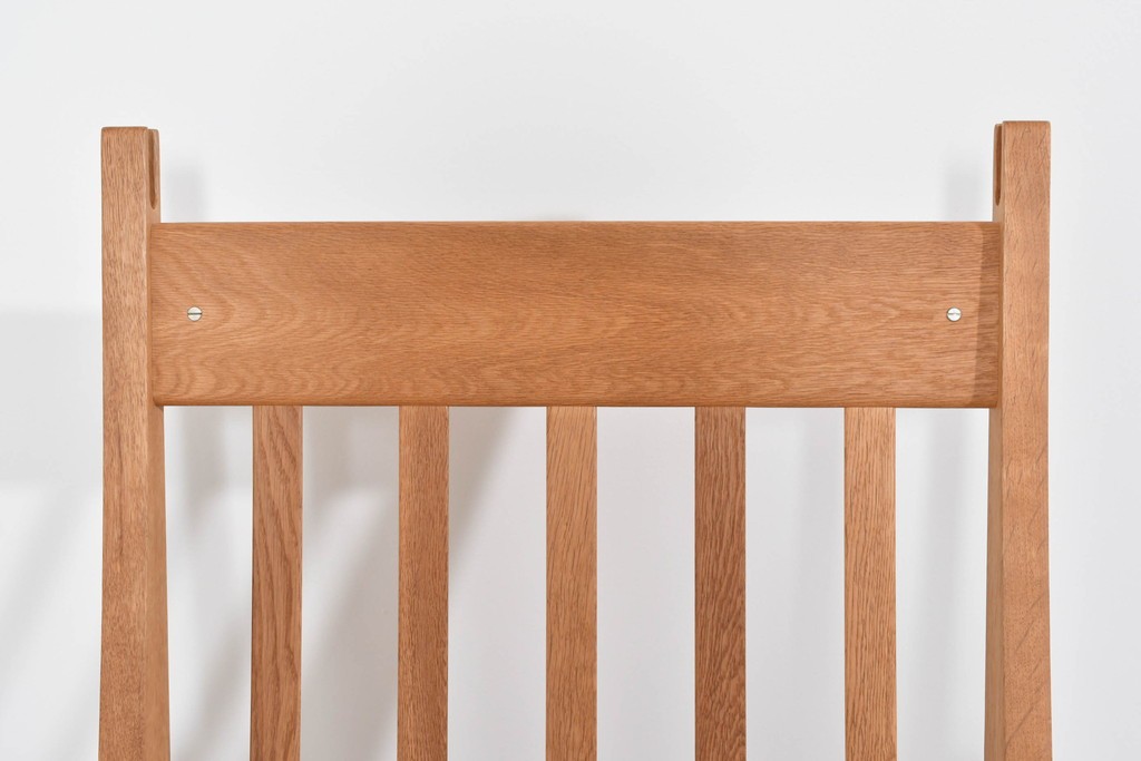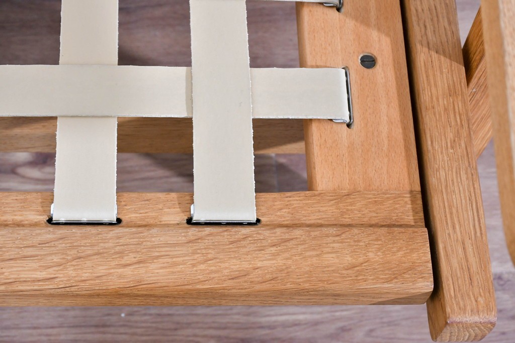 しっかりとした木目を持つオーク材を用い、素直なラインで構成されたフレームは、素材の良さを存分に感じられる造りです。職人が丁寧に仕上げた面取りやアームの滑らかな形状が、手仕事ならではの上質さを引き出し、長く愛用できる頼もしさが漂います。