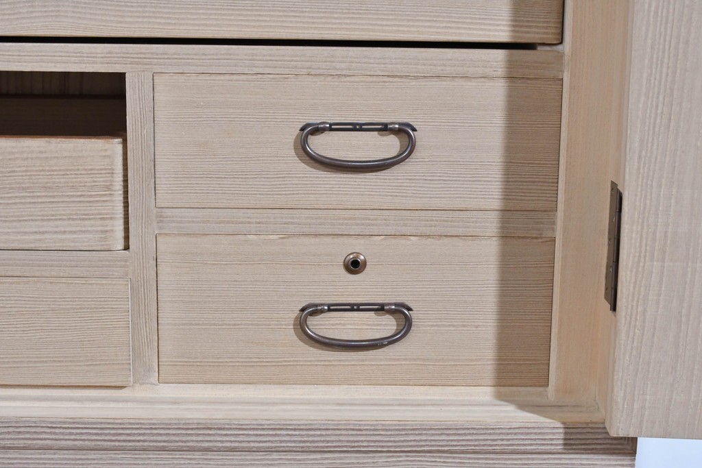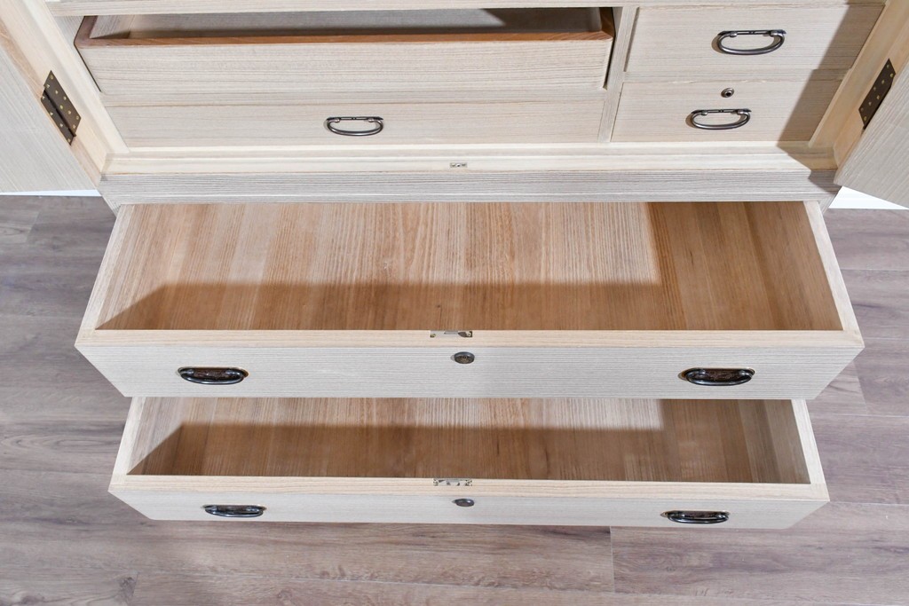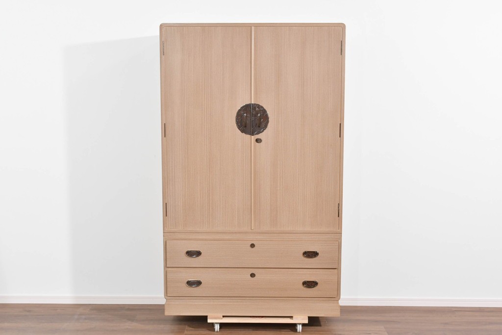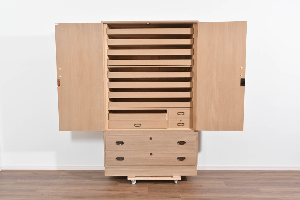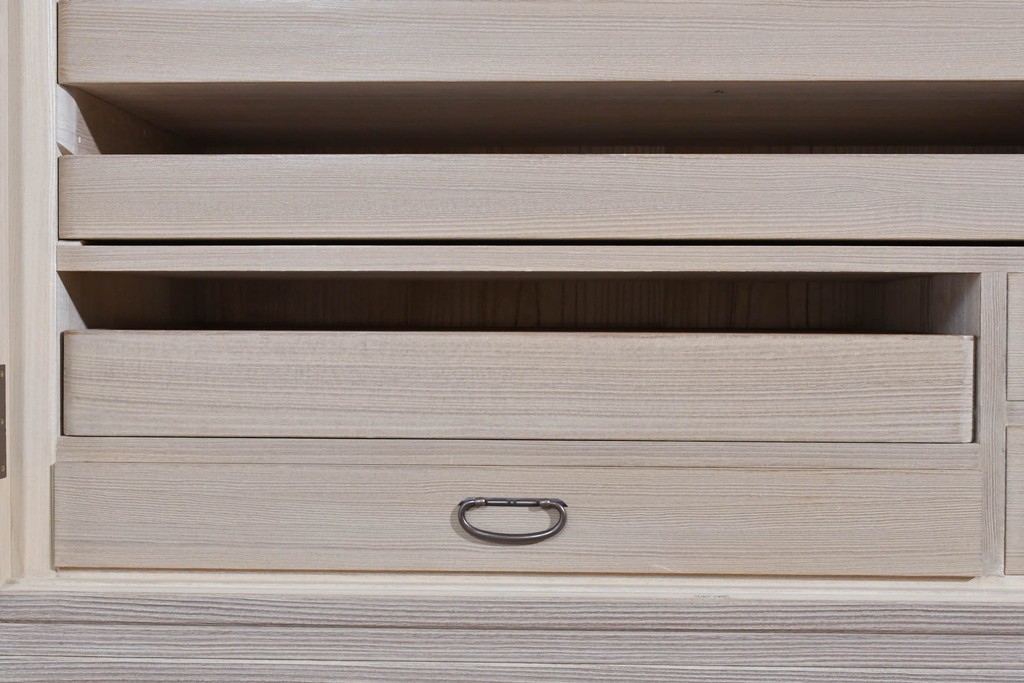内部には衣類や小物を整理しやすい多段の引き出しが備わり、用途に合わせてすっきり収納できます。桐材は湿度調整に優れ、衣類をやさしく守る素材として古くから親しまれてきました。実用性と伝統技術が心地よく融合した一台です。