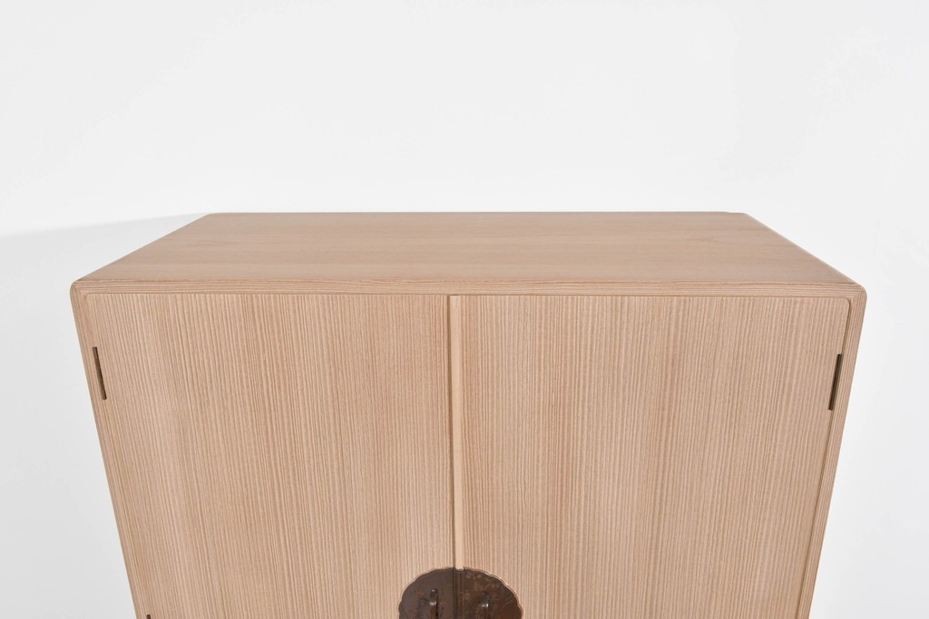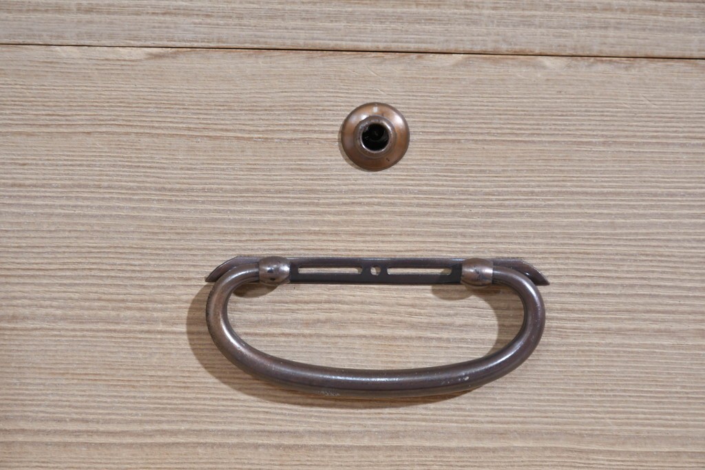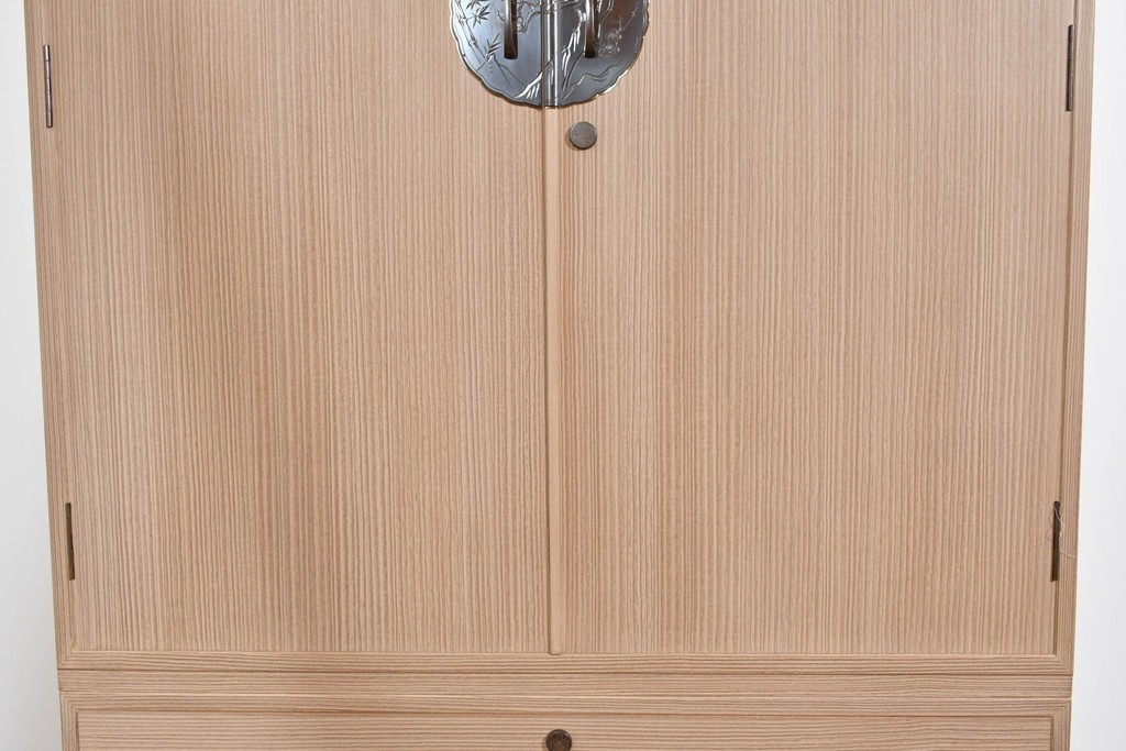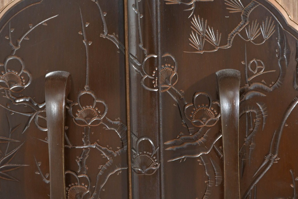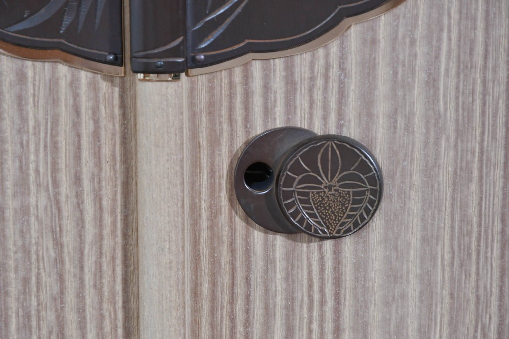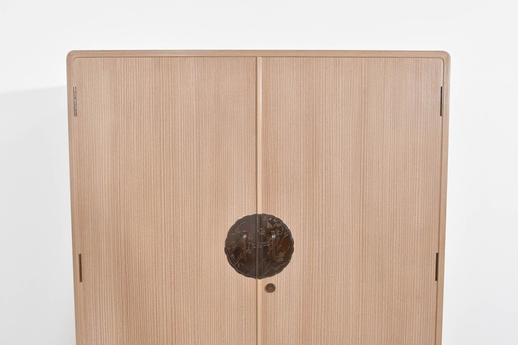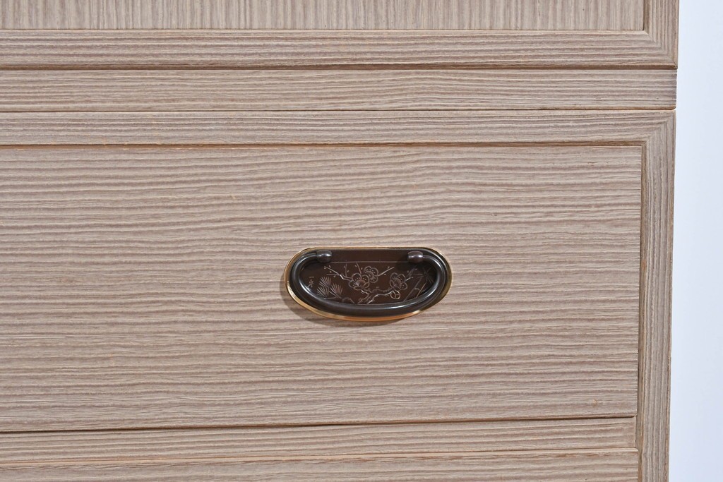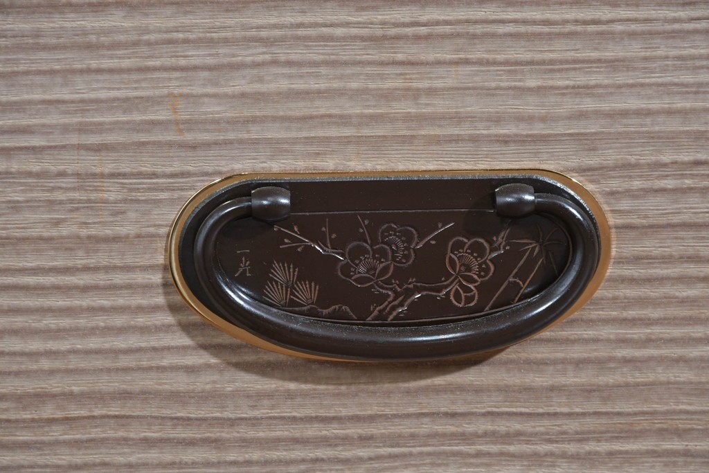 扉部の大ぶりな金具や、引き出しの取手には松竹梅をモチーフとした彫金が施され、趣ある表情を見せています。桐の明るい色味と金具の深い色調がよく調和し、和家具ならではの静かな華やかさが感じられます。細部まで手仕事の丁寧さが伝わる仕上がりです。