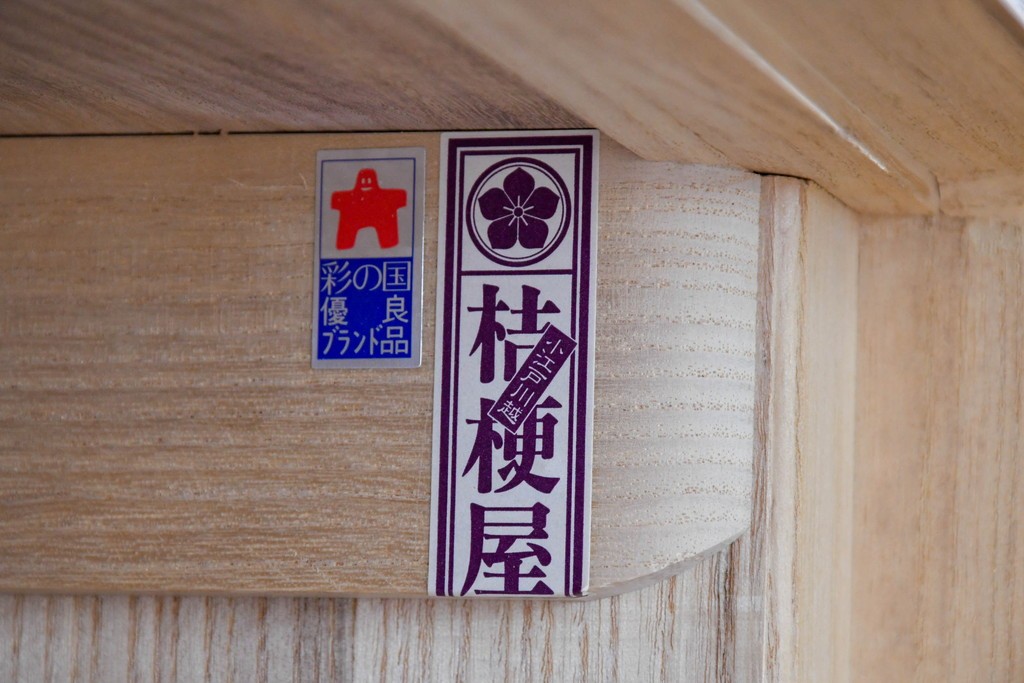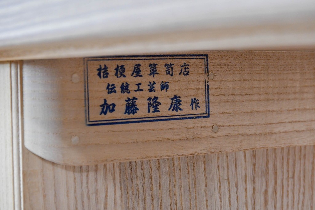 桔梗屋箪笥店にて、伝統工芸師・加藤隆康氏が手掛けた桐箪笥です。素材の扱いに長けた職人ならではの、丁寧な木組みや美しい仕上げが見どころで、桐材ならではの柔らかな木目が上品な印象を添えています。全体に落ち着いた風合いがあり、永く愛用しやすい佇まいです。