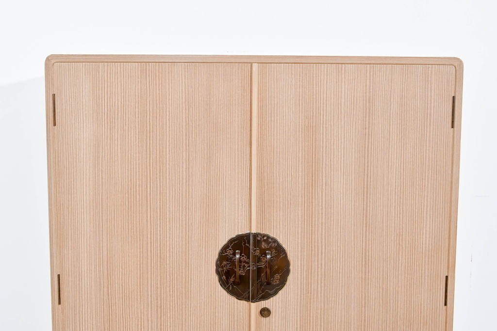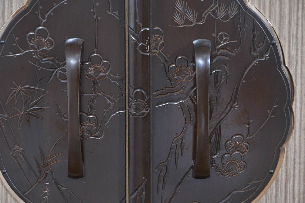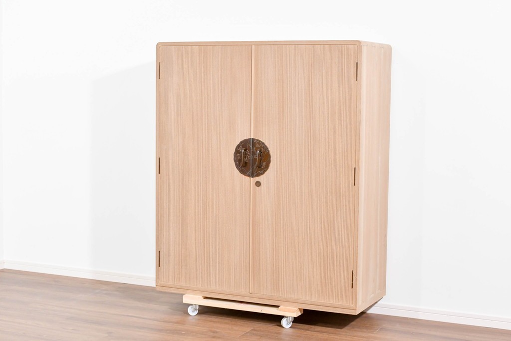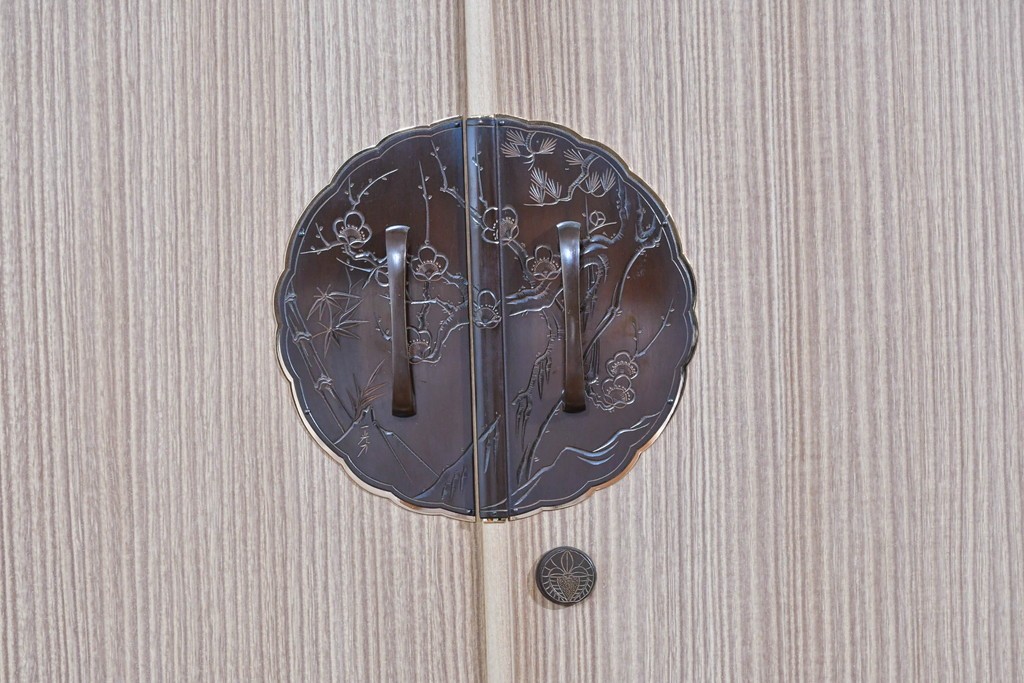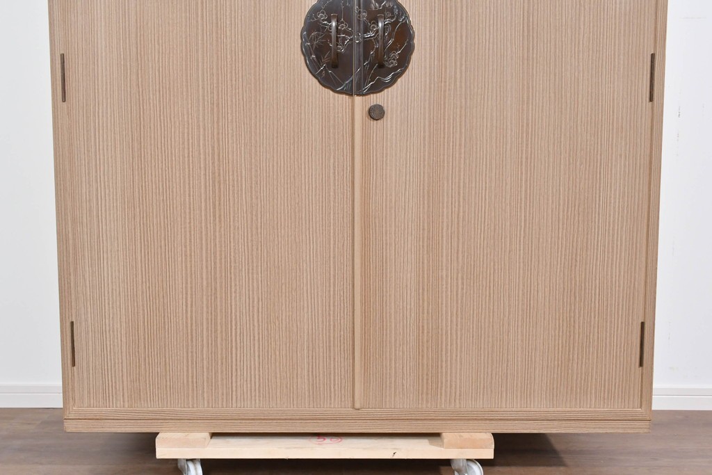扉中央に配された大ぶりの丸金具には、松竹梅が繊細に彫り込まれ、柔らかな桐材の風合いを引き立てています。落ち着いた金具色と浅い木地色のコントラストが美しく、上品で飽きのこない表情を見せます。和の意匠を感じさせる装飾が全体の品格を高めています。