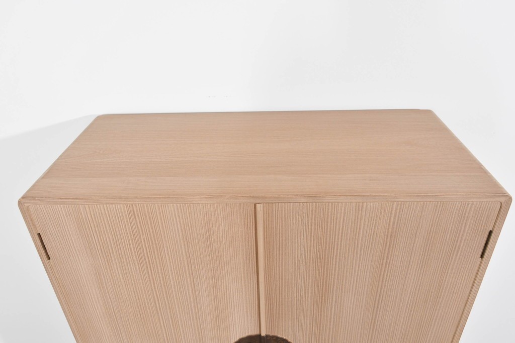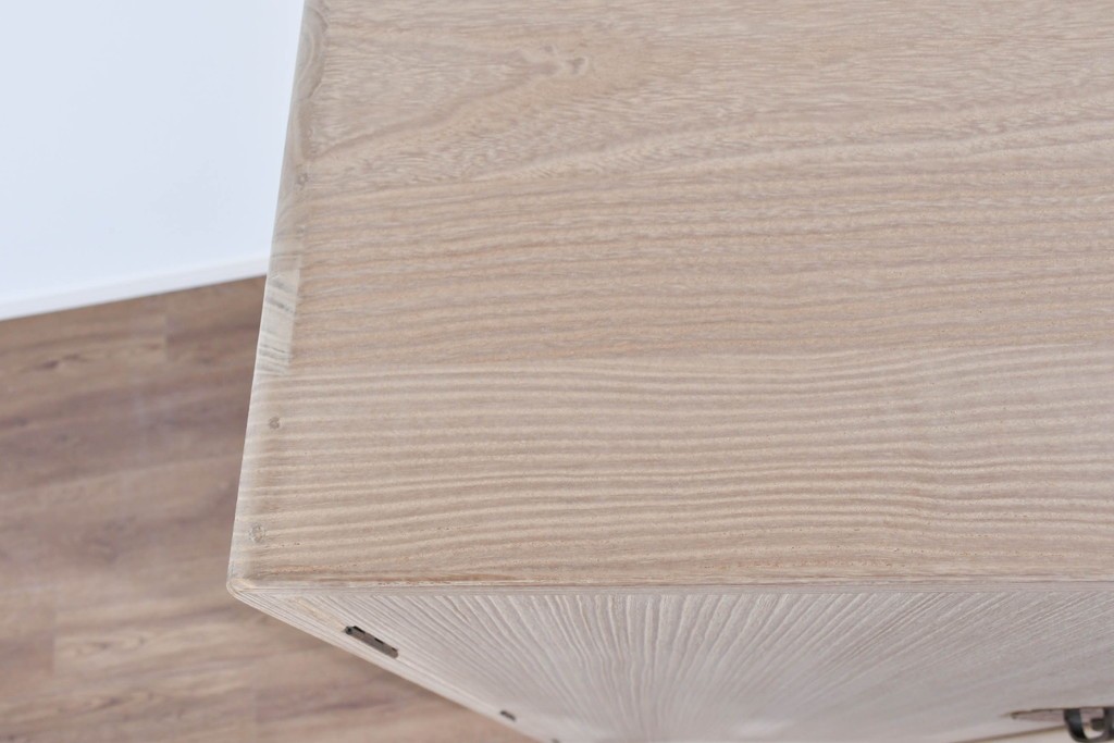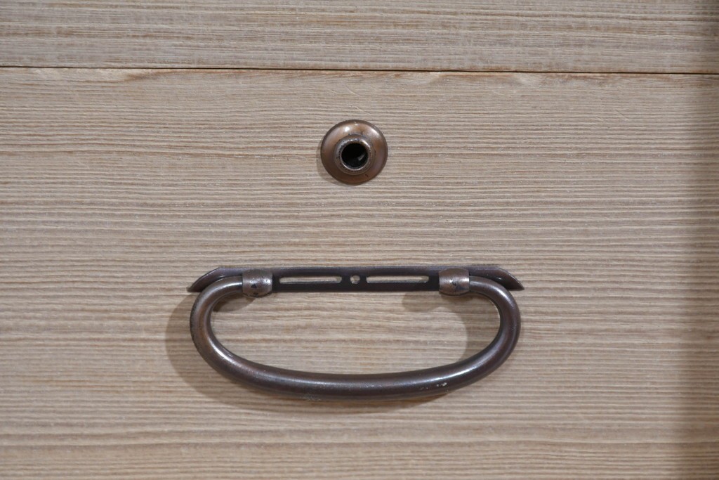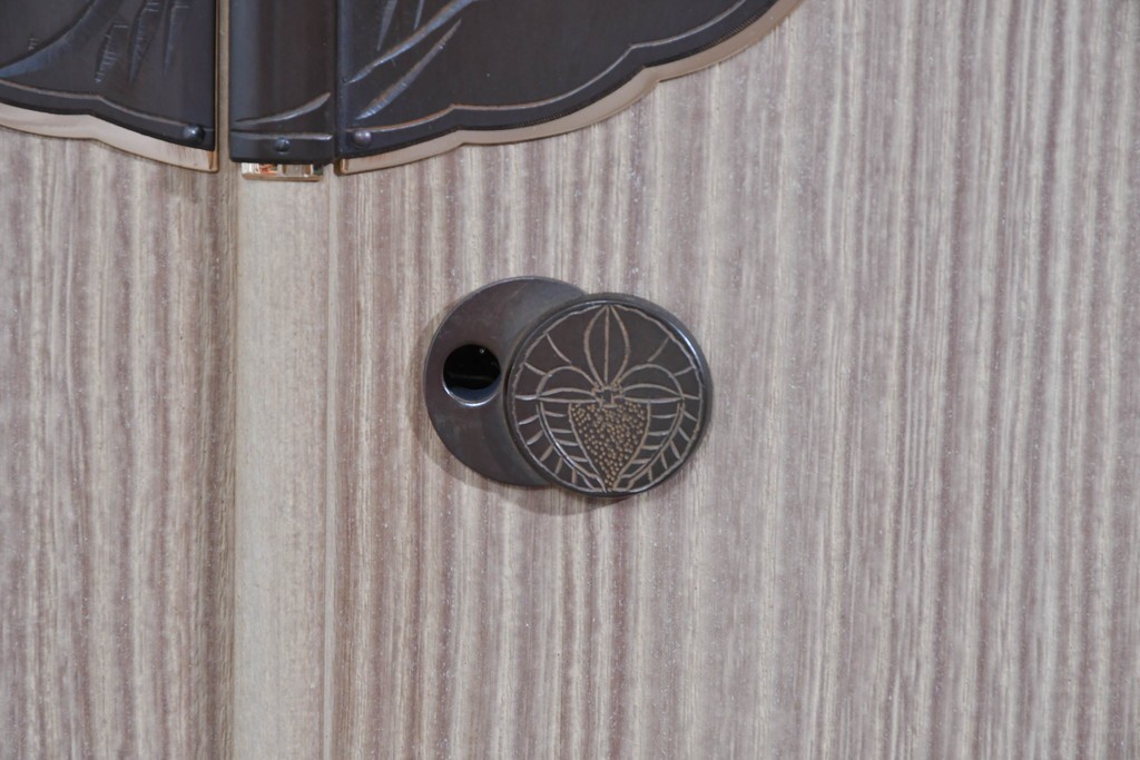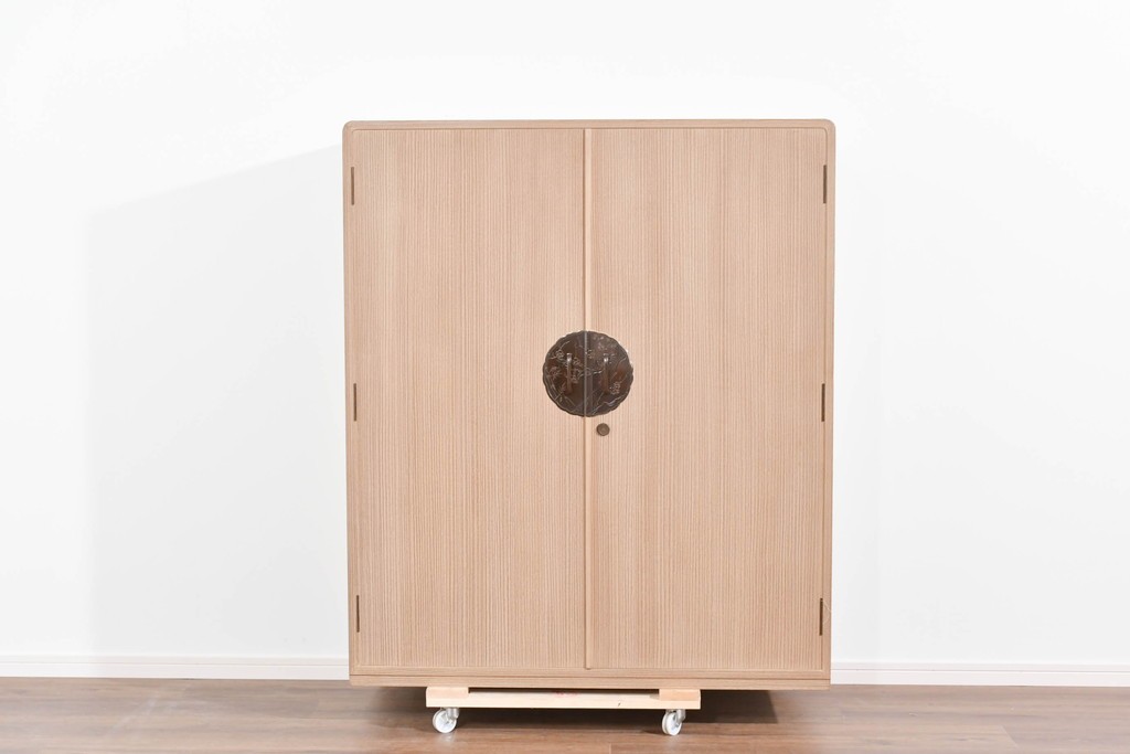 扉中央に配された大ぶりの丸金具には、松竹梅が繊細に彫り込まれ、柔らかな桐材の風合いを引き立てています。落ち着いた金具色と浅い木地色のコントラストが美しく、上品で飽きのこない表情を見せます。和の意匠を感じさせる装飾が全体の品格を高めています。