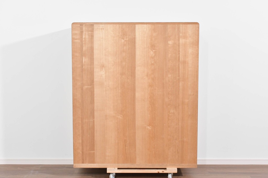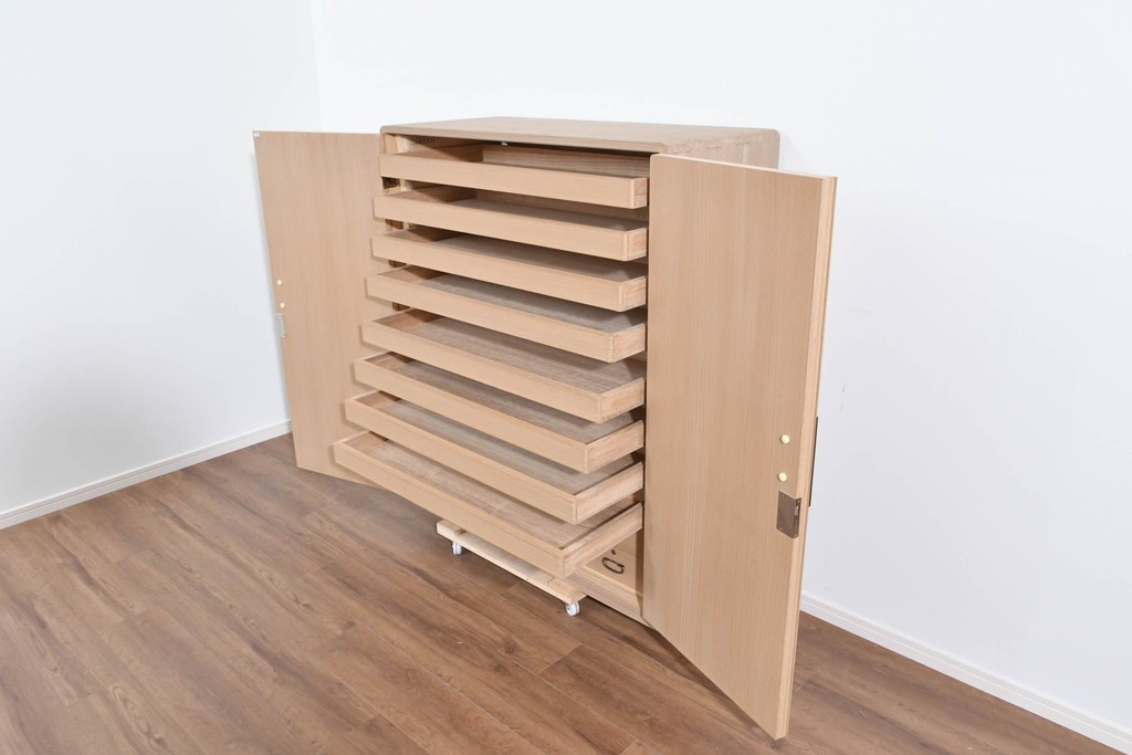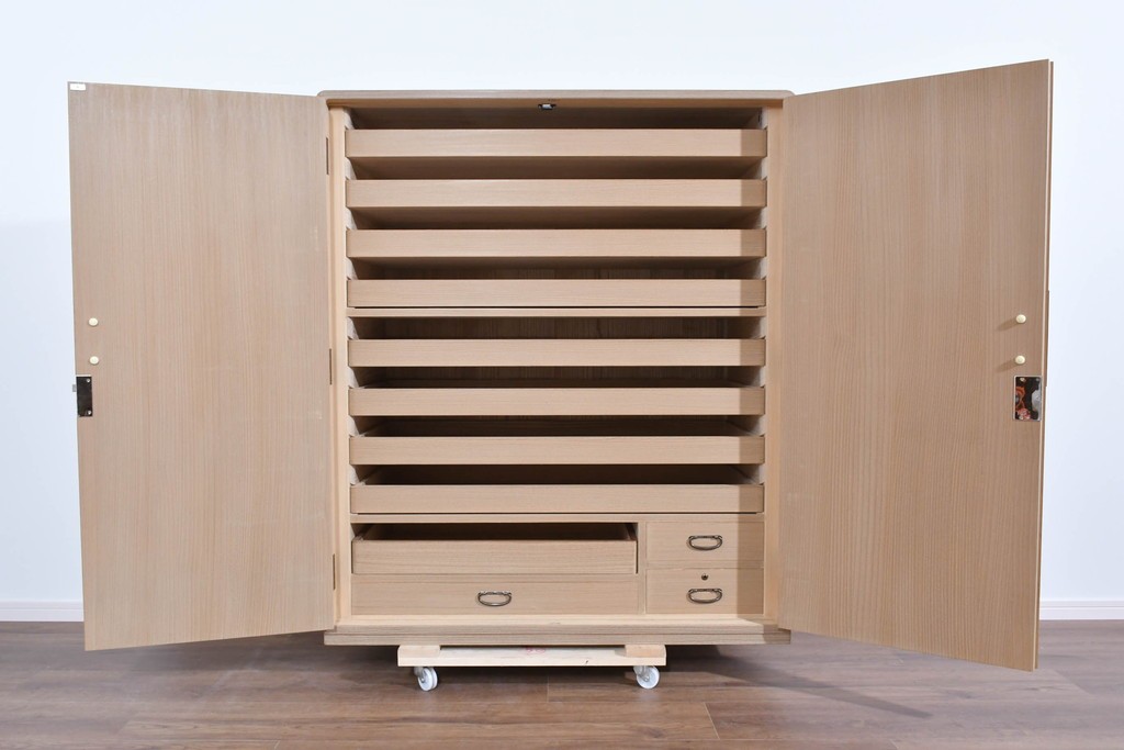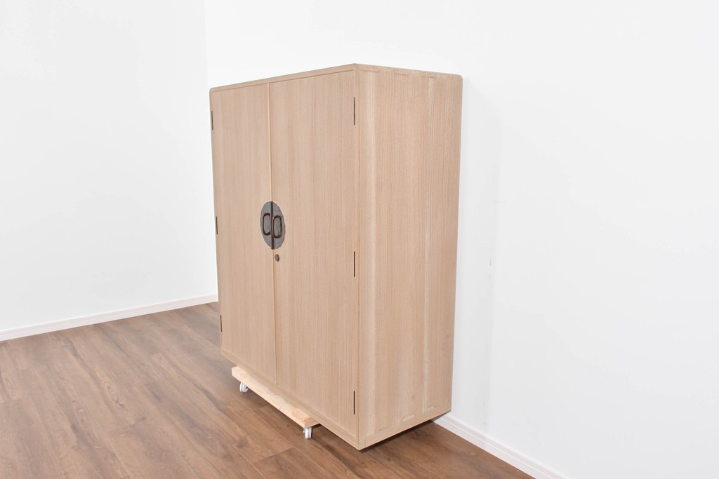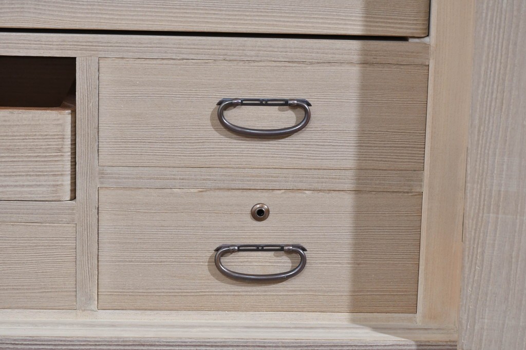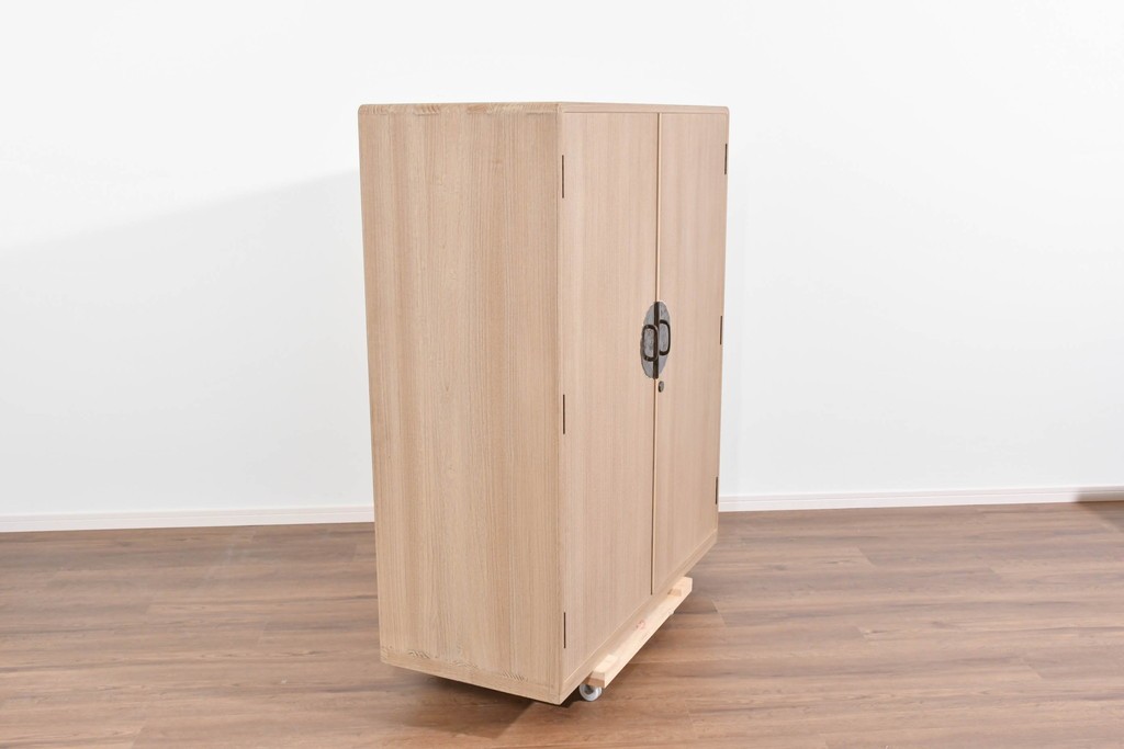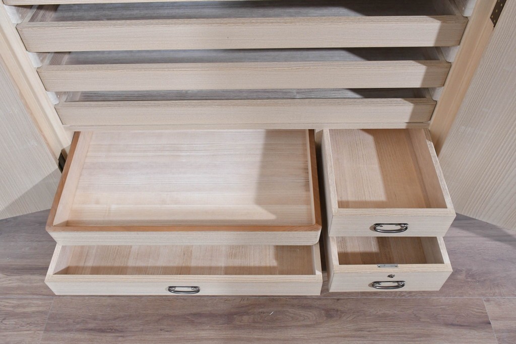 扉内部には薄手の衣類を整理しやすい浅い引き出しが多段に備わり、下部には小物収納に便利な引き出しが配置されています。桐材は湿度調整に優れ、衣類をやさしく保管できる素材として親しまれてきました。実用性と伝統工芸の美が心地よく調和した一台です。