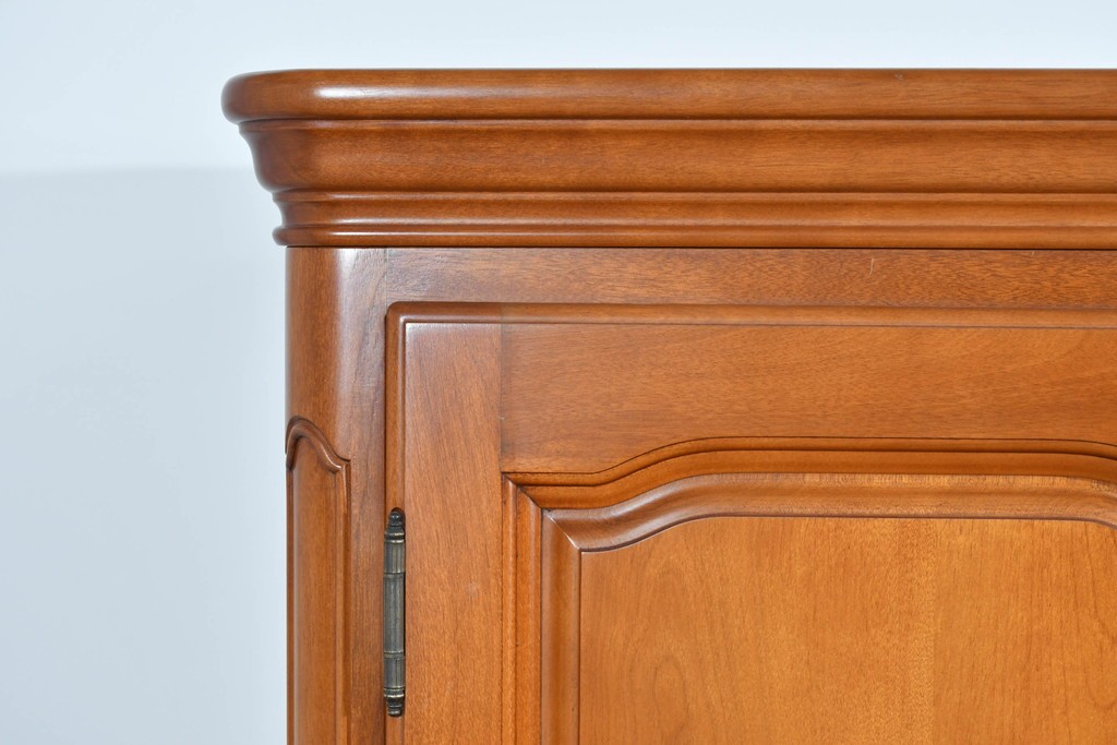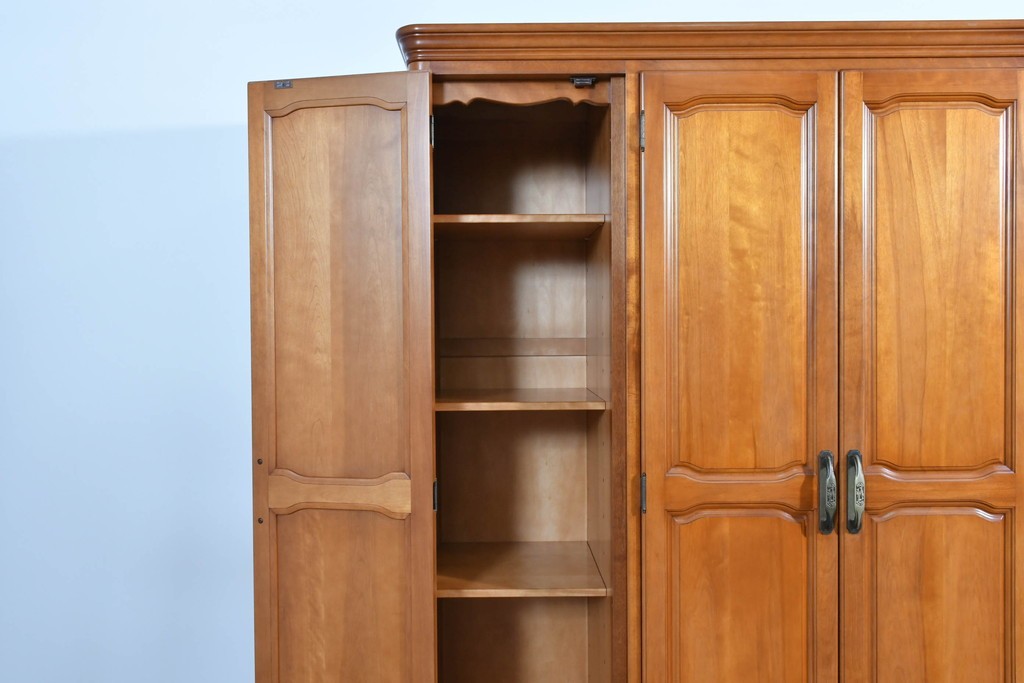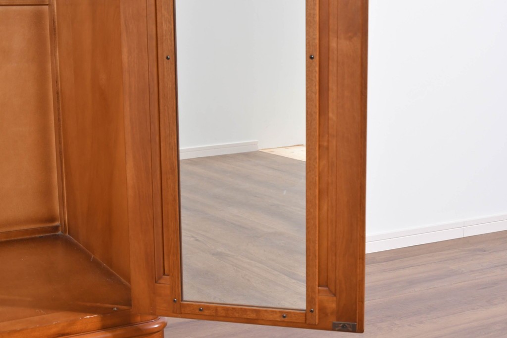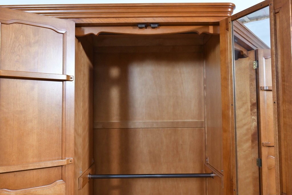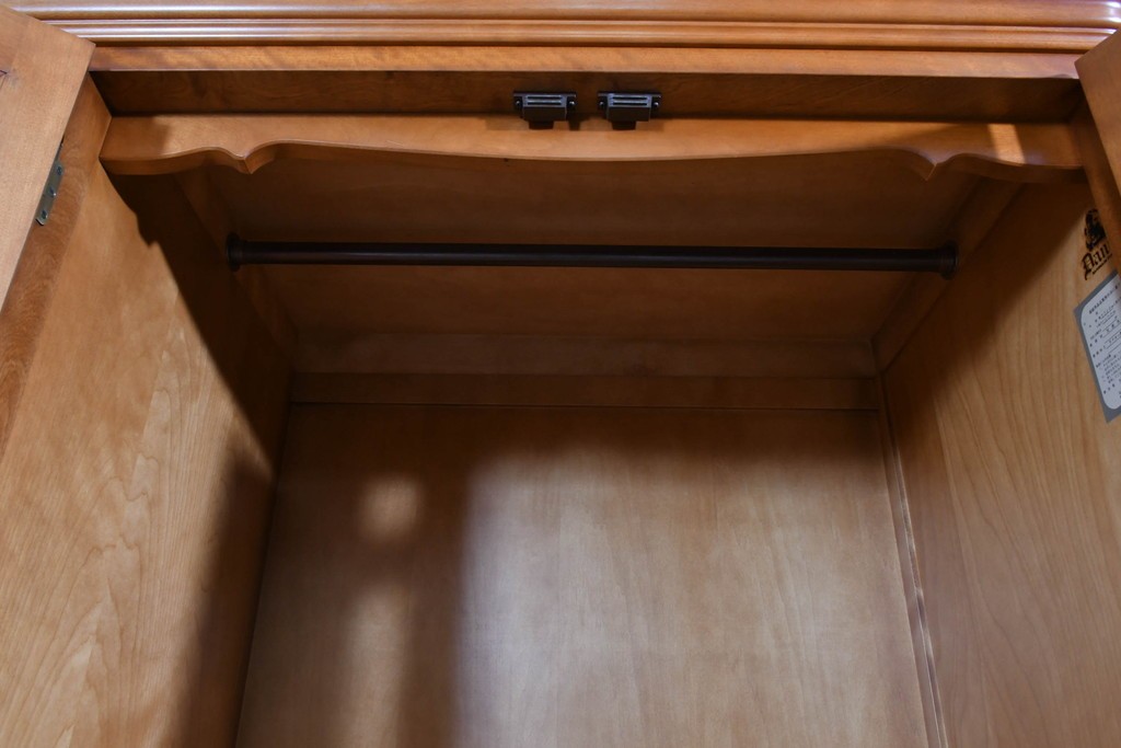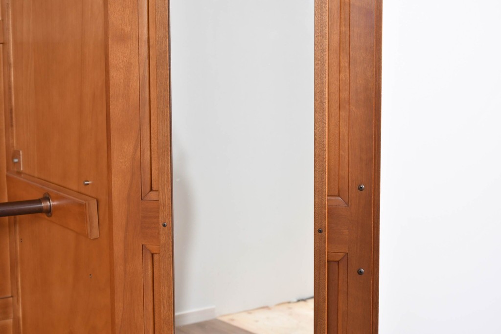 内部には可動棚とハンガーバーを備え、衣類や小物をすっきりと収めることができます。右扉の裏面には姿見鏡を装備し、身だしなみを整える際にも便利にお使いいただけます。扉の立体的な框組みや金具の意匠が上品さを引き立て、機能面と美観が心地よく調和しています。