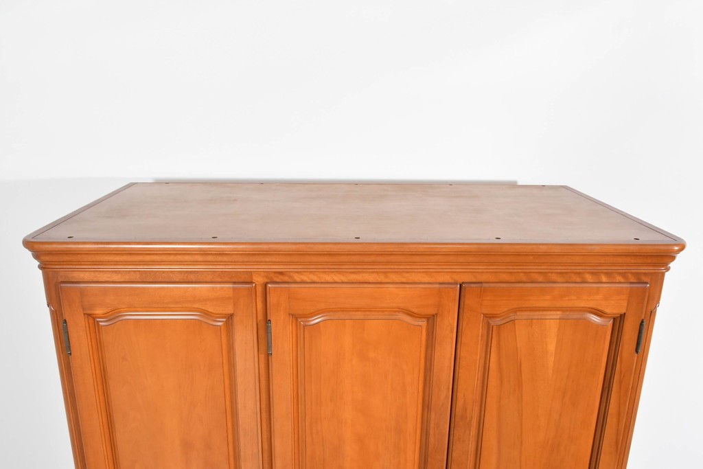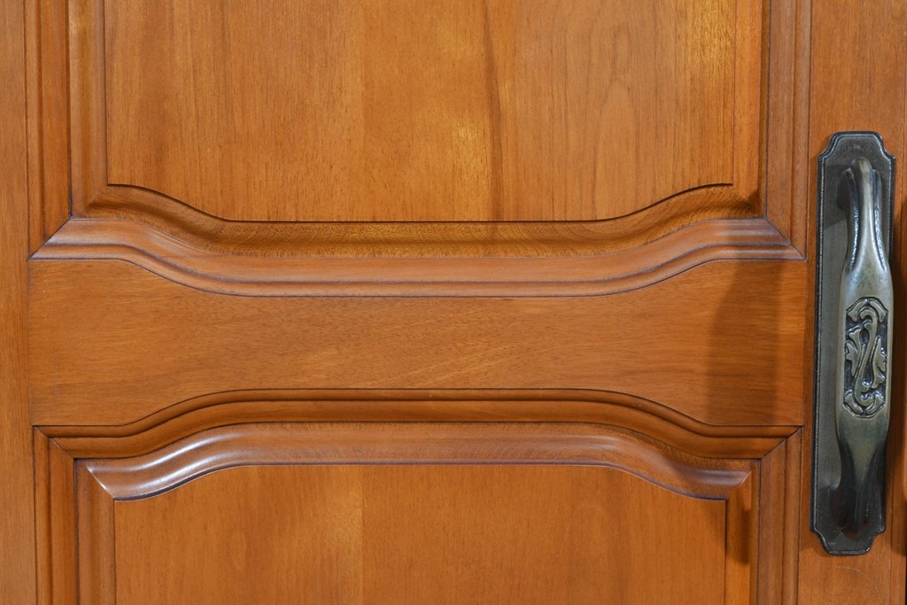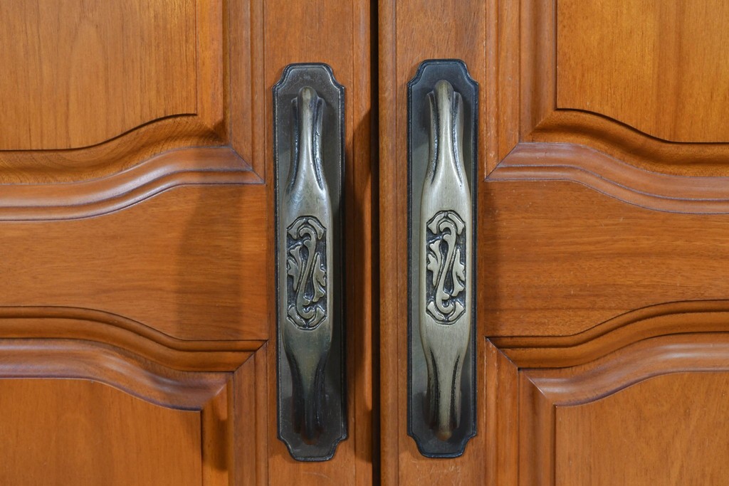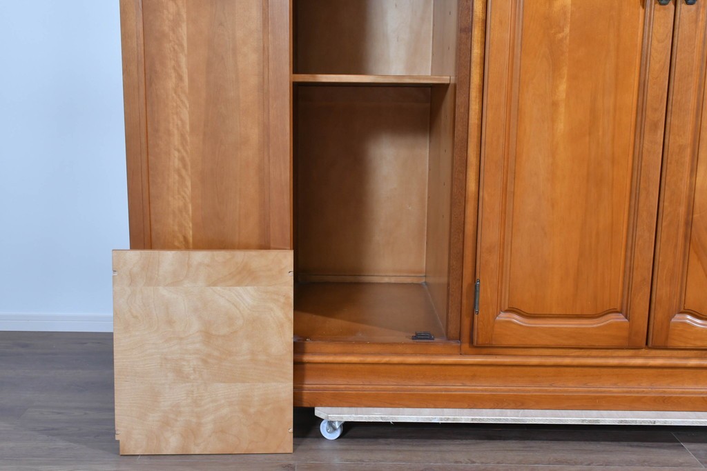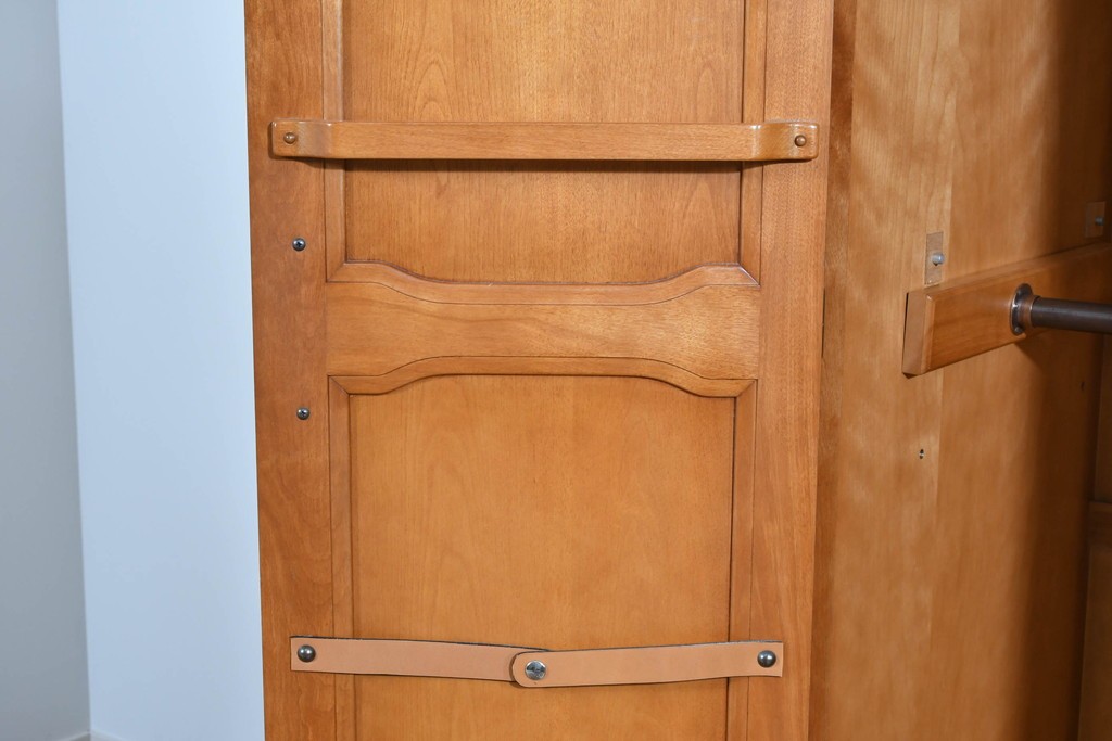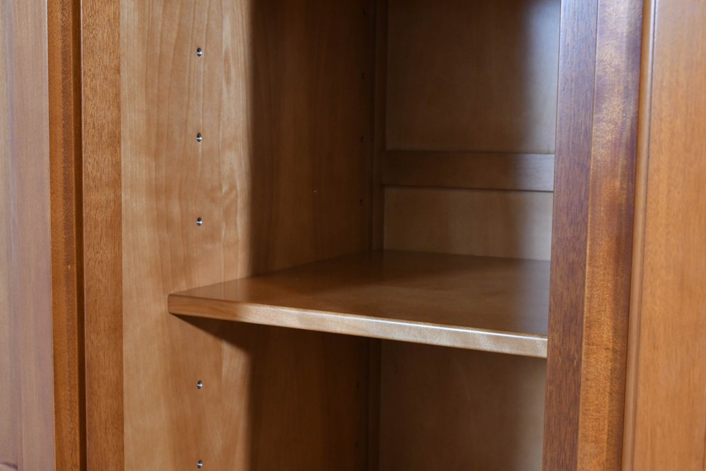 内部には可動棚とハンガーバーを備え、衣類や小物をすっきりと収めることができます。右扉の裏面には姿見鏡を装備し、身だしなみを整える際にも便利にお使いいただけます。扉の立体的な框組みや金具の意匠が上品さを引き立て、機能面と美観が心地よく調和しています。