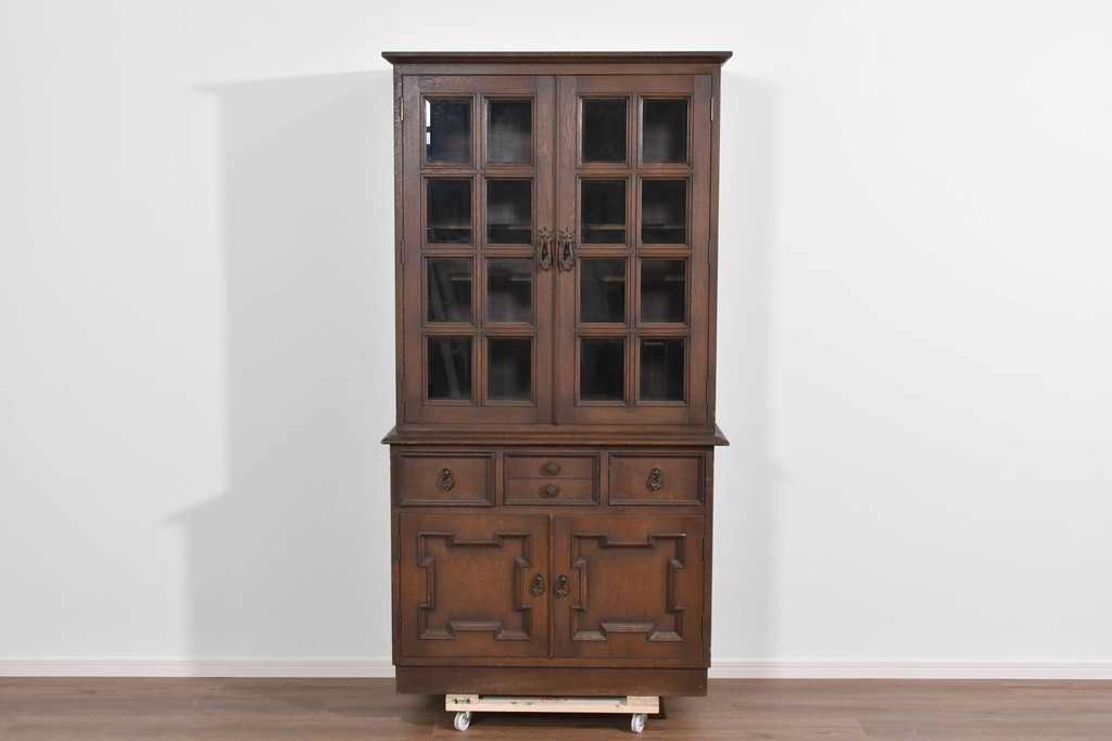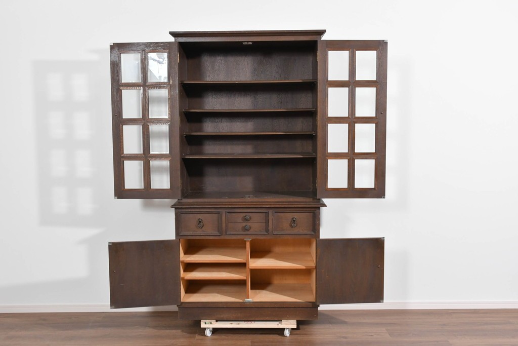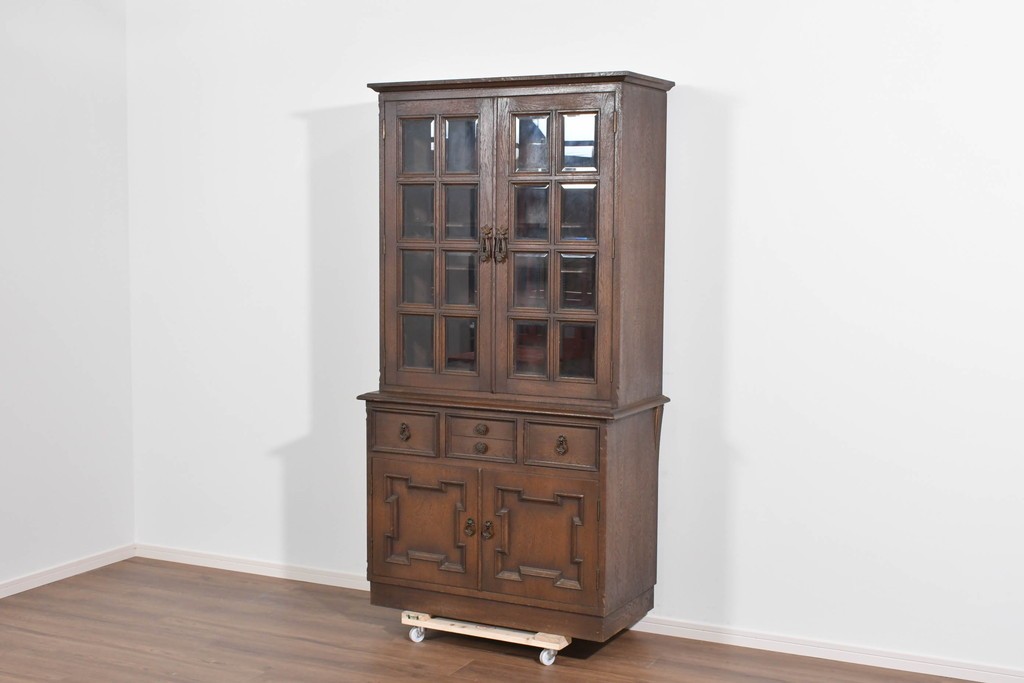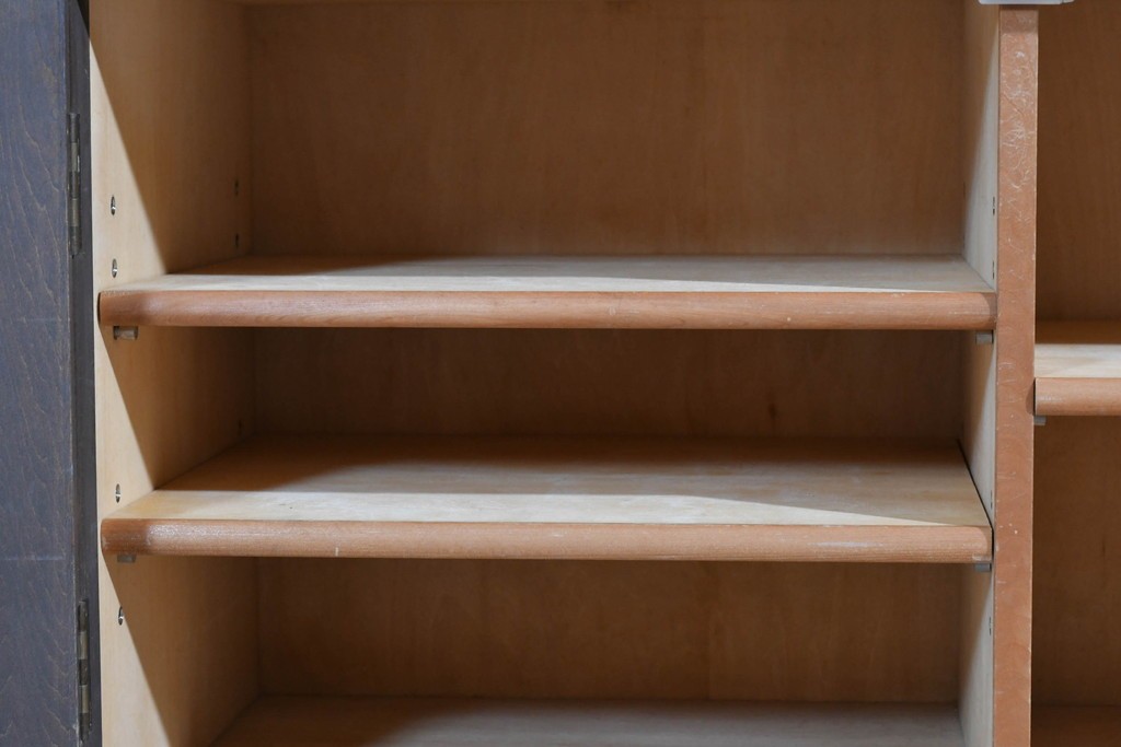 創業の古い家具店として知られる永田良介商店の食器棚です。和製ヴィンテージらしい落ち着いた木肌に、同店らしい端正な意匠が随所に施されています。上部のガラス扉は格子状の框が組まれ、手仕事の木工技術を感じられる落ち着いた佇まいです。