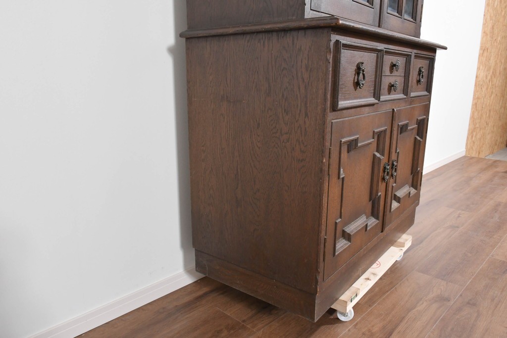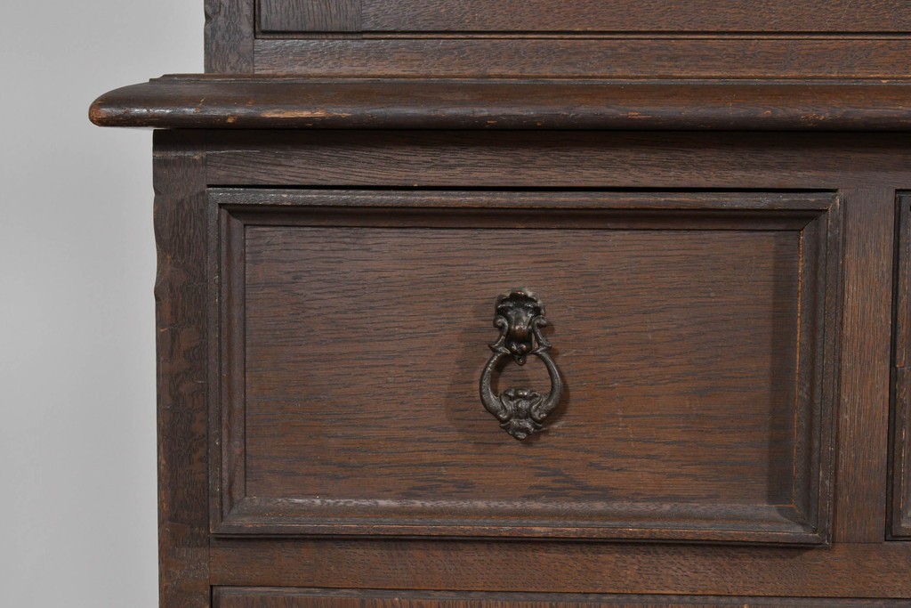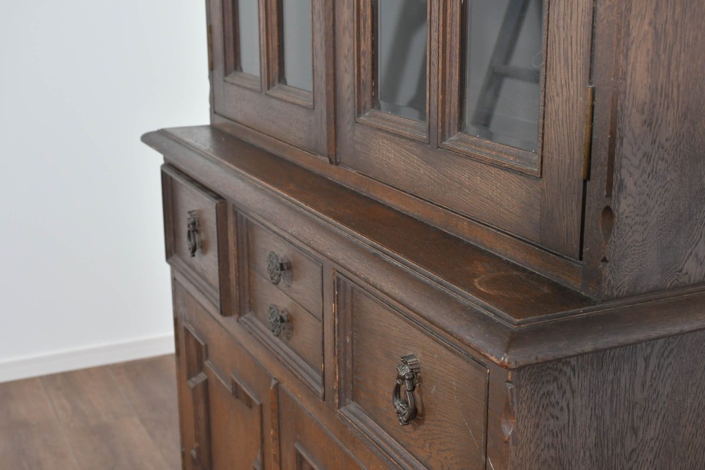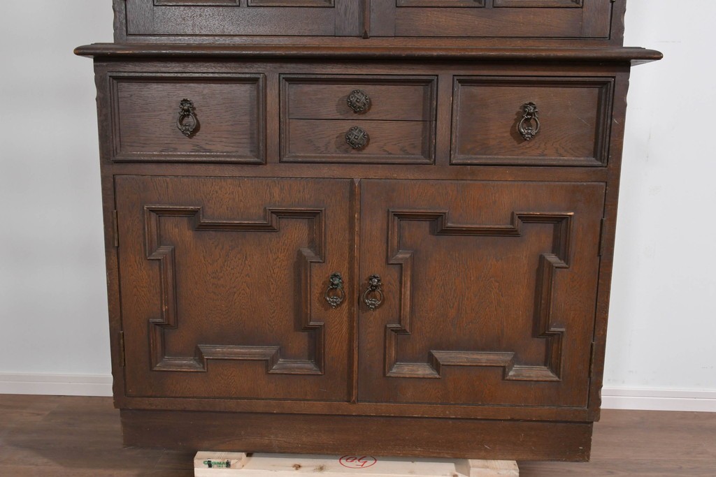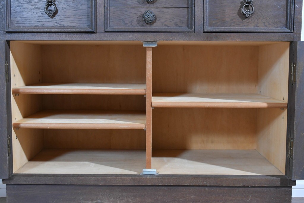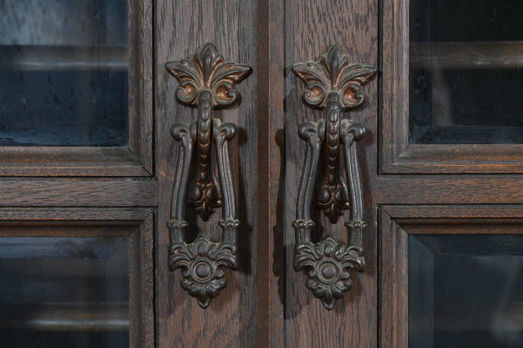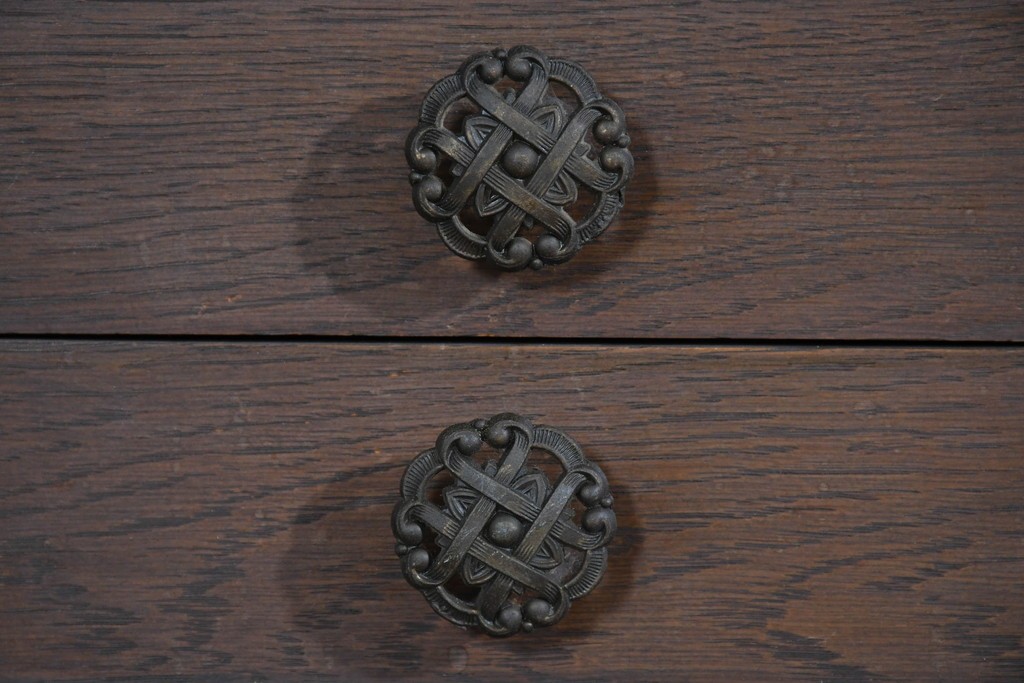扉や引き出しには、立体的に彫り込まれた装飾や趣ある金具が用いられており、家具全体に深みのある表情を与えています。細部の仕上げが丁寧で、長く使われてきた家具がもつ落ち着いた雰囲気を感じさせてくれるつくりです。