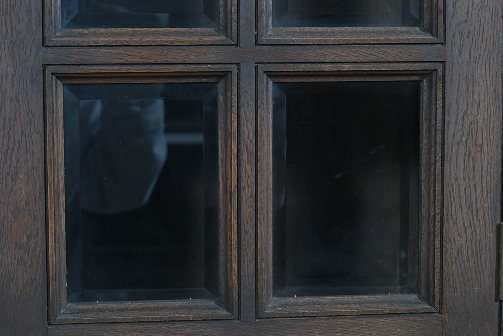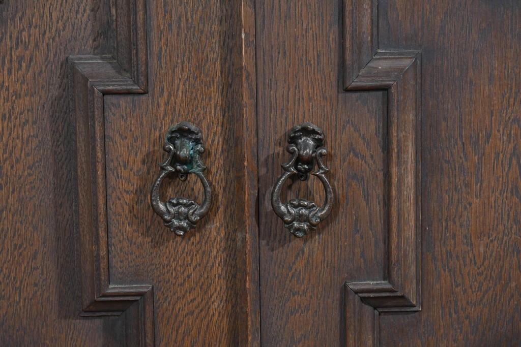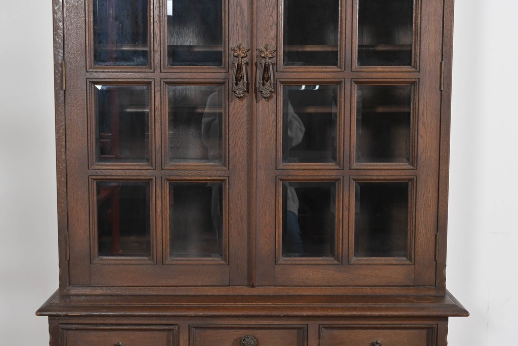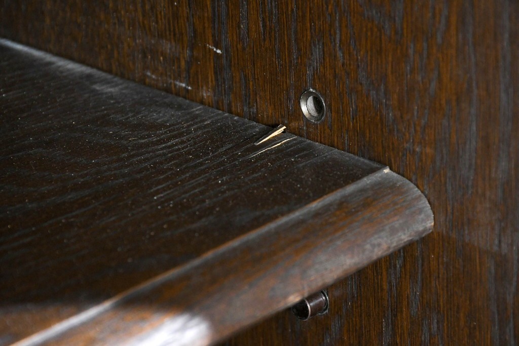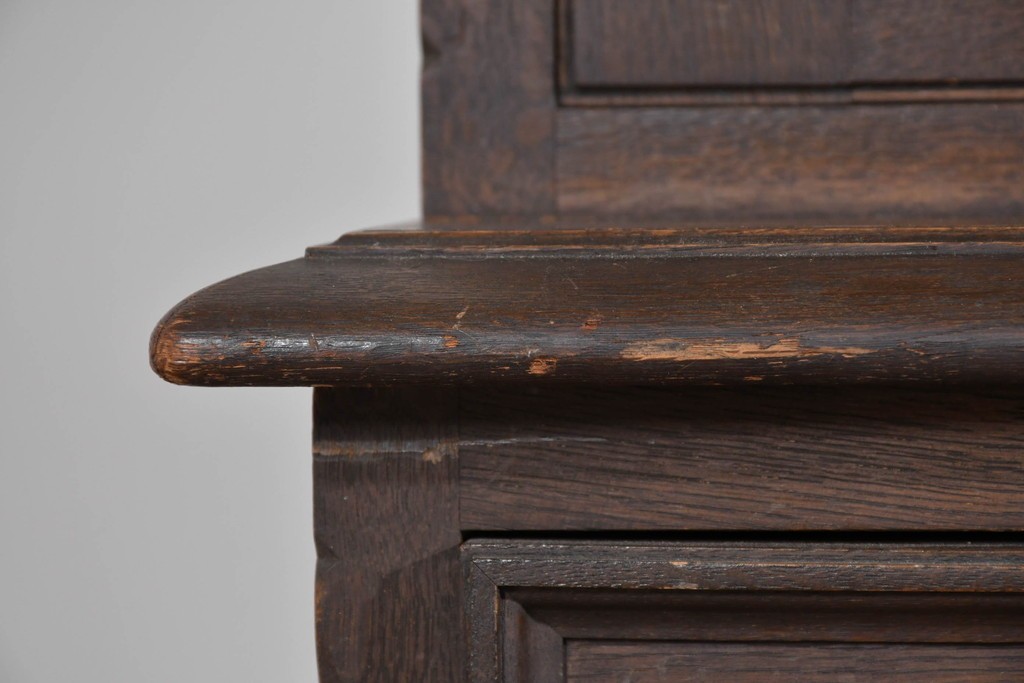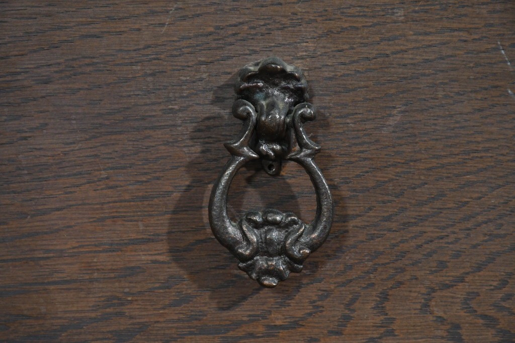 扉や引き出しには、立体的に彫り込まれた装飾や趣ある金具が用いられており、家具全体に深みのある表情を与えています。細部の仕上げが丁寧で、長く使われてきた家具がもつ落ち着いた雰囲気を感じさせてくれるつくりです。
