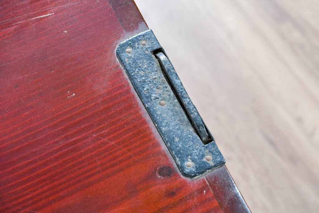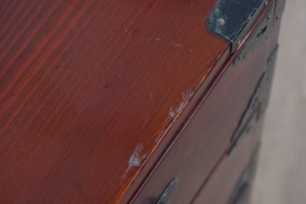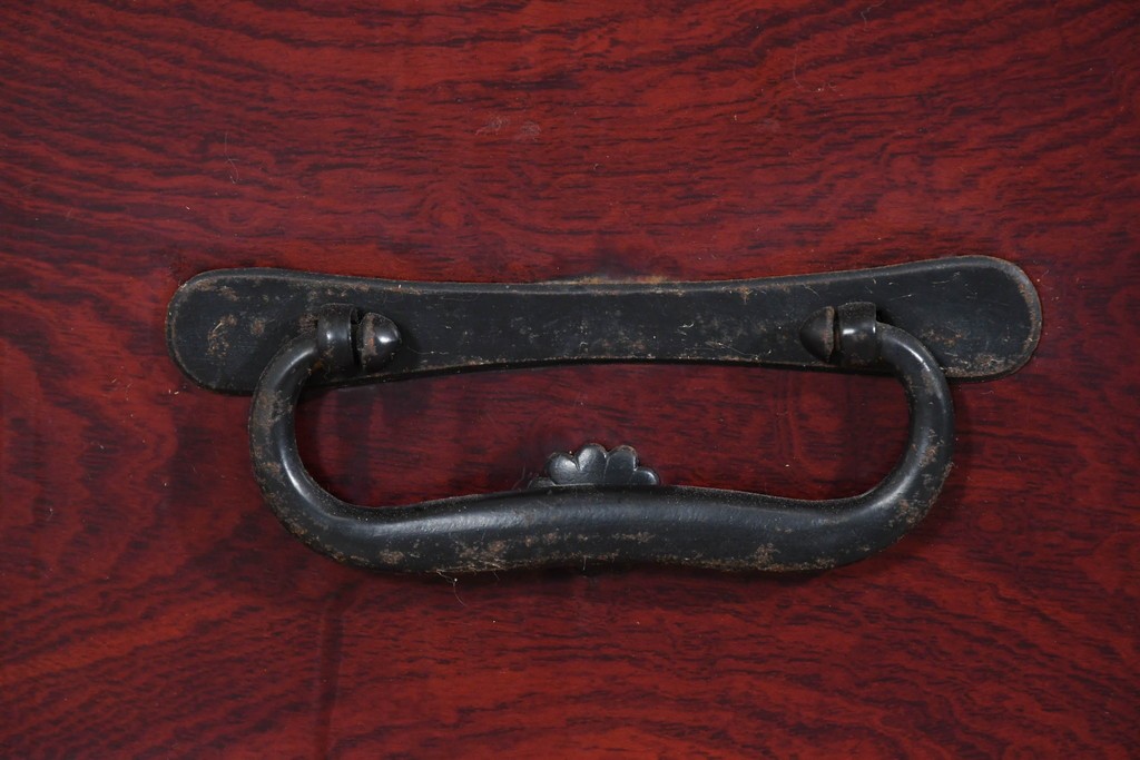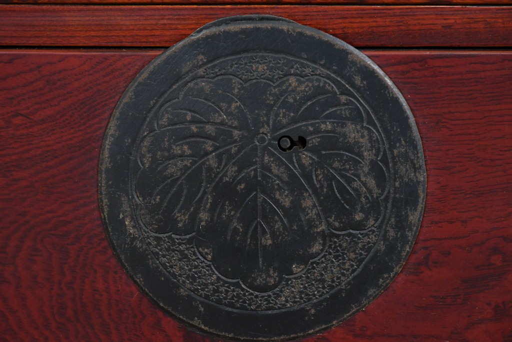 重厚な鉄金具が配置され、丸金具の意匠が全体の表情を引き締めながら美しさを添えています。