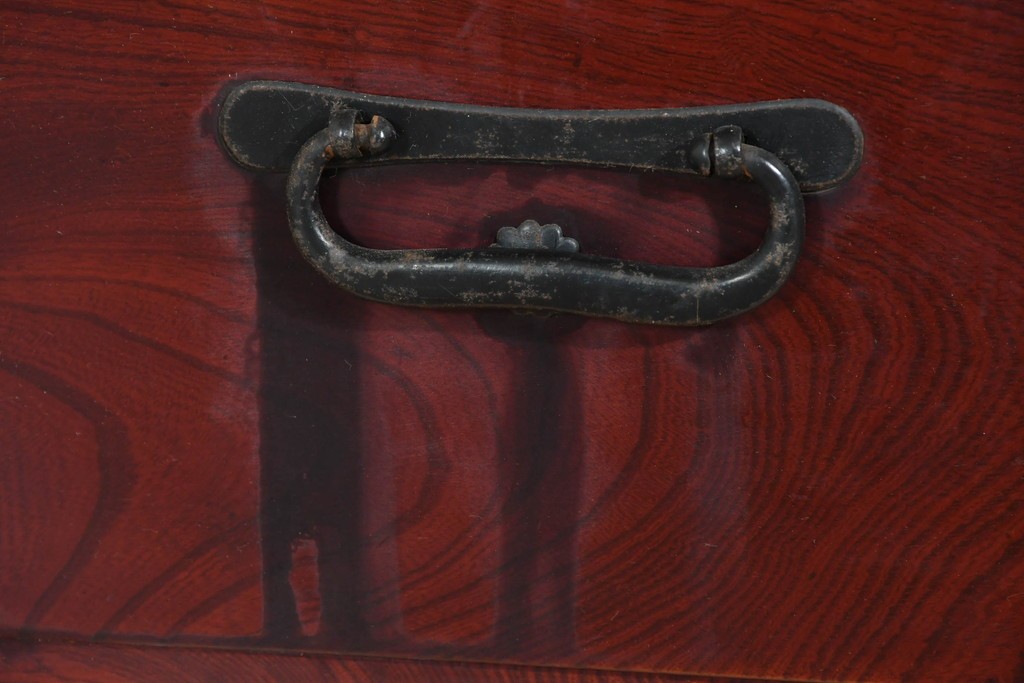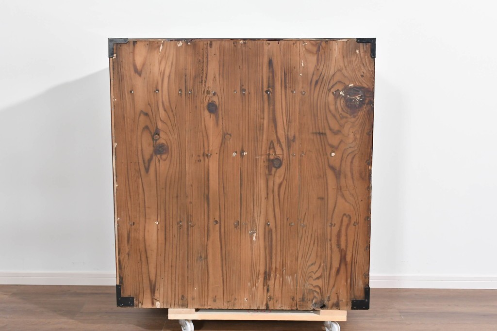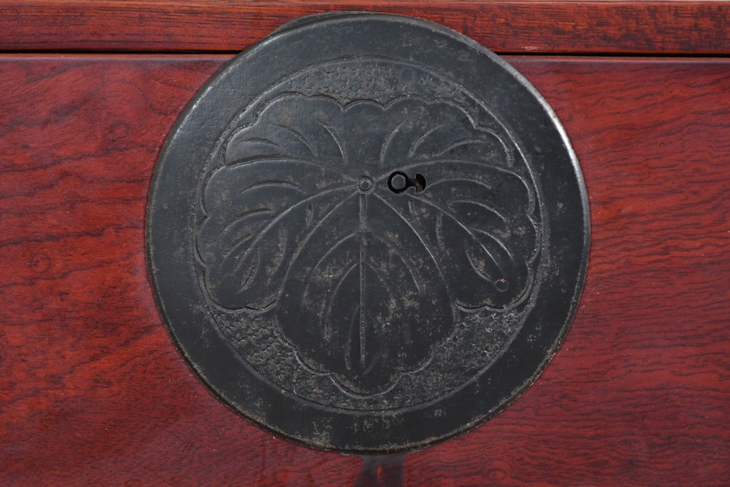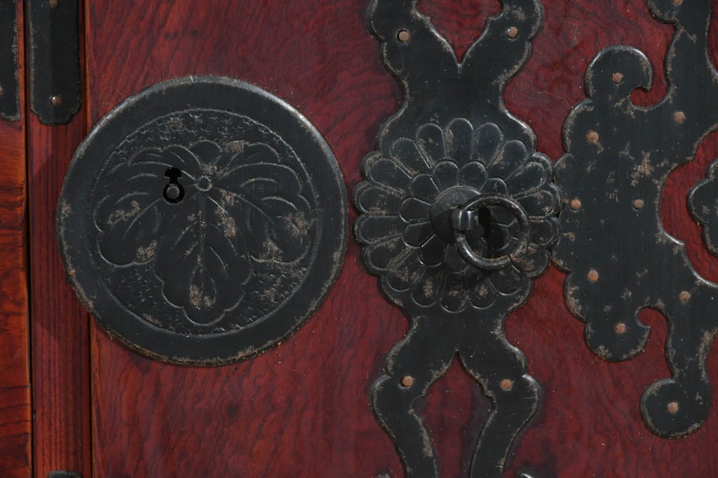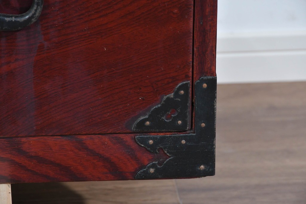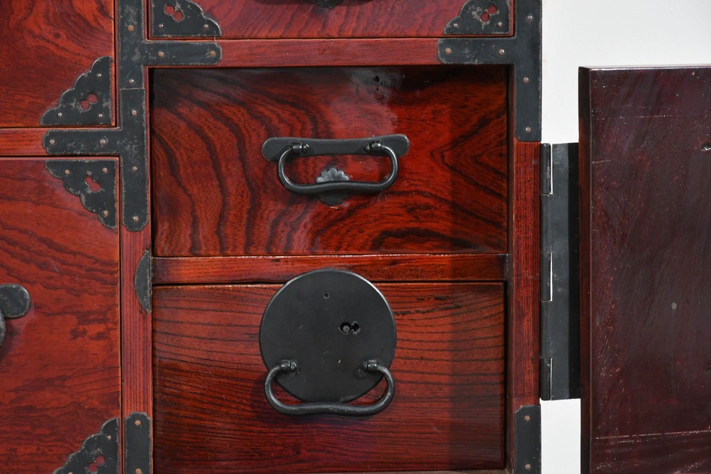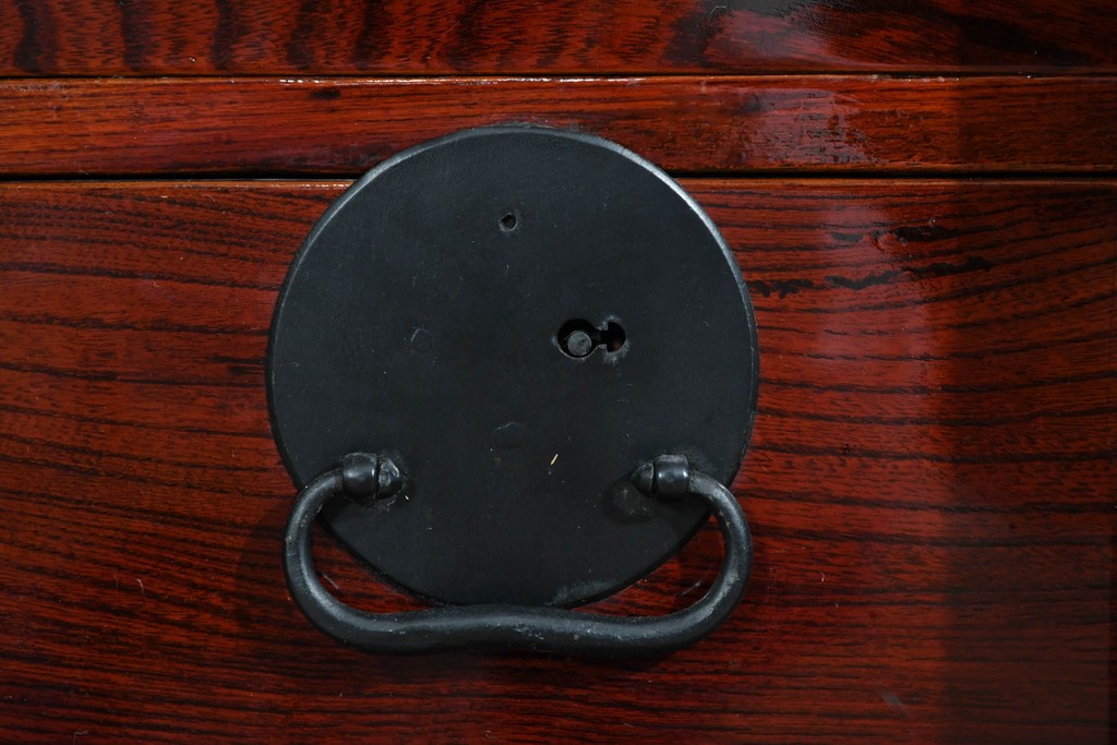 前面には欅材が用いられ、荒々しくも美しい木目が浮かび上がり、深い色合いと相まって時代家具ならではの風格を感じさせます。