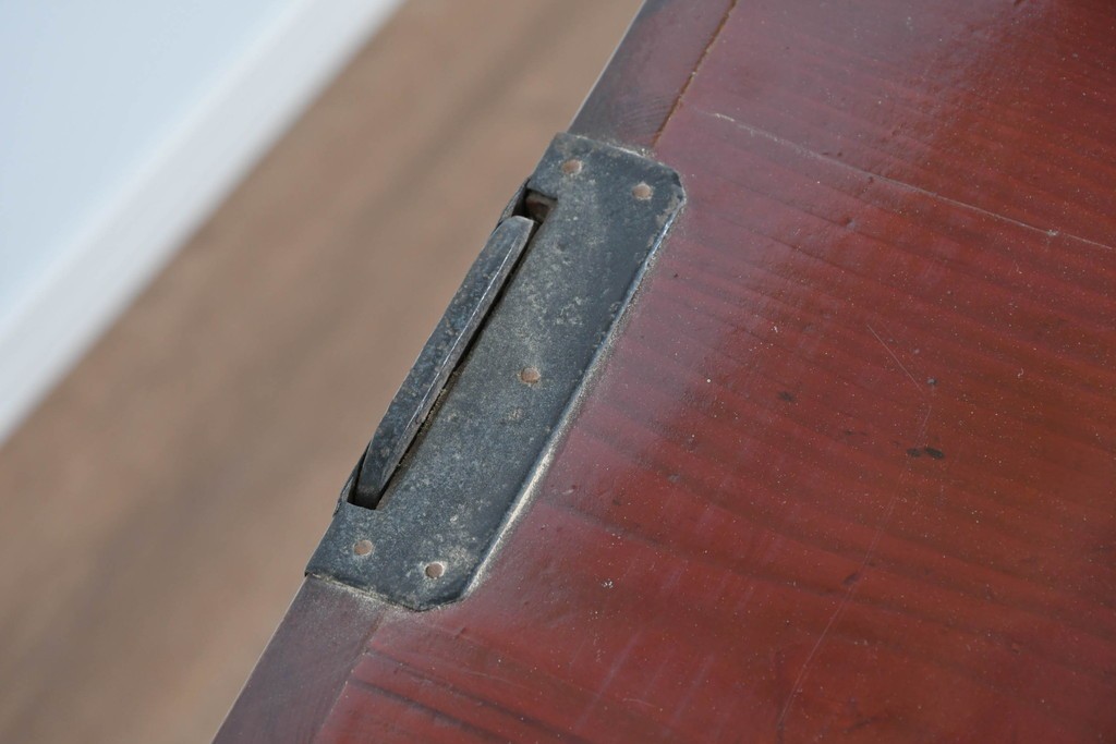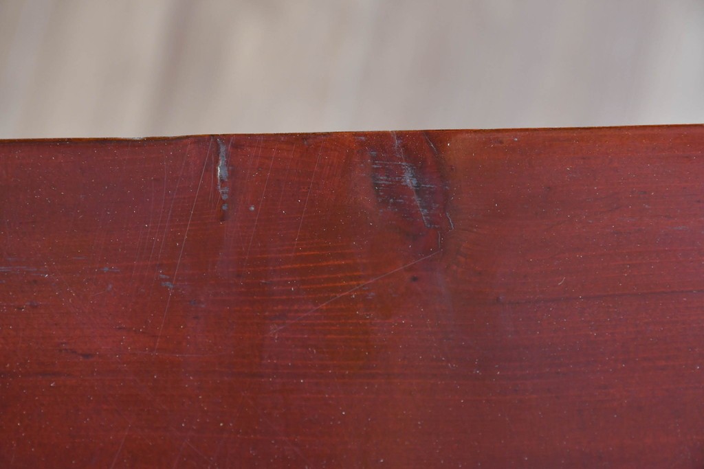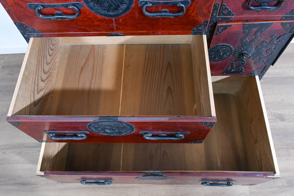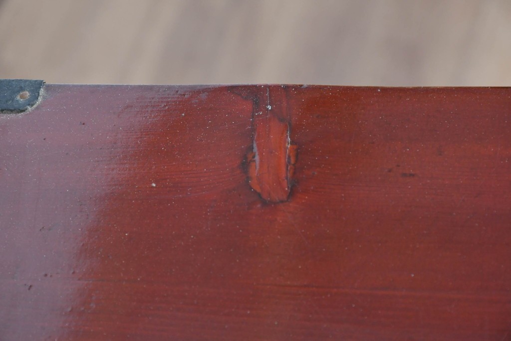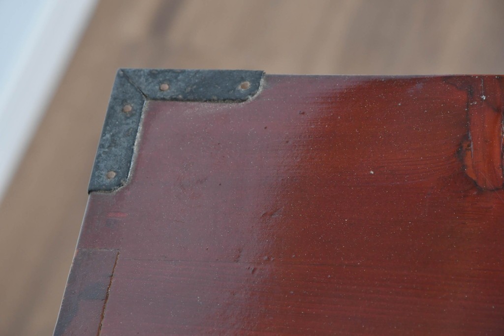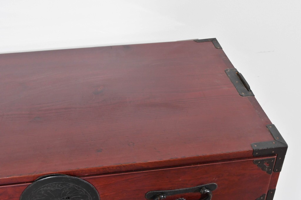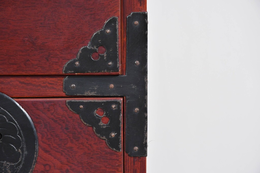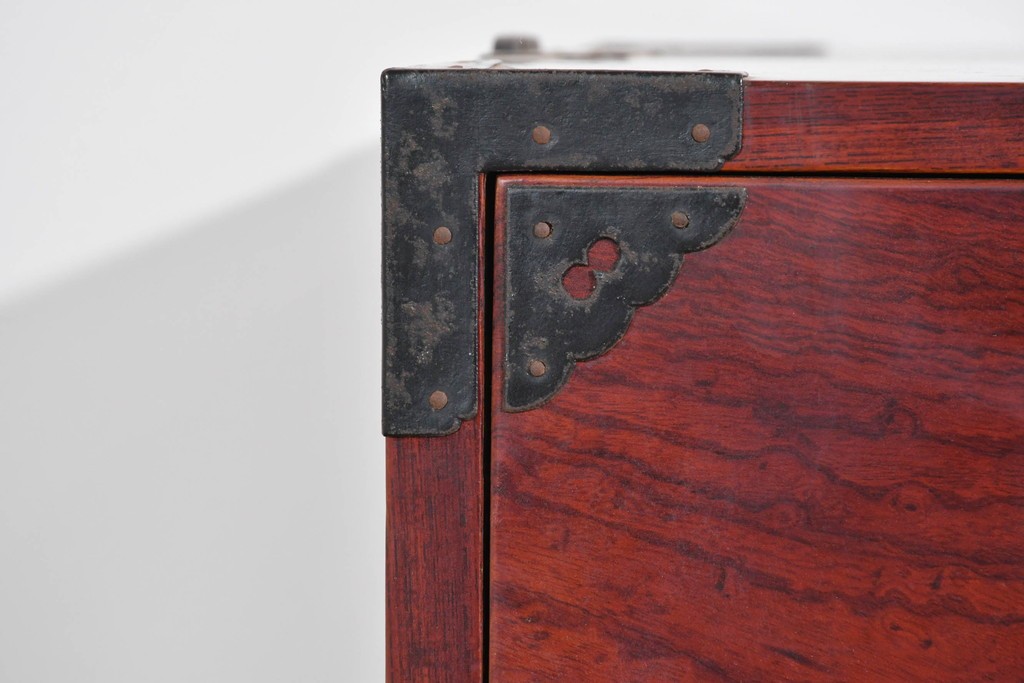 前面には欅材が用いられ、荒々しくも美しい木目が浮かび上がり、深い色合いと相まって時代家具ならではの風格を感じさせます。
