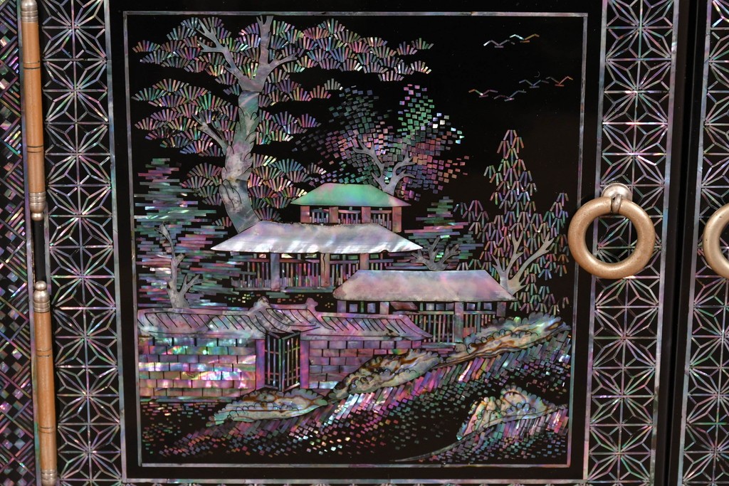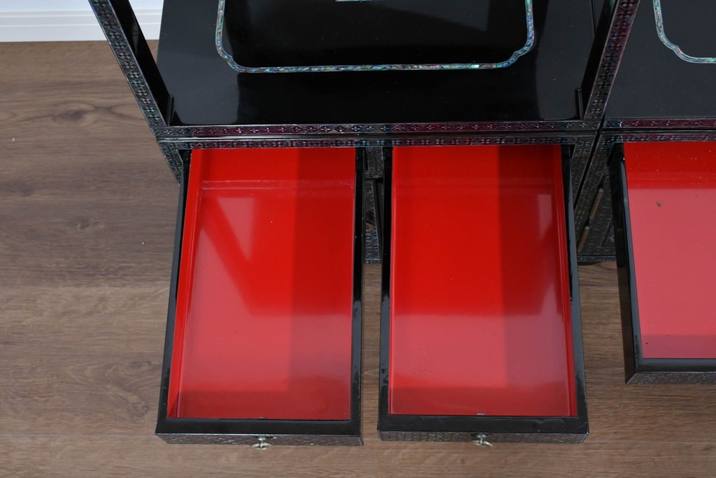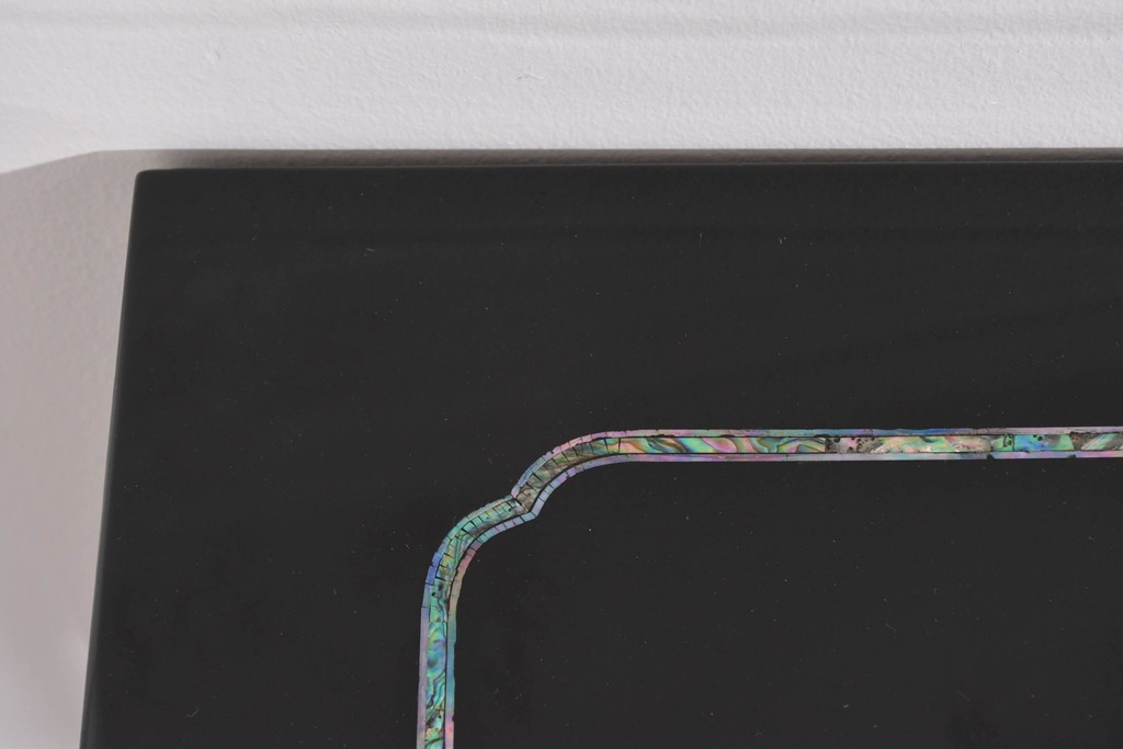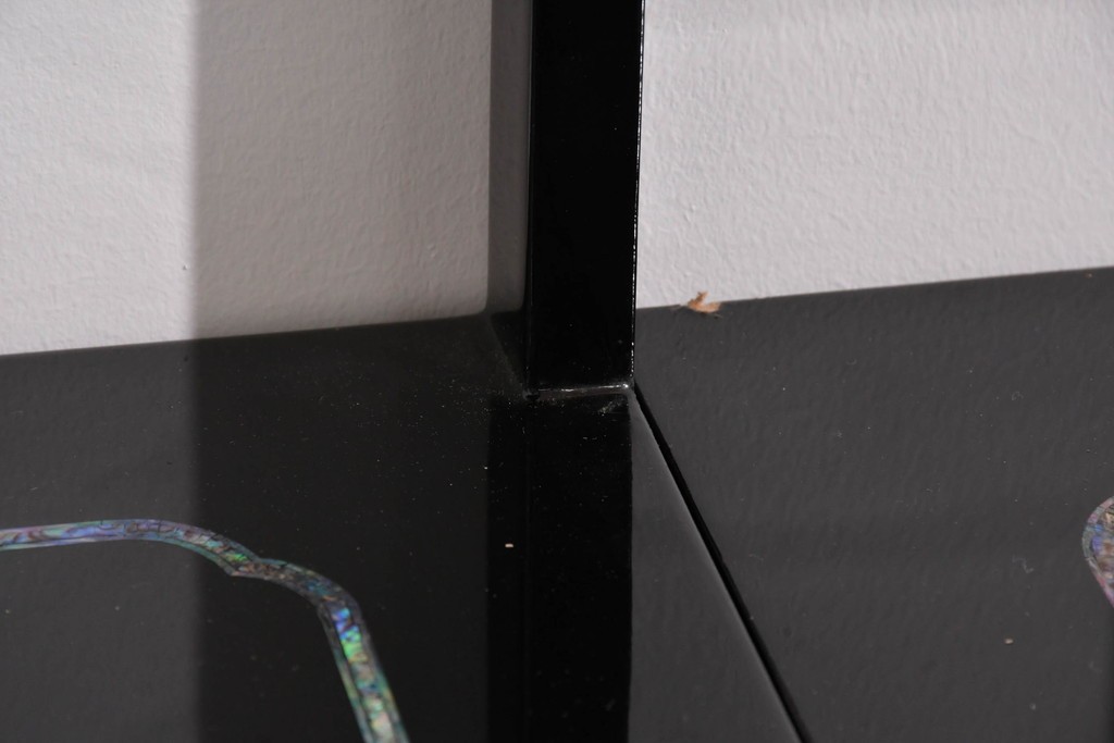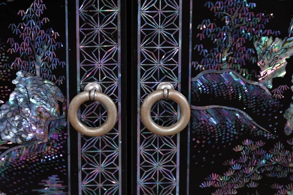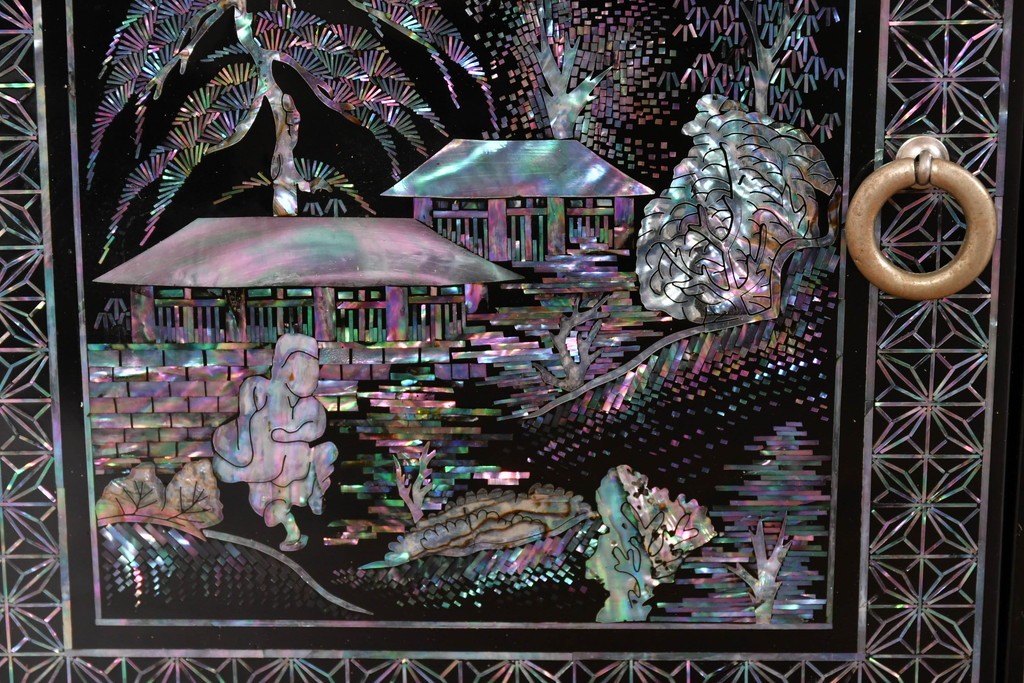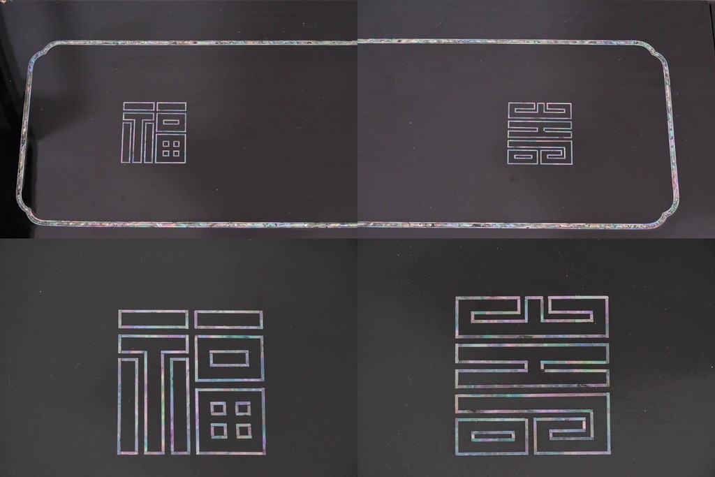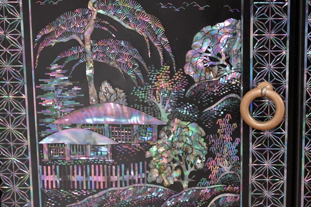 前面に施された細やかな螺鈿装飾が大きな魅力です。角度によって表情を変える煌びやかな光は、空間に静かな存在感をもたらします。図柄も丁寧に配置され、落ち着きある黒を基調とした本体に映える美しい意匠となっています。