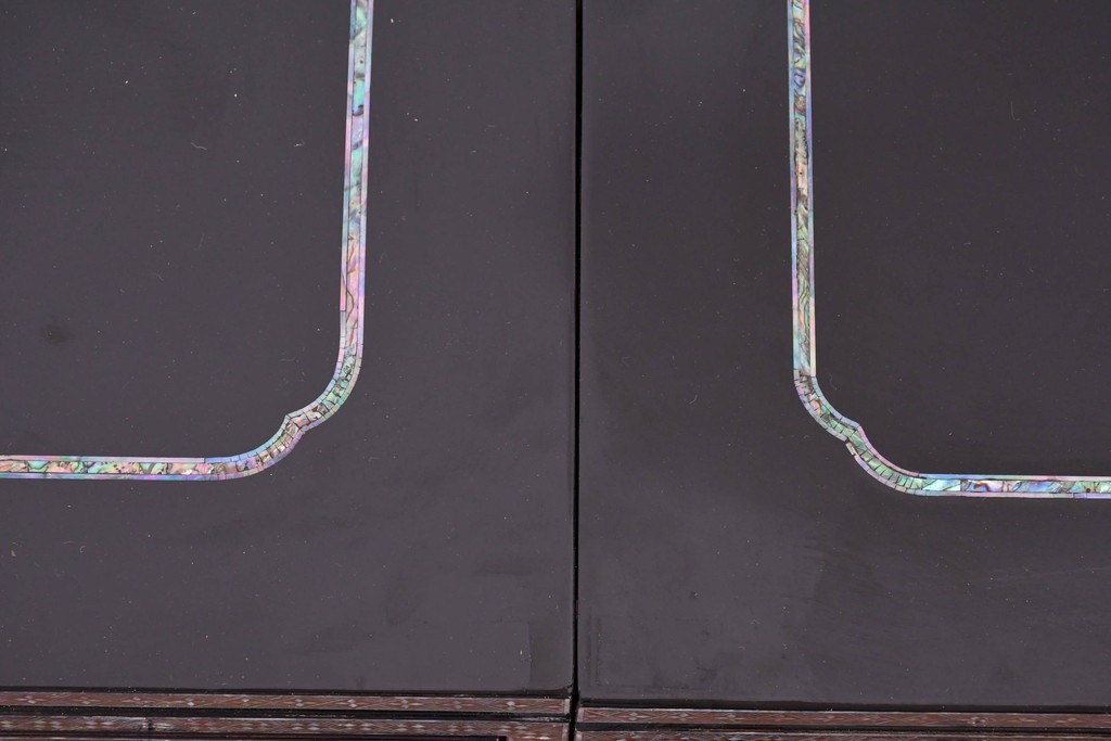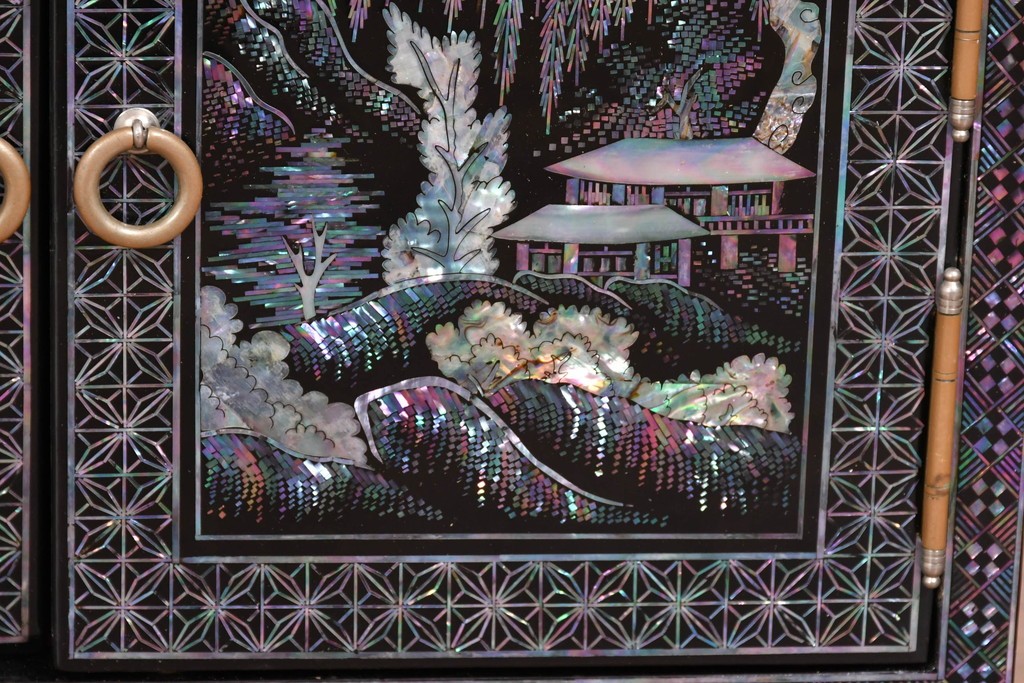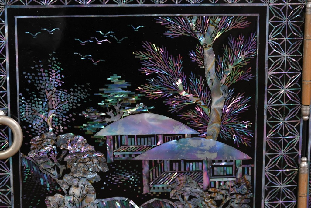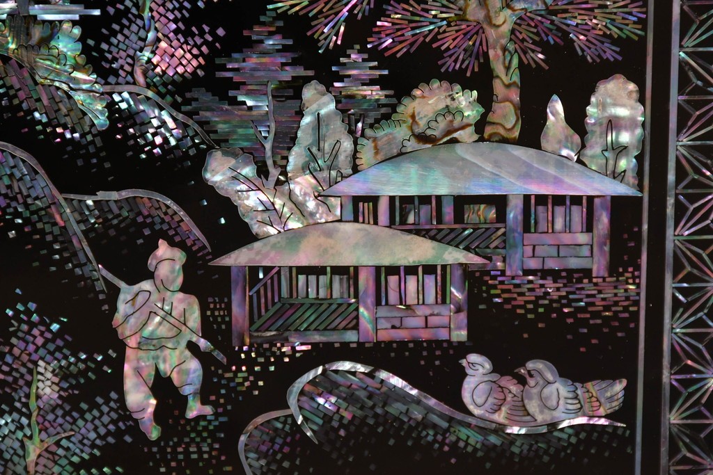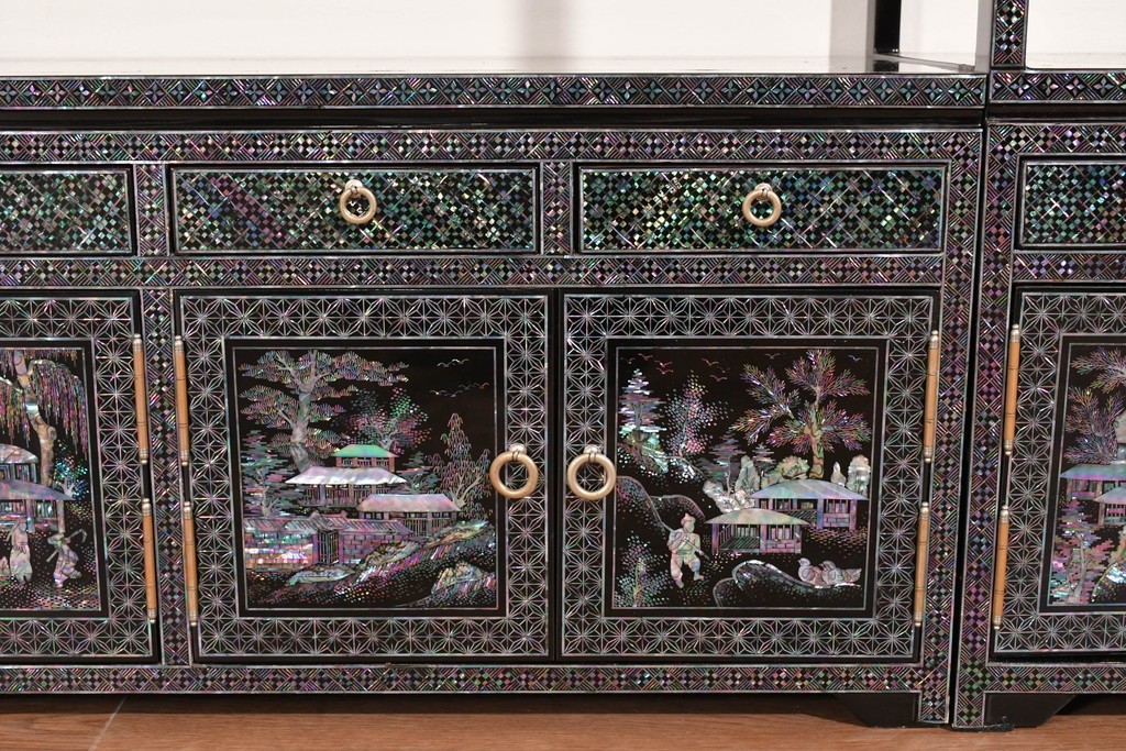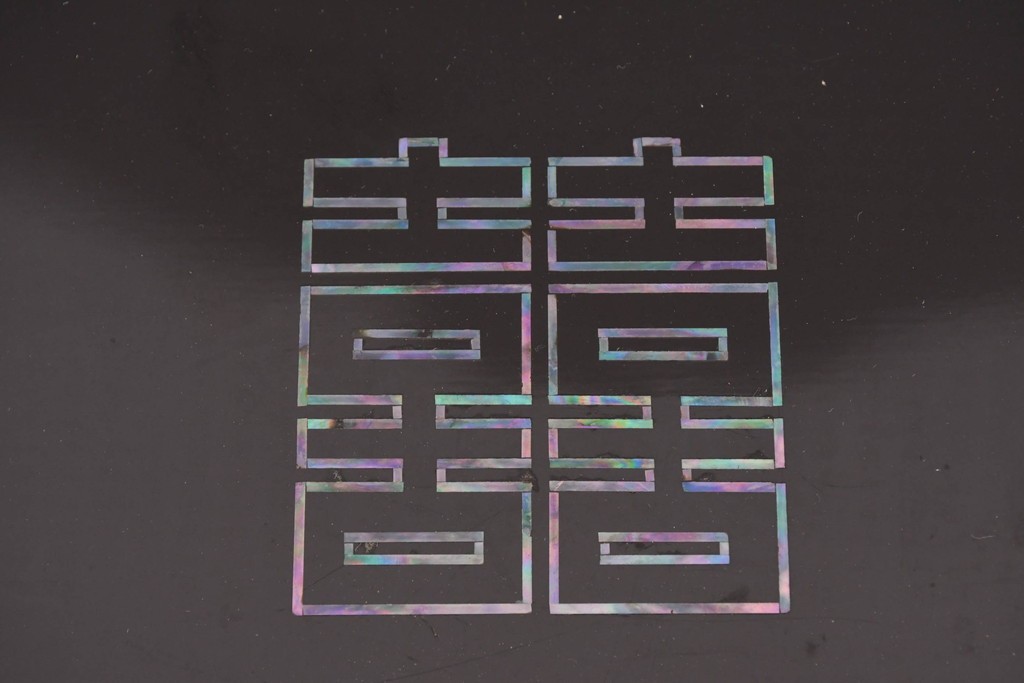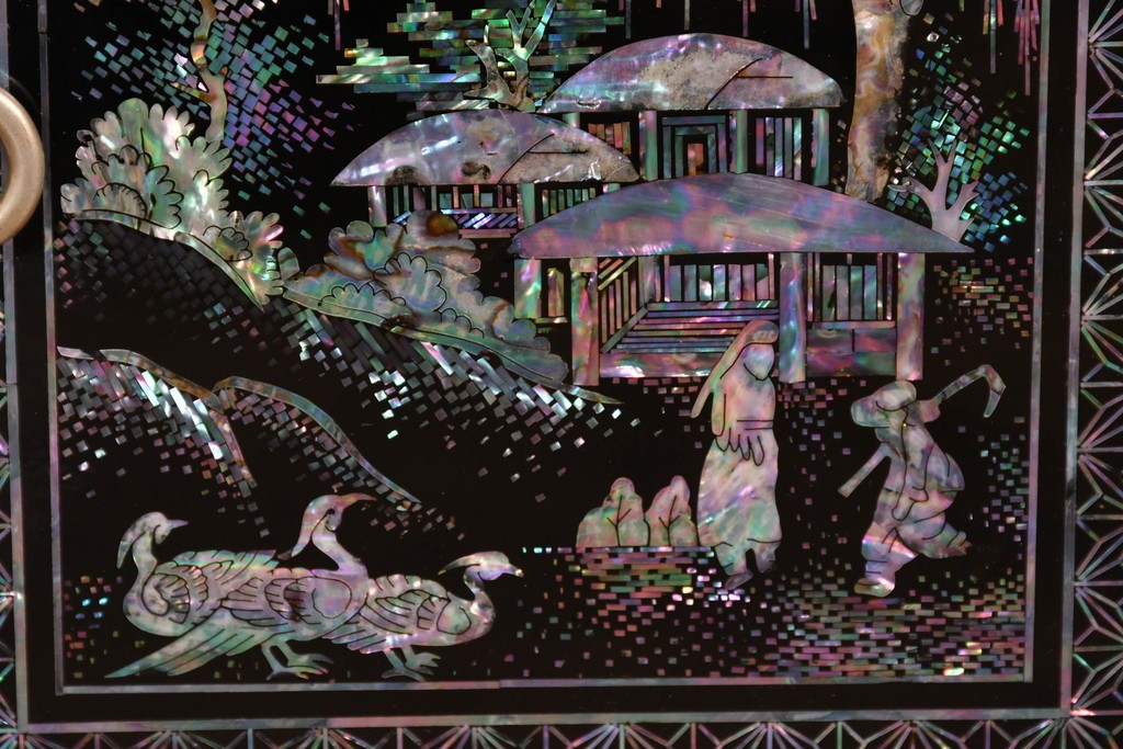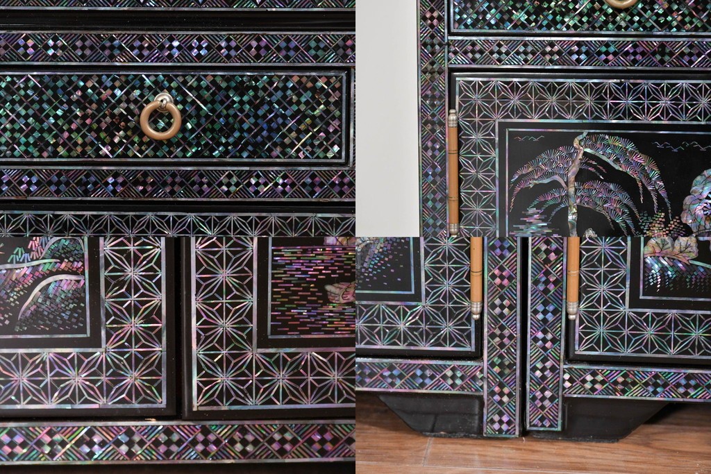 前面に施された細やかな螺鈿装飾が大きな魅力です。角度によって表情を変える煌びやかな光は、空間に静かな存在感をもたらします。図柄も丁寧に配置され、落ち着きある黒を基調とした本体に映える美しい意匠となっています。