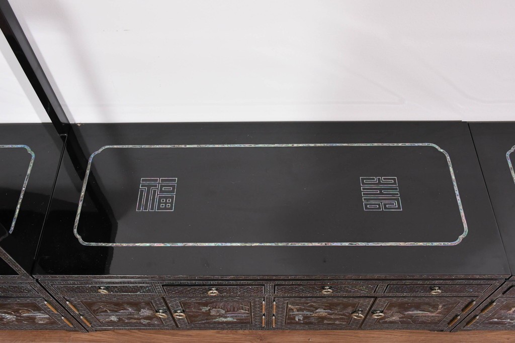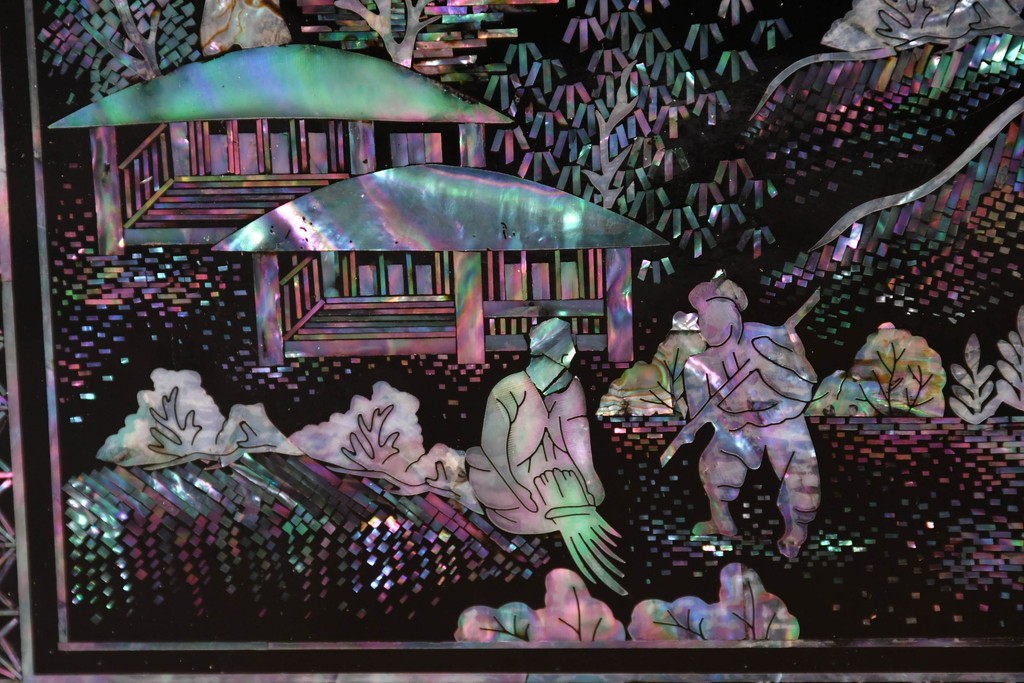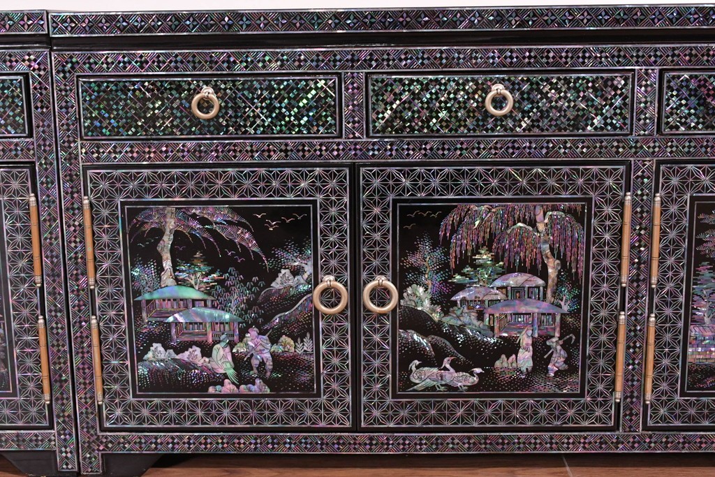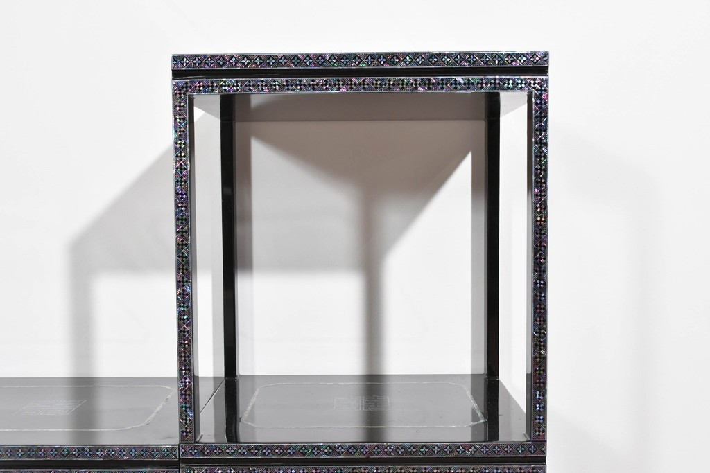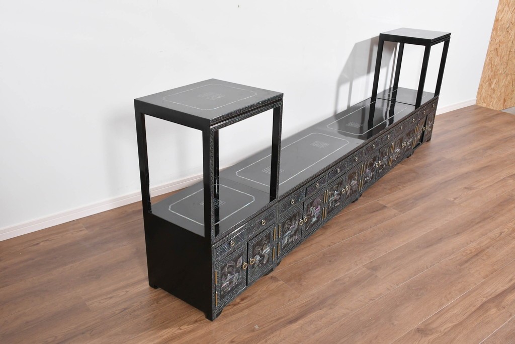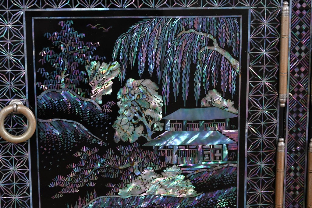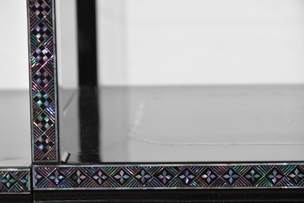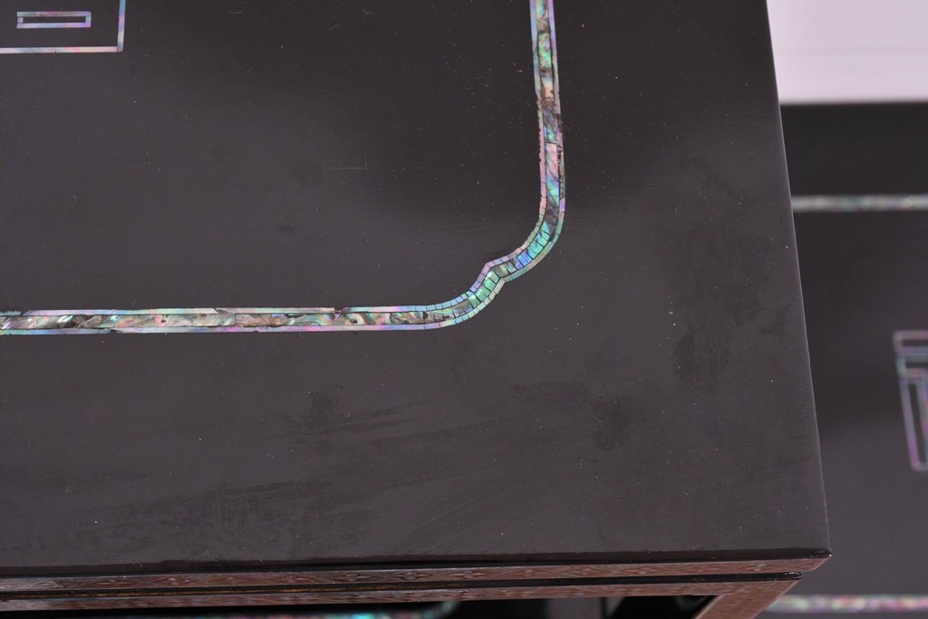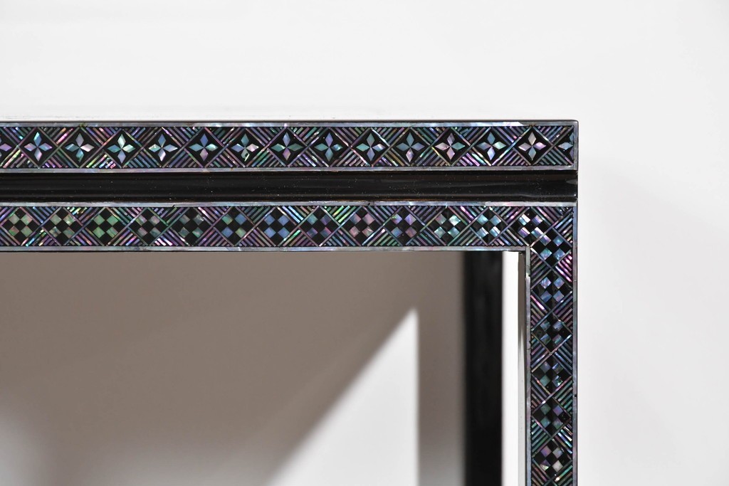 前面に施された細やかな螺鈿装飾が大きな魅力です。角度によって表情を変える煌びやかな光は、空間に静かな存在感をもたらします。図柄も丁寧に配置され、落ち着きある黒を基調とした本体に映える美しい意匠となっています。