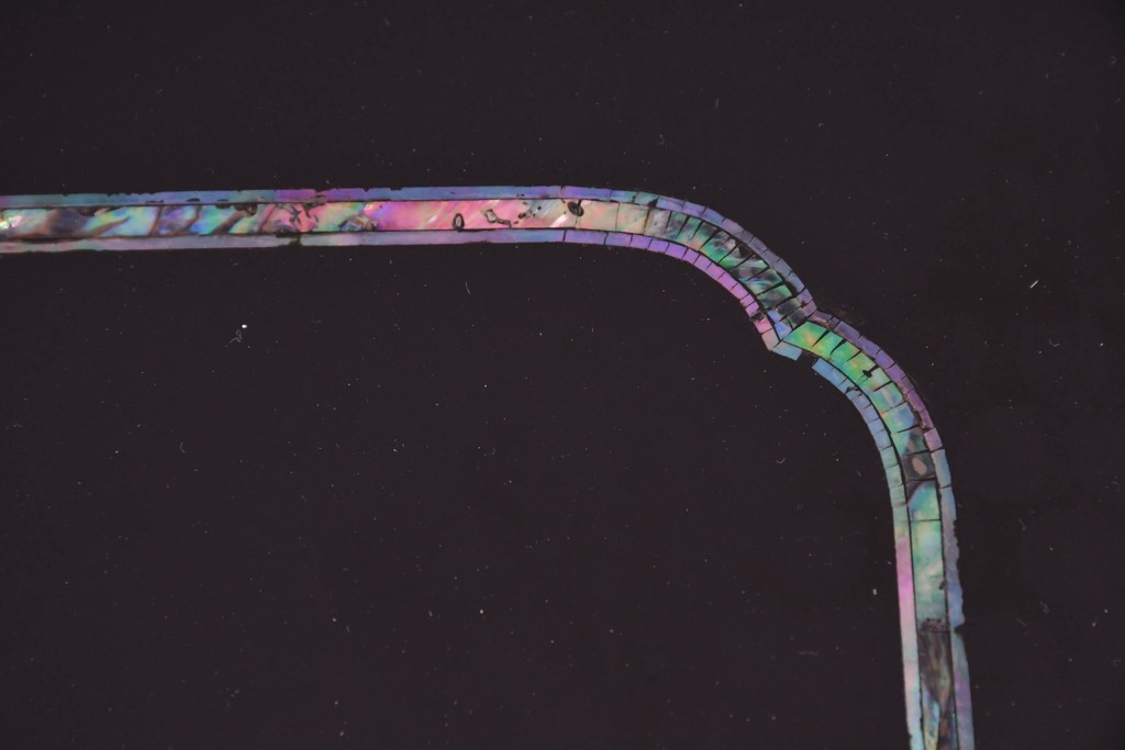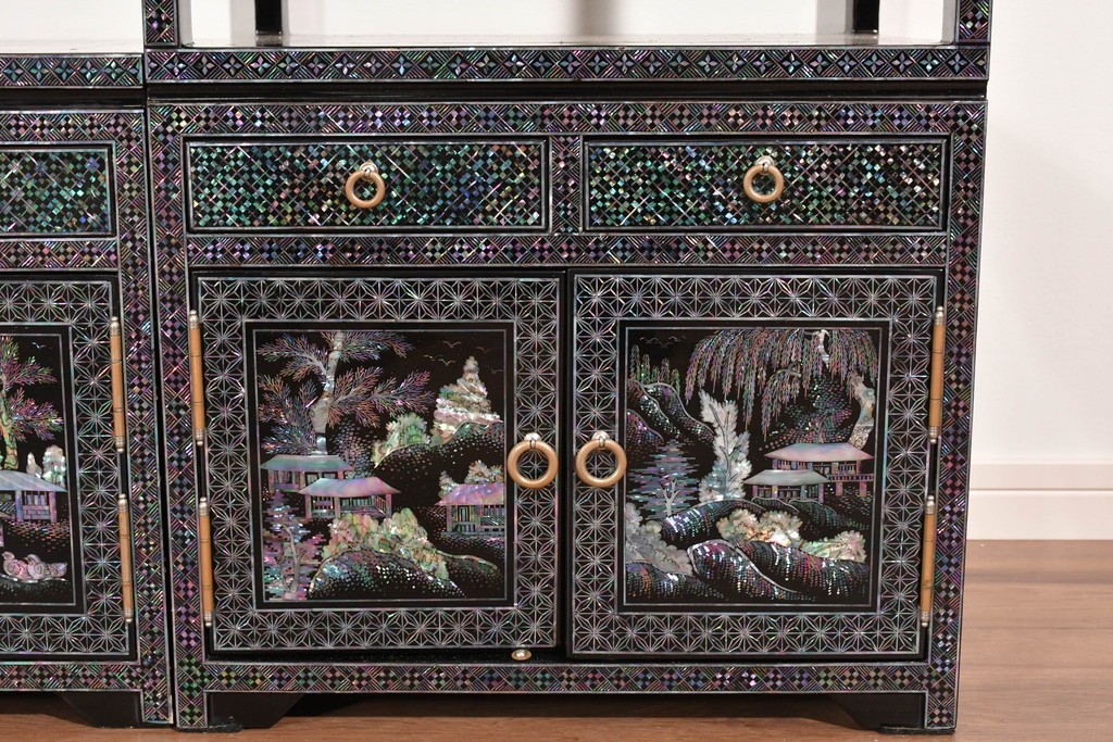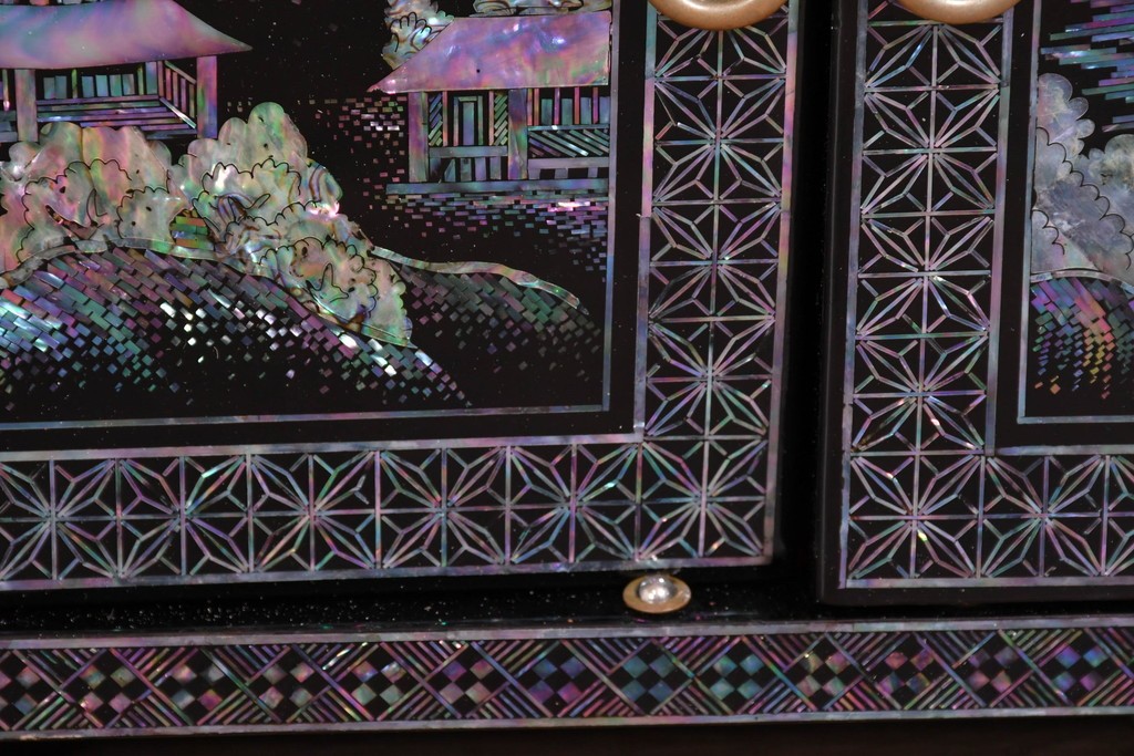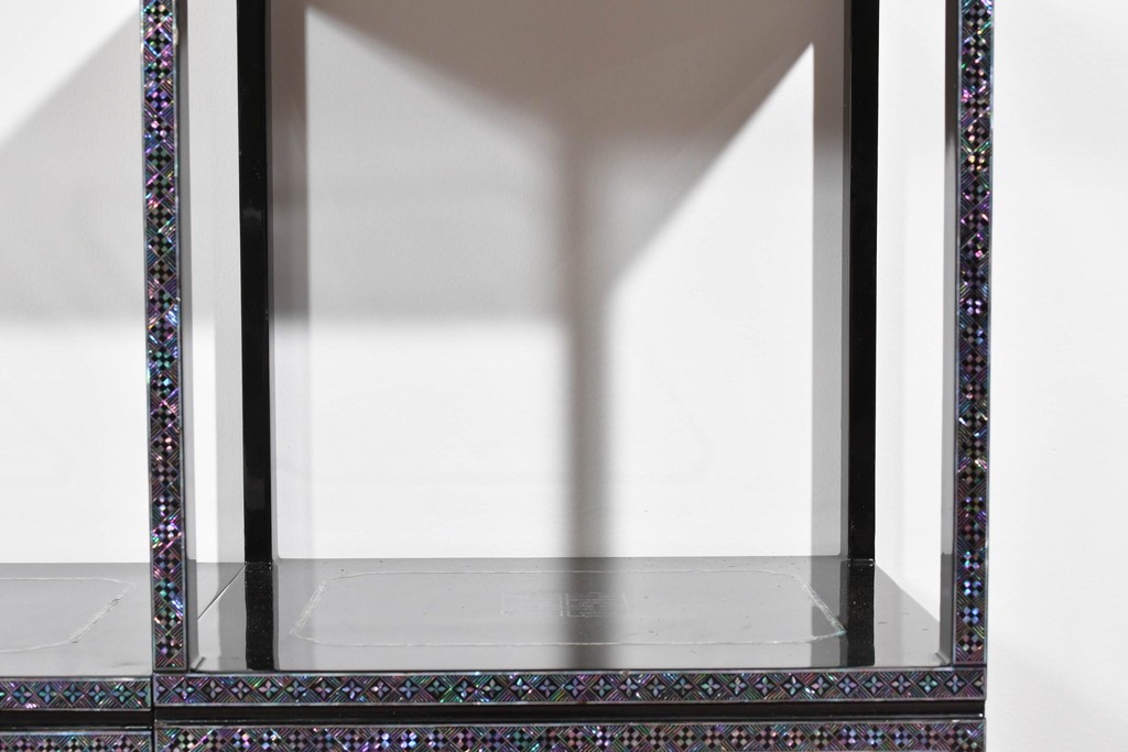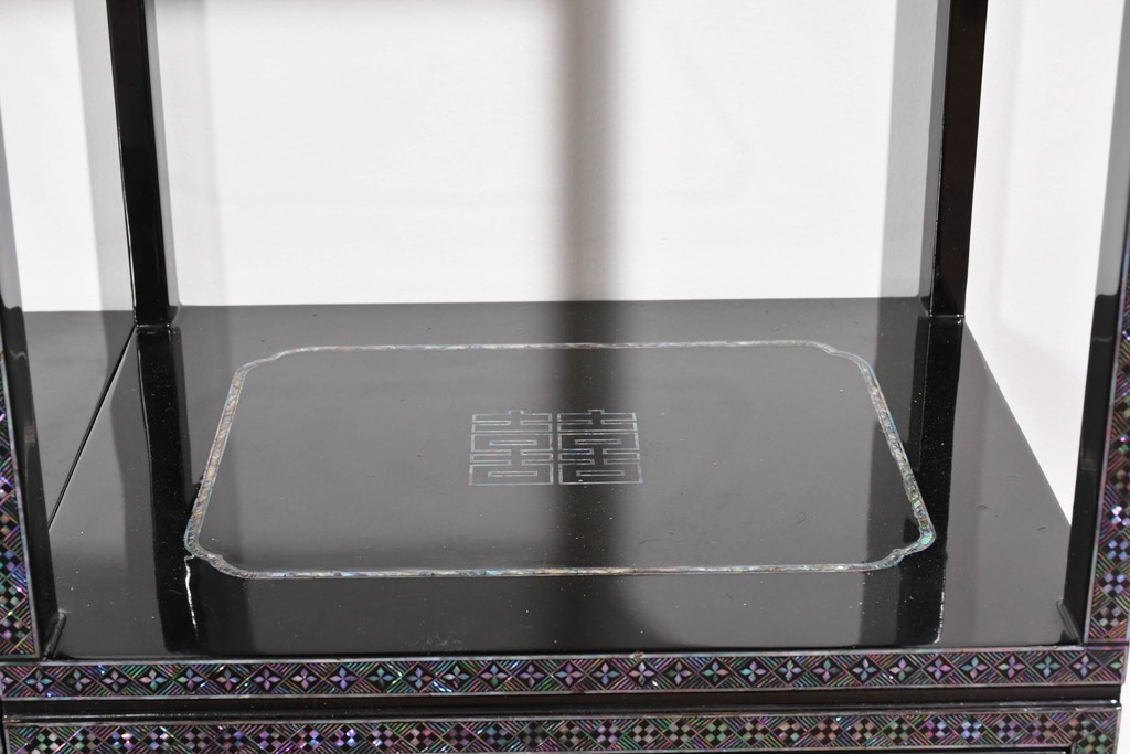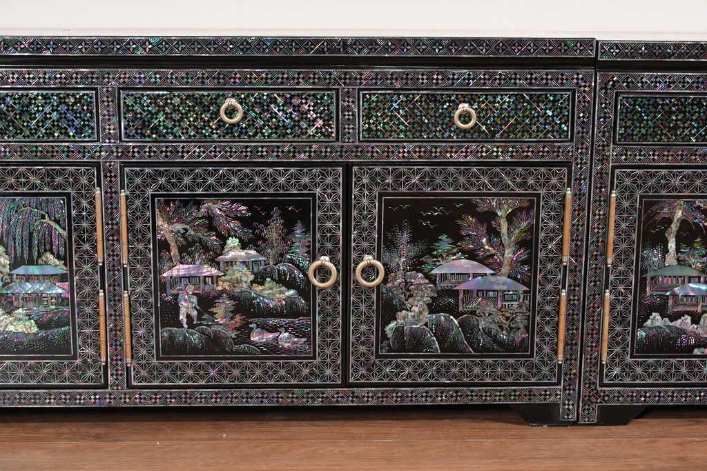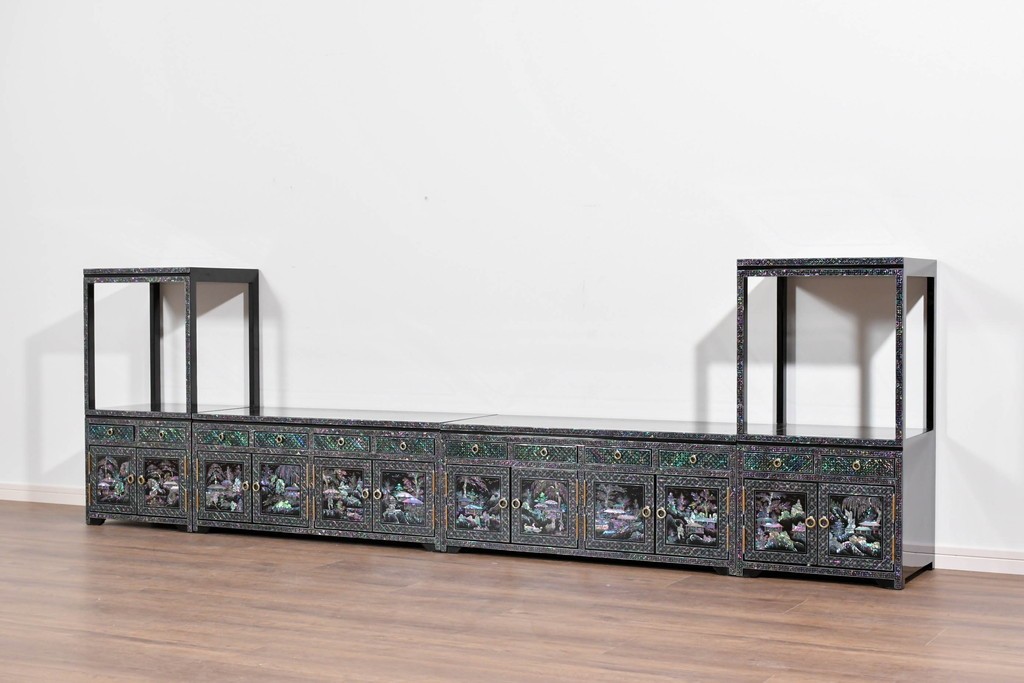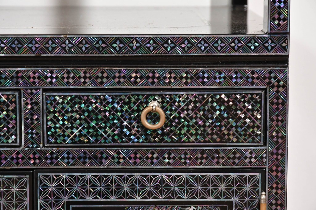 前面に施された細やかな螺鈿装飾が大きな魅力です。角度によって表情を変える煌びやかな光は、空間に静かな存在感をもたらします。図柄も丁寧に配置され、落ち着きある黒を基調とした本体に映える美しい意匠となっています。
