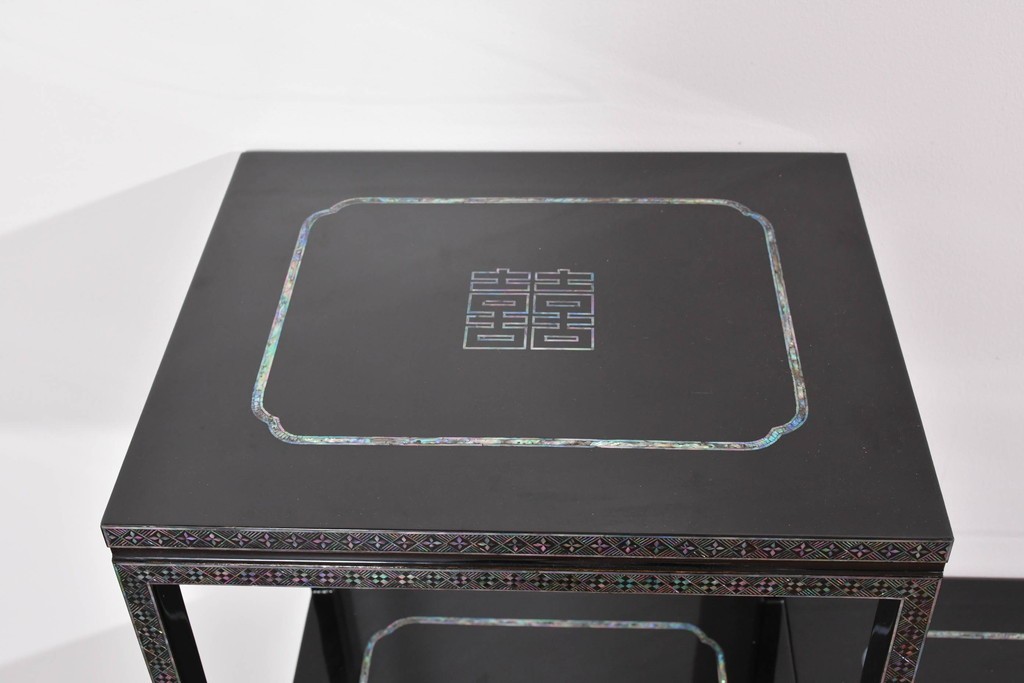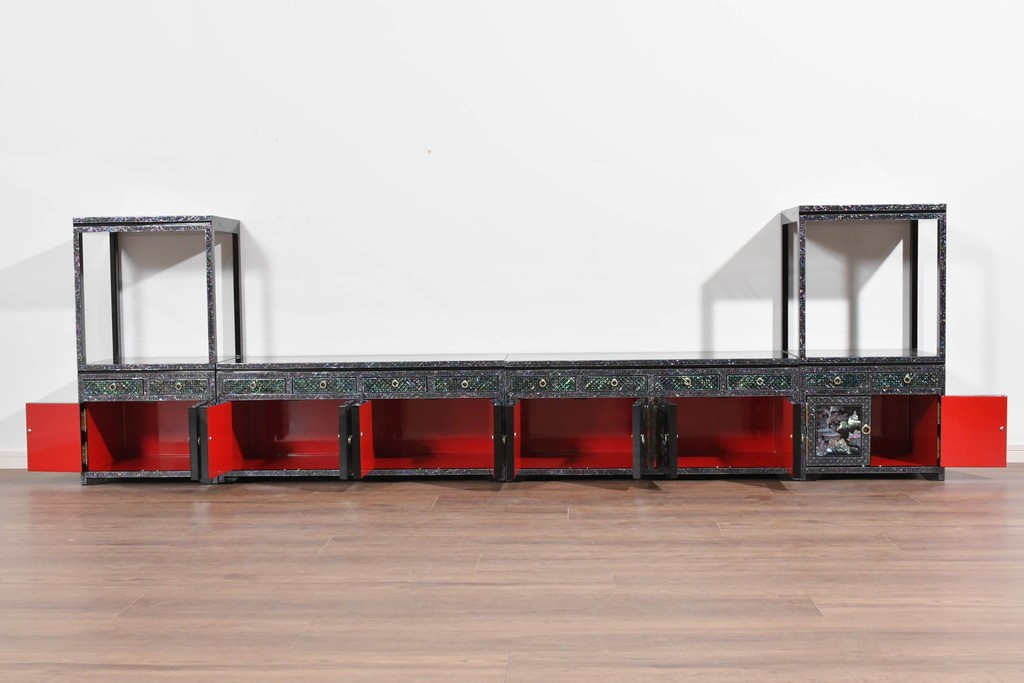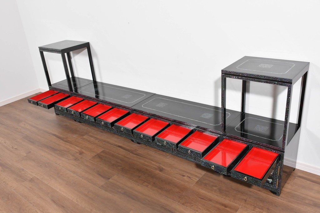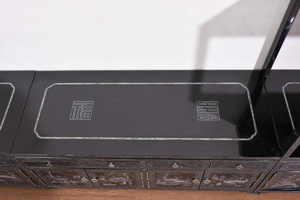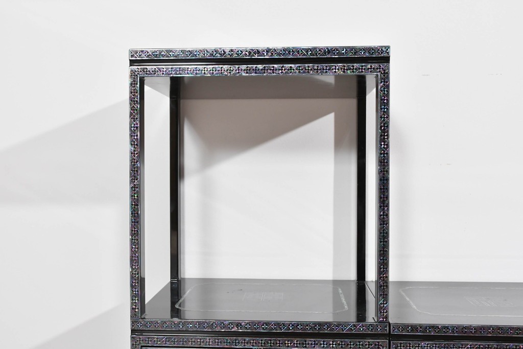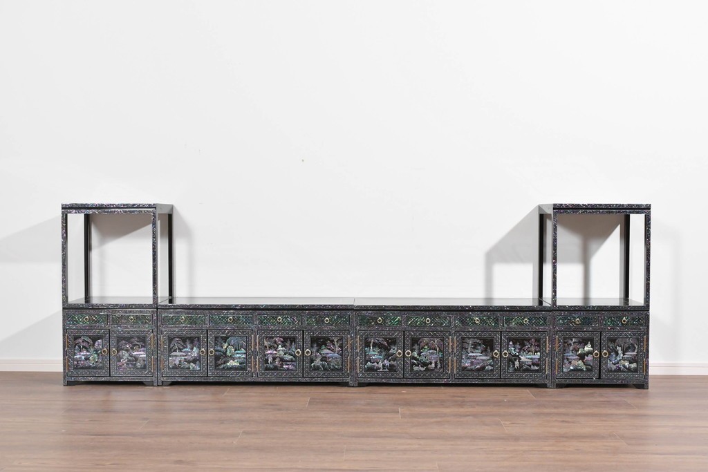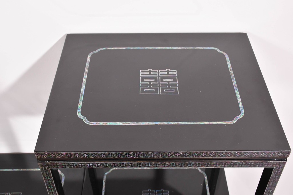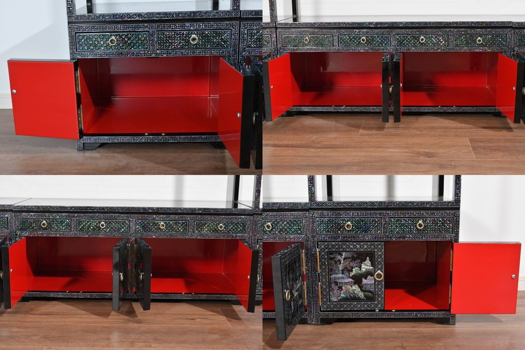 前面に施された細やかな螺鈿装飾が大きな魅力です。角度によって表情を変える煌びやかな光は、空間に静かな存在感をもたらします。図柄も丁寧に配置され、落ち着きある黒を基調とした本体に映える美しい意匠となっています。