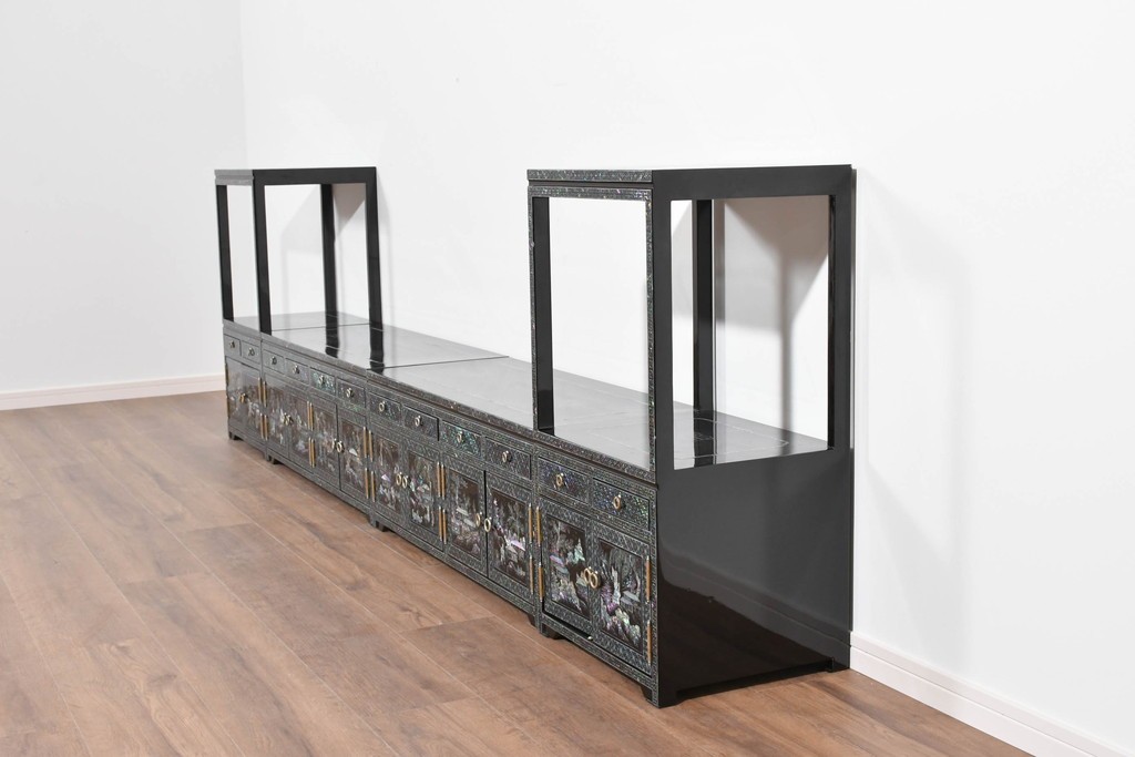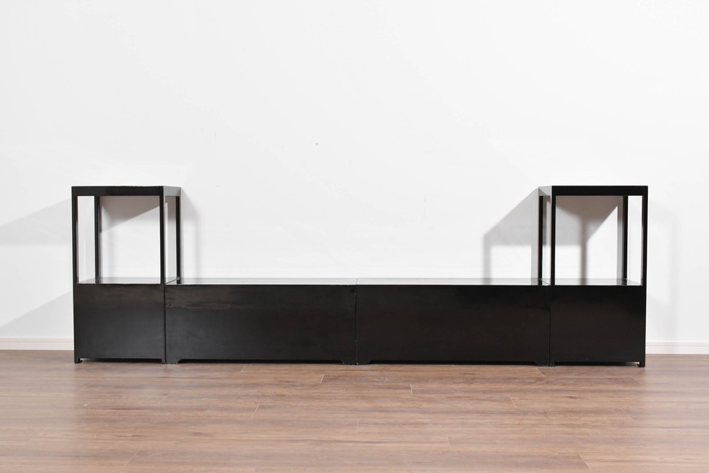 両サイドに設けられたオープン棚は、飾り物やアート作品を引き立てるスペースとして重宝します。中央部分のローボードと併せ、収納とディスプレイをバランスよく両立した構成が魅力です。住まいのレイアウトに合わせて多用途に活躍します。