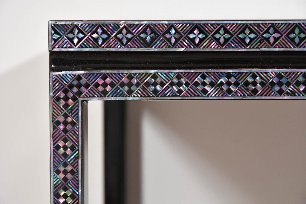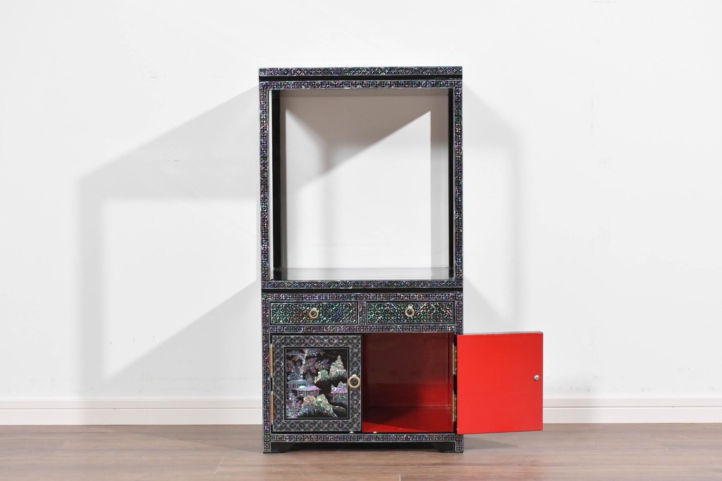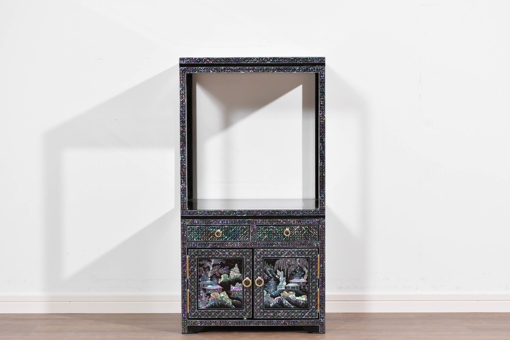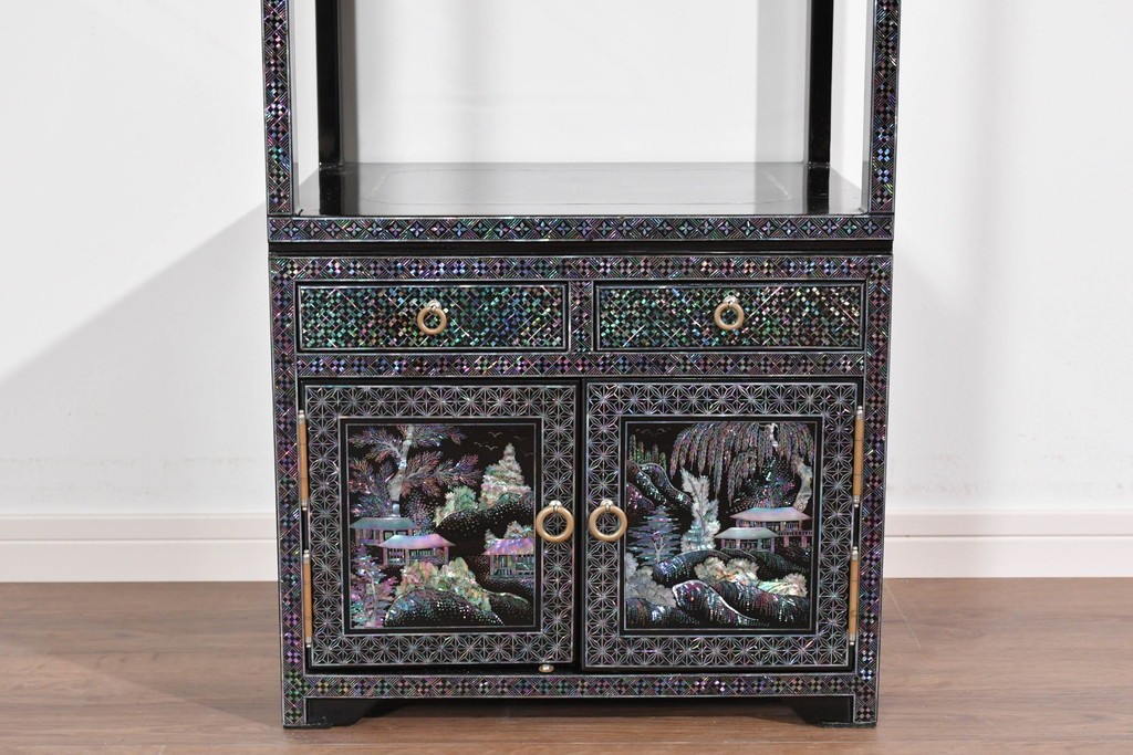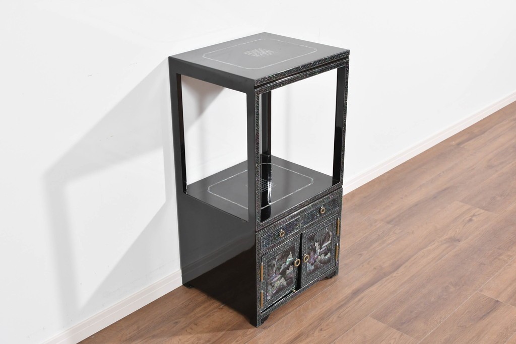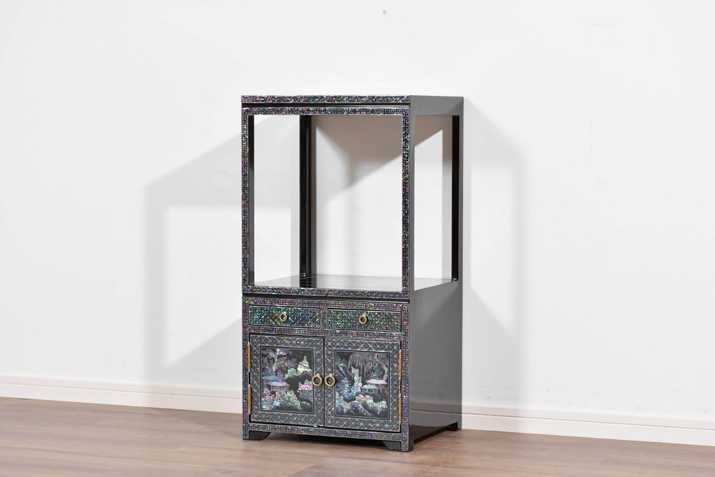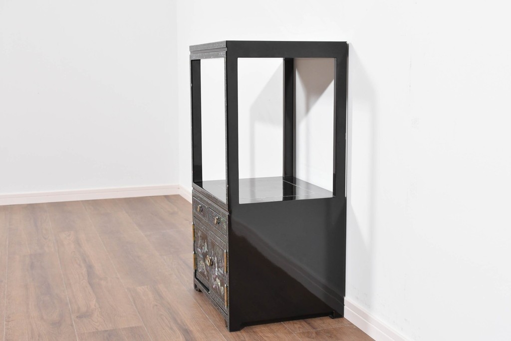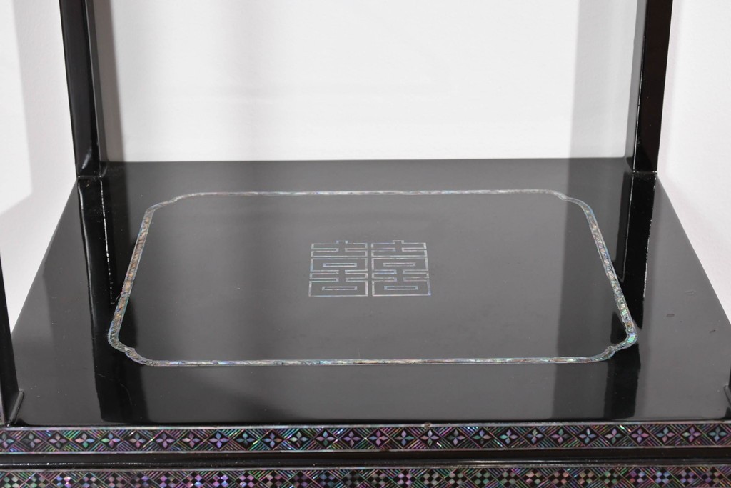 黒塗りの落ち着いた佇まいに、螺鈿細工の輝きが映える飾り棚です。