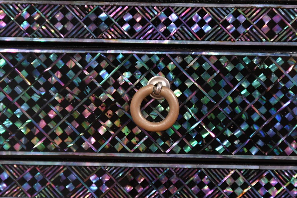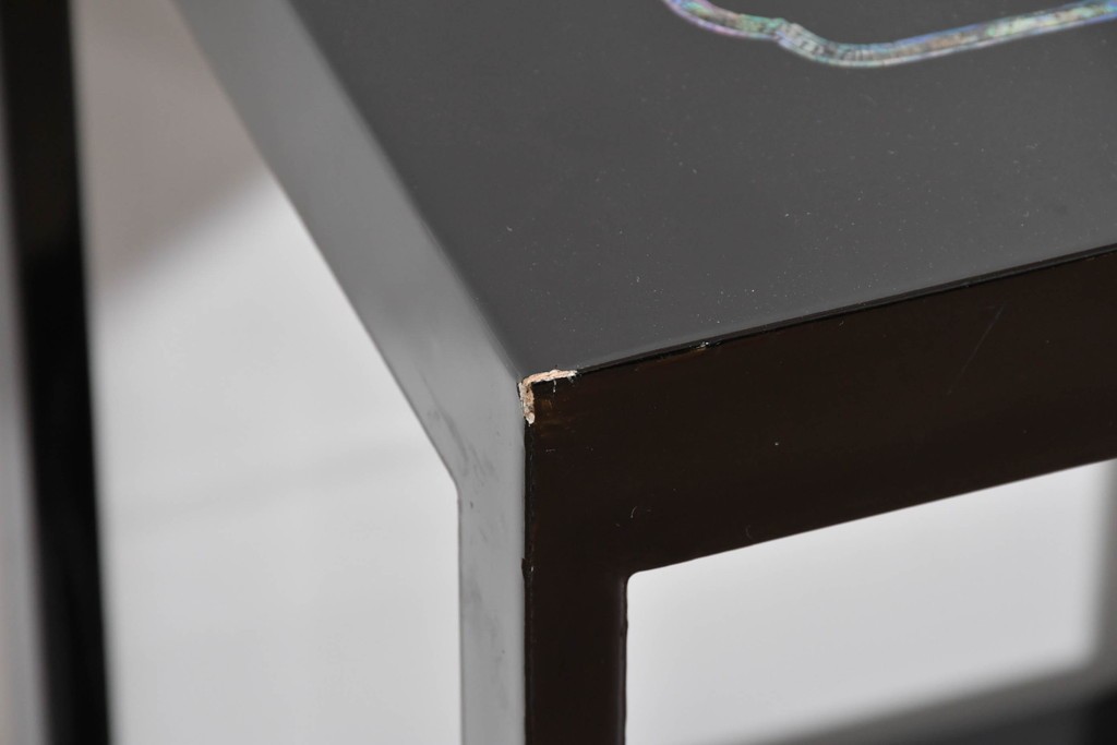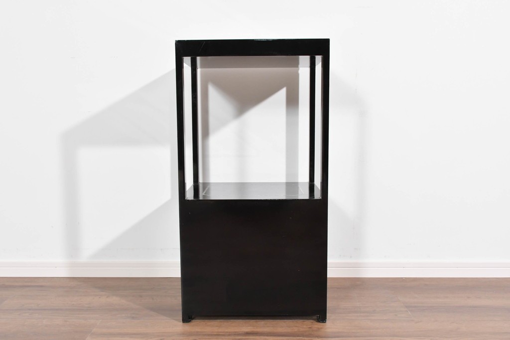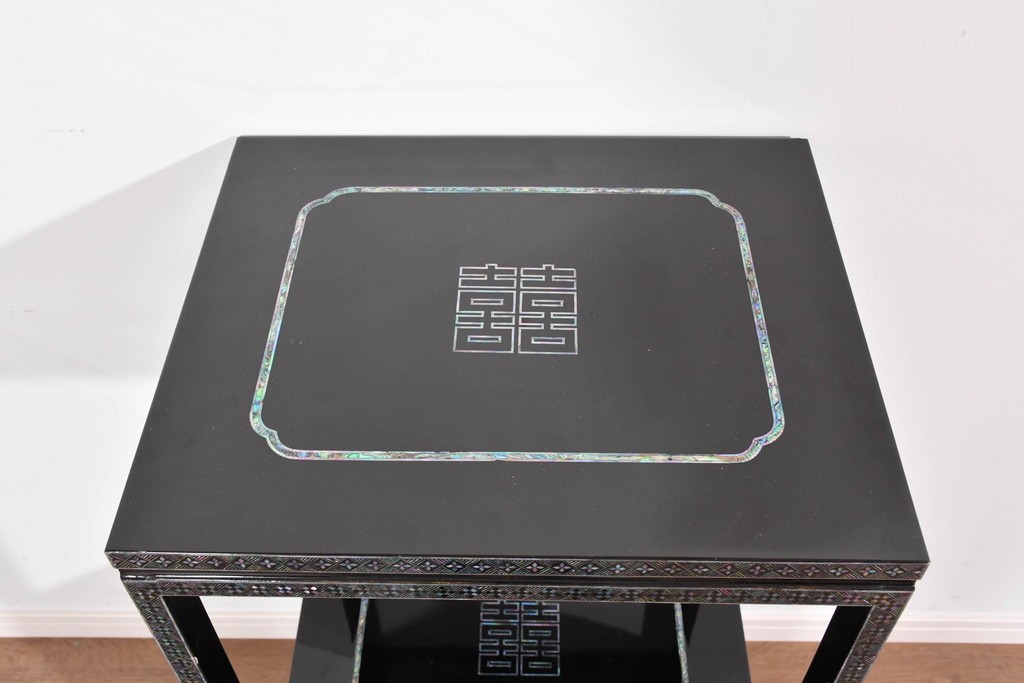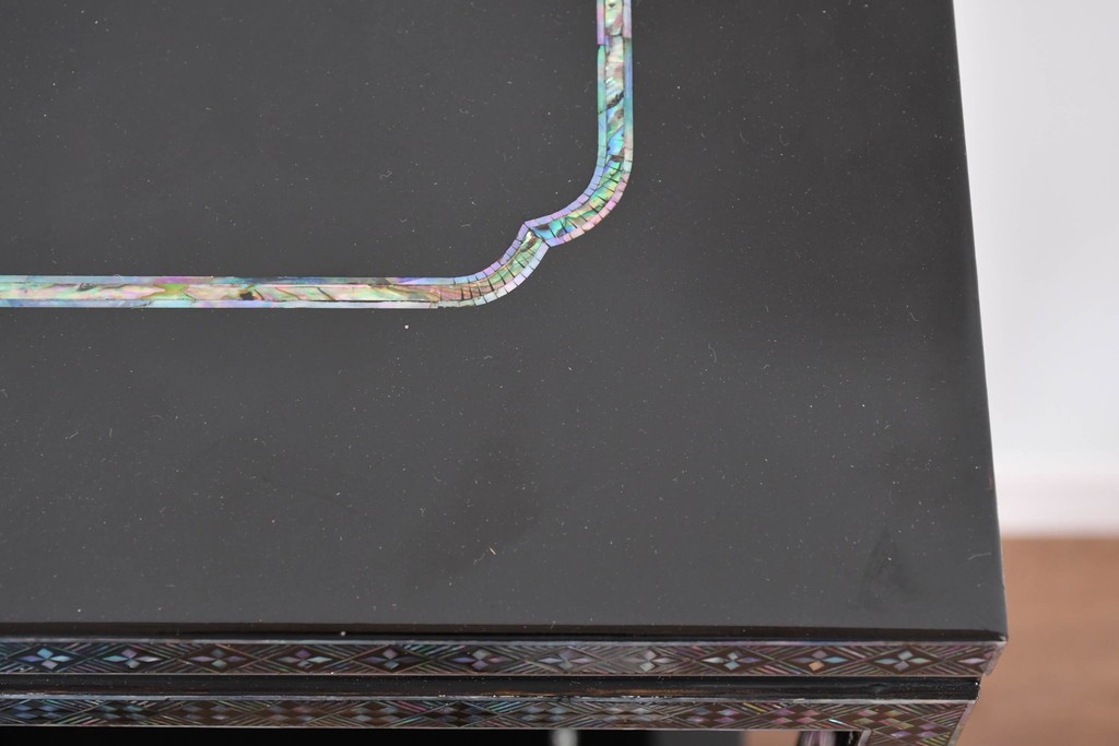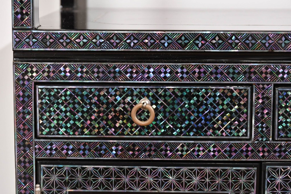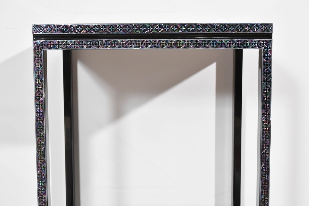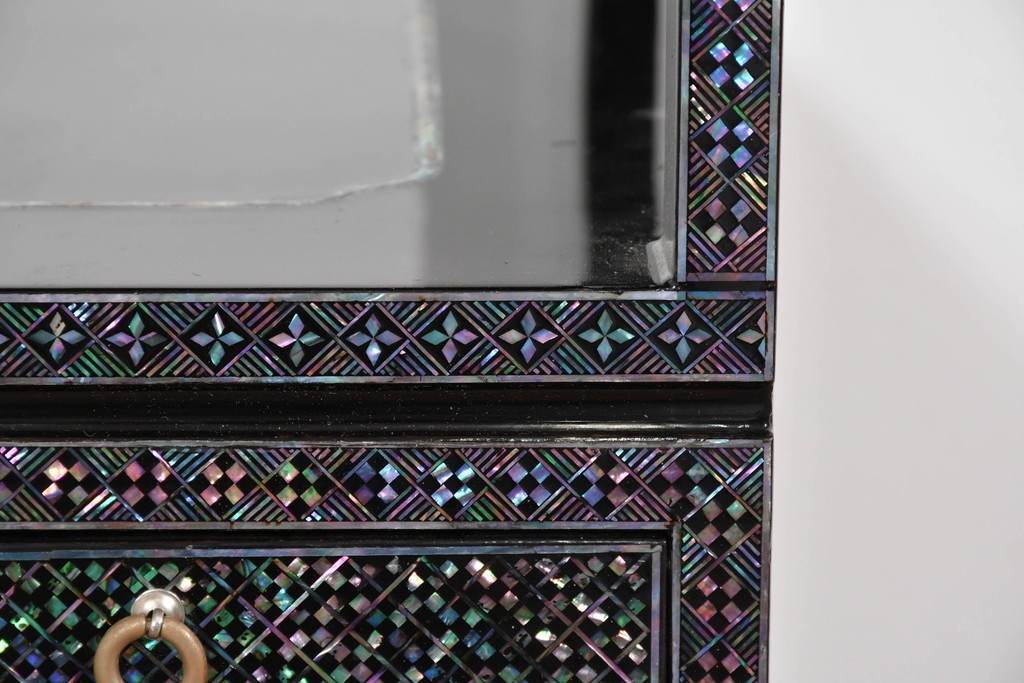 黒塗りの落ち着いた佇まいに、螺鈿細工の輝きが映える飾り棚です。