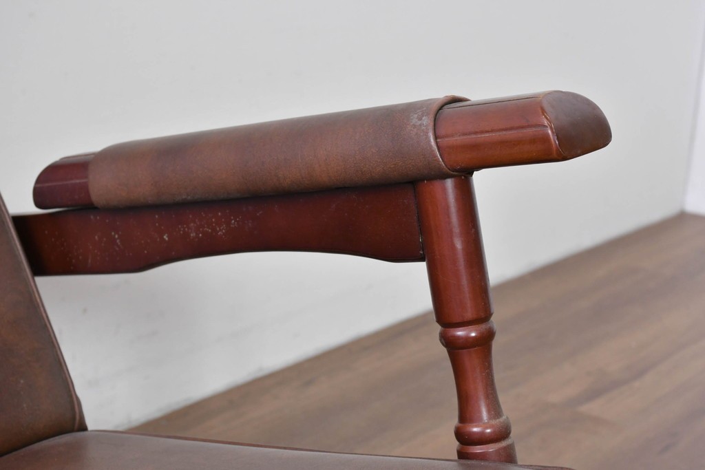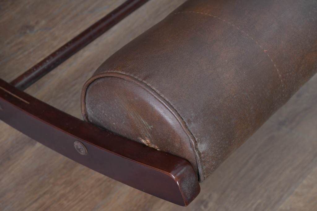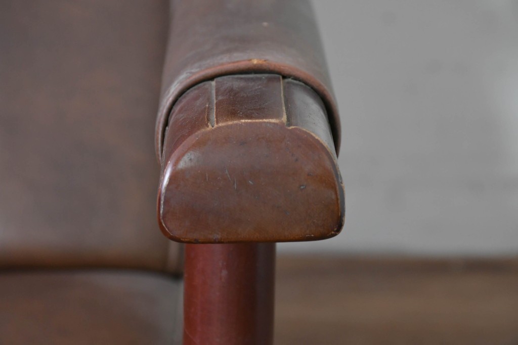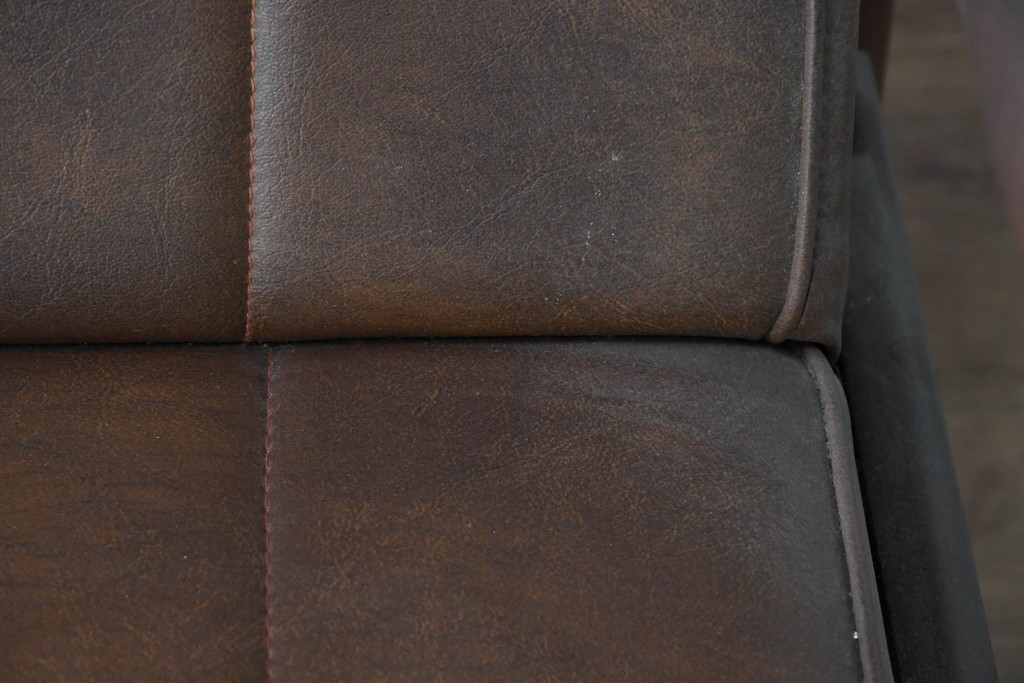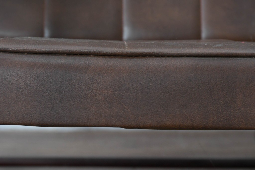 背もたれから座面にかけてビニールレザーが張られ、落ち着いた色調と柔らかな風合いが空間に穏やかな雰囲気を添えます。
