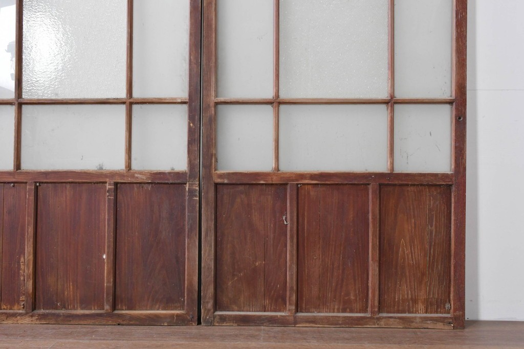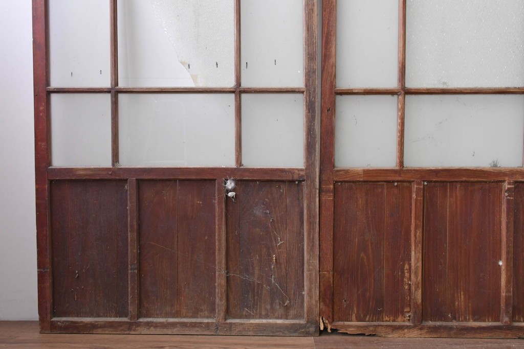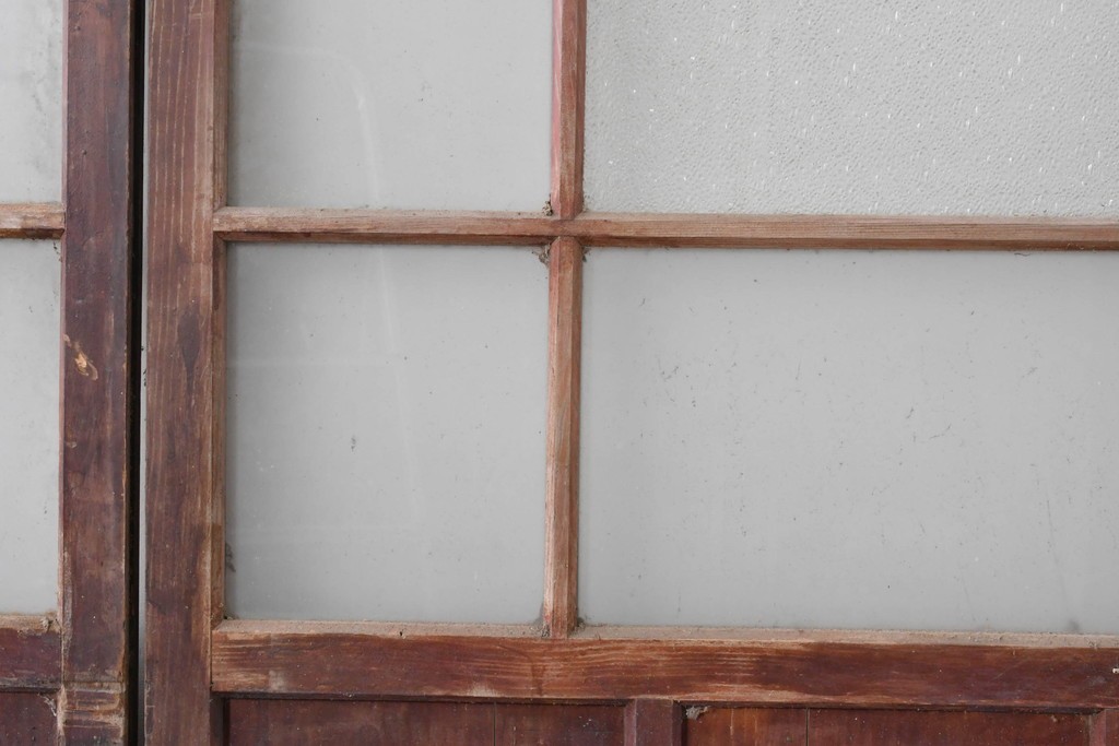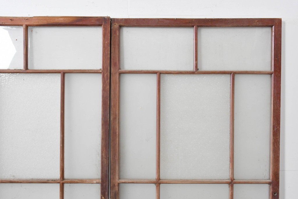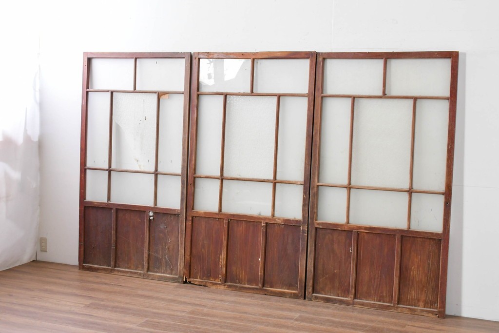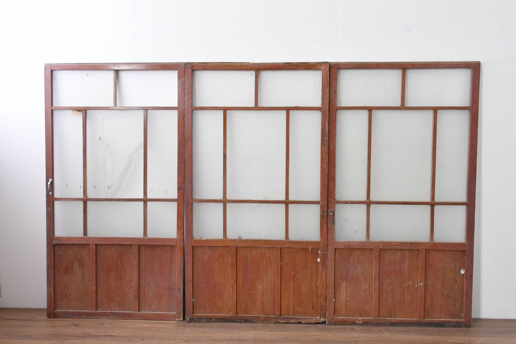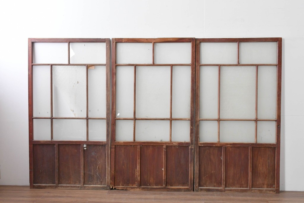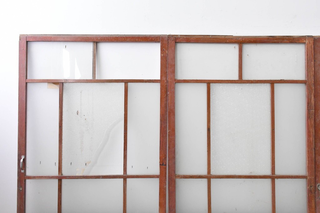 大正ロマンらしい、端正な格子の構成が印象的なガラス戸3枚セットです。上部の横長配置と中央の大きなガラス面の組み合わせによって、シンプルながら当時の和建具特有の柔らかな表情が感じられます。空間に落ち着きを添え、ノスタルジックな雰囲気づくりに役立ちます。