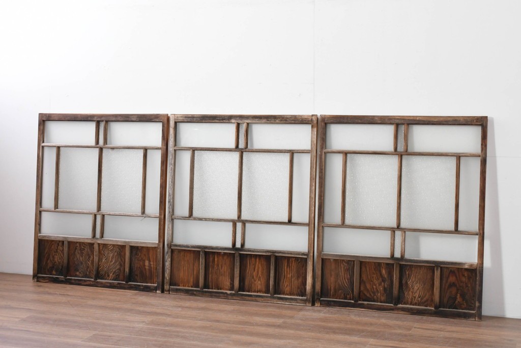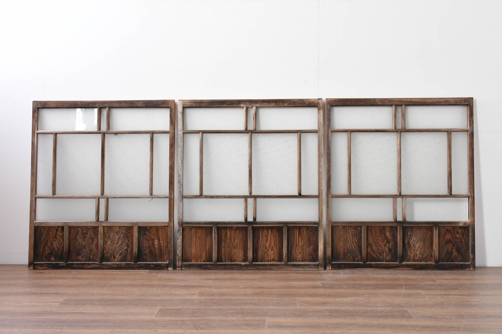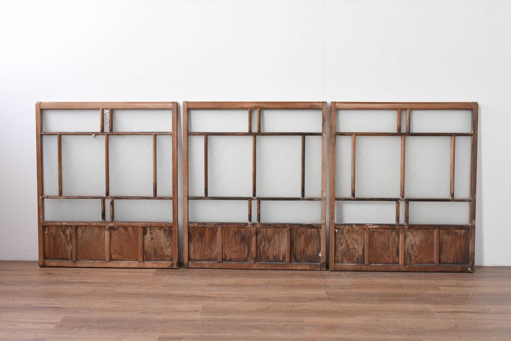 同意匠で揃った3枚セットのため、間仕切りや腰窓として連続したデザインを楽しめます。建具としての使用だけでなく、ディスプレイ什器や壁面装飾などにも応用でき、空間づくりの幅を広げてくれる実用性の高い建具です。古い建材を活かしたリノベーションをお考えの方にもおすすめです。