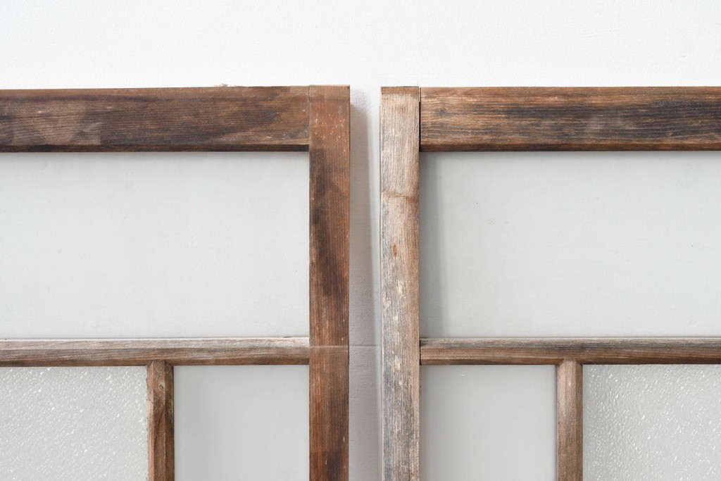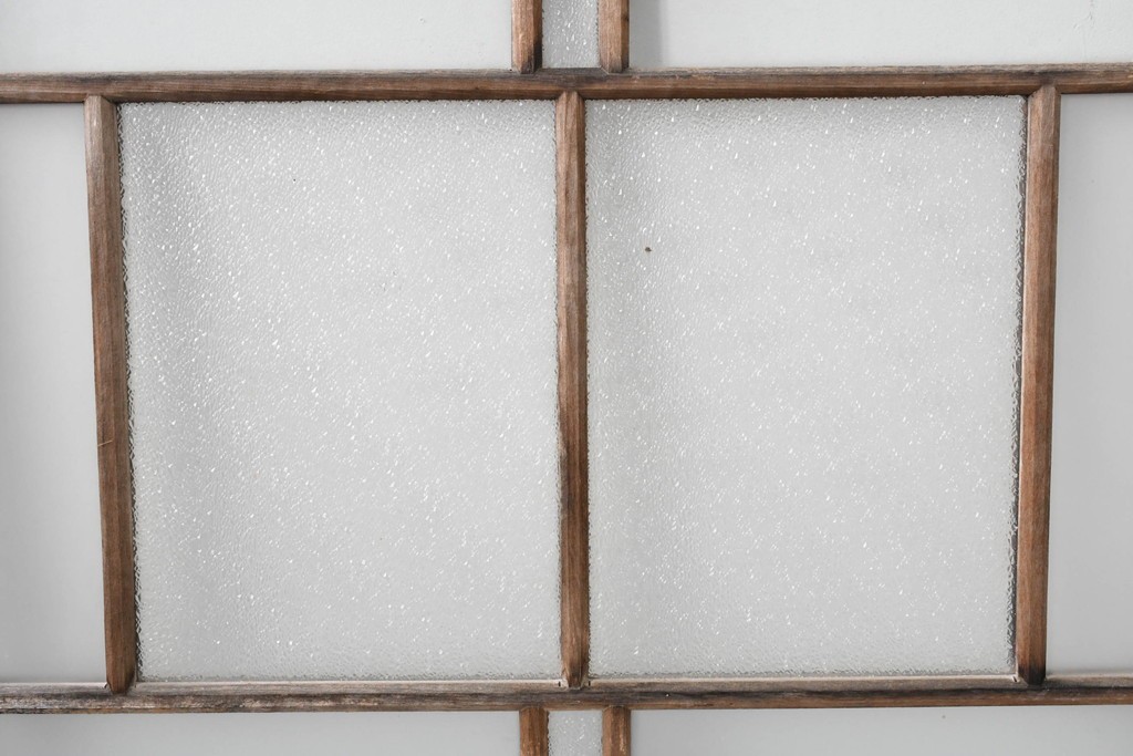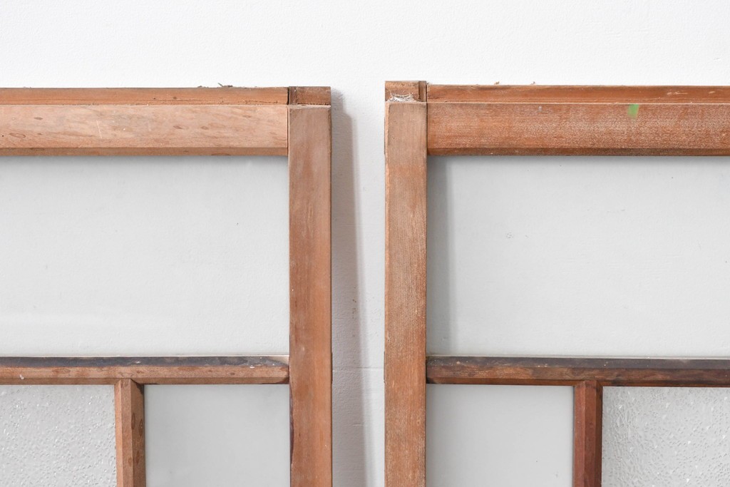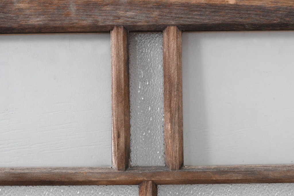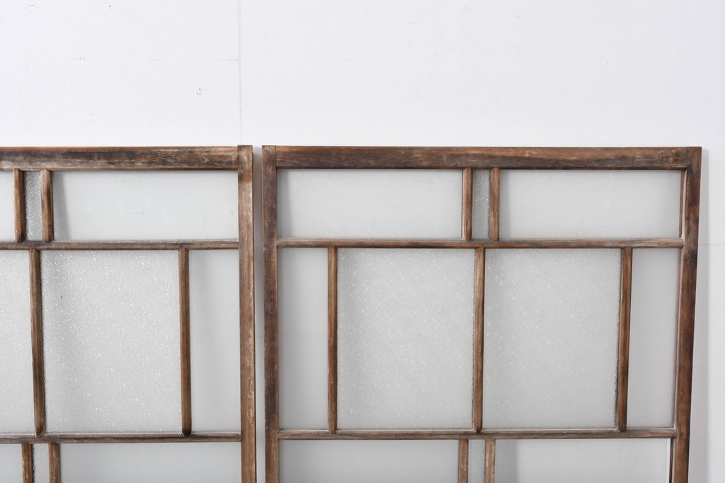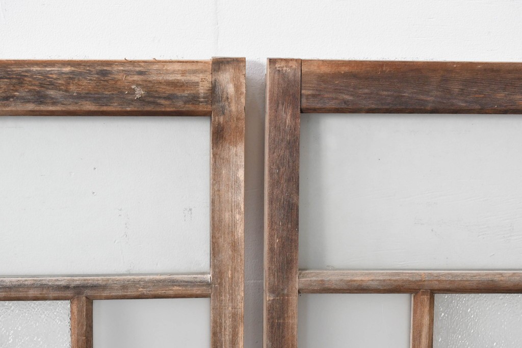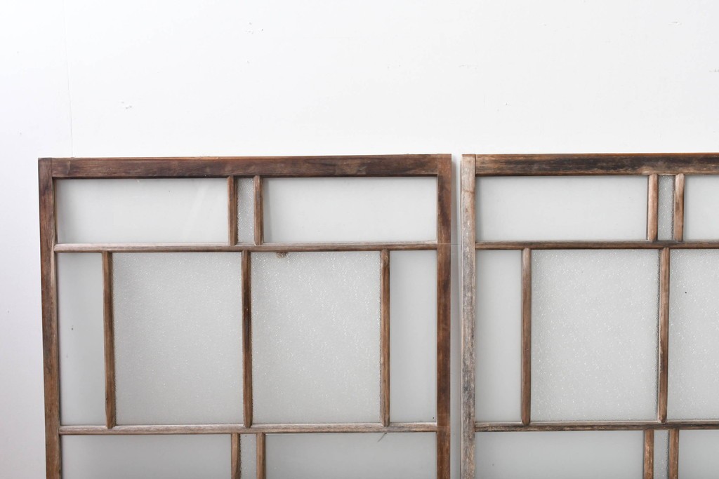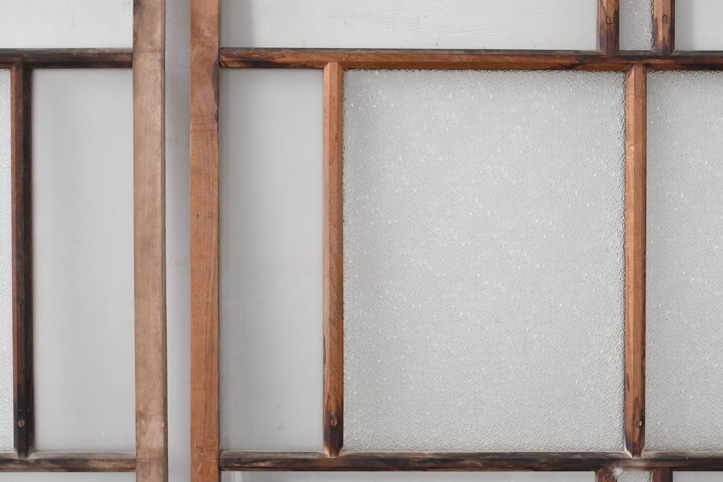 大正ロマンの雰囲気を感じさせる、素朴で品のあるガラス窓3枚セットです。上品な格子構成とガラスの組み合わせが、当時の建具らしい落ち着いた表情を生み、和の空間に柔らかい光を取り込む役割を果たします。直線的な意匠の中に手仕事の温かみが漂う一品です。