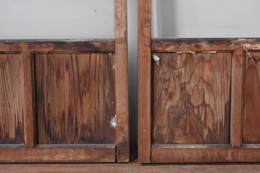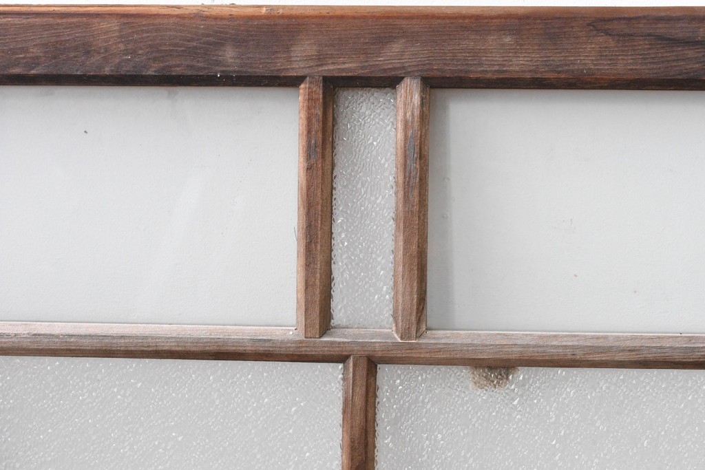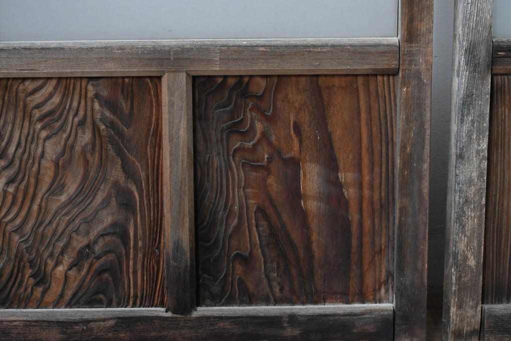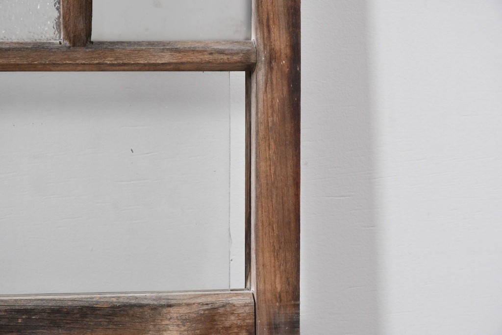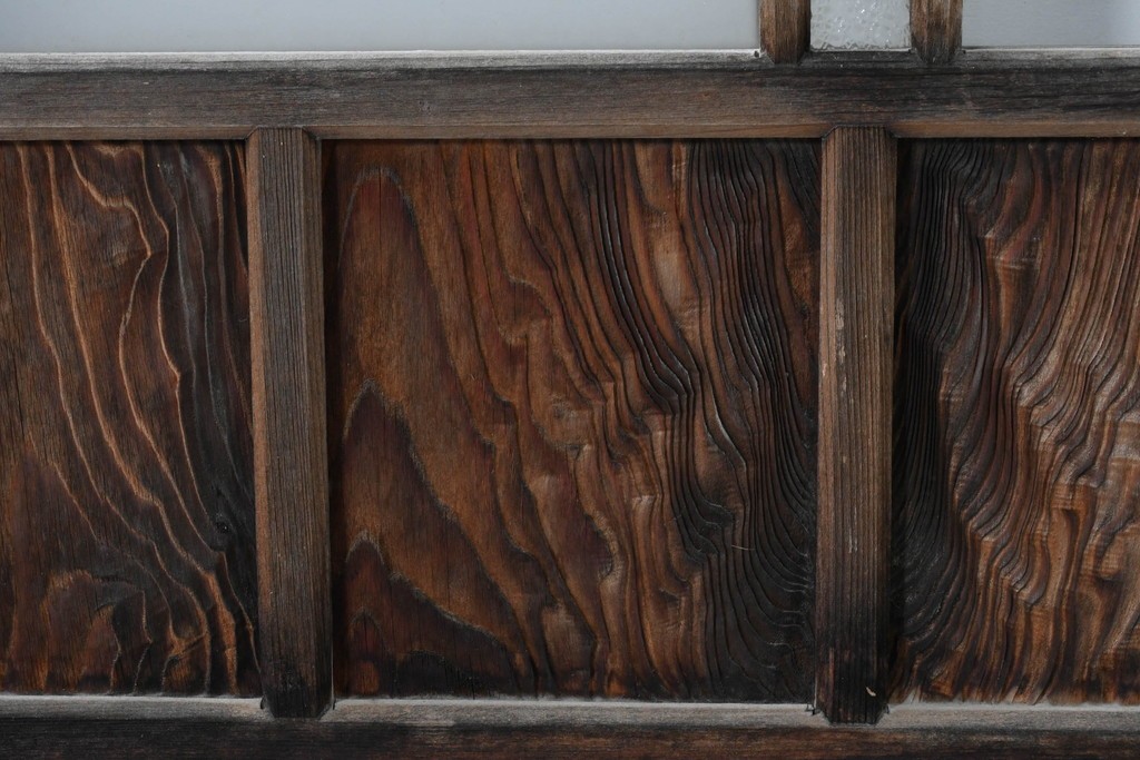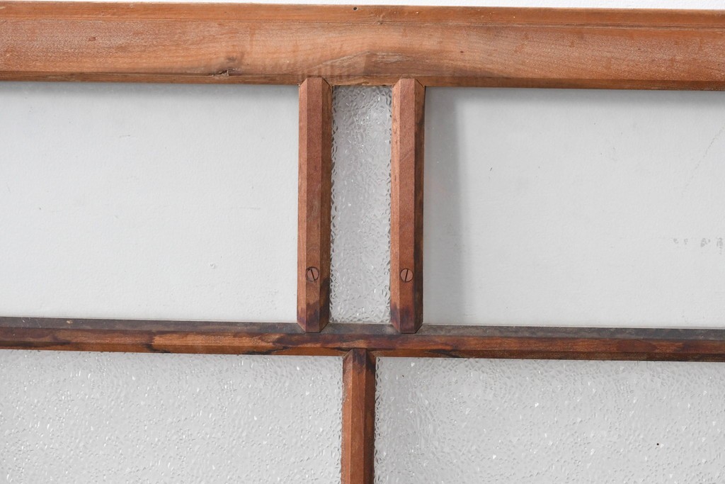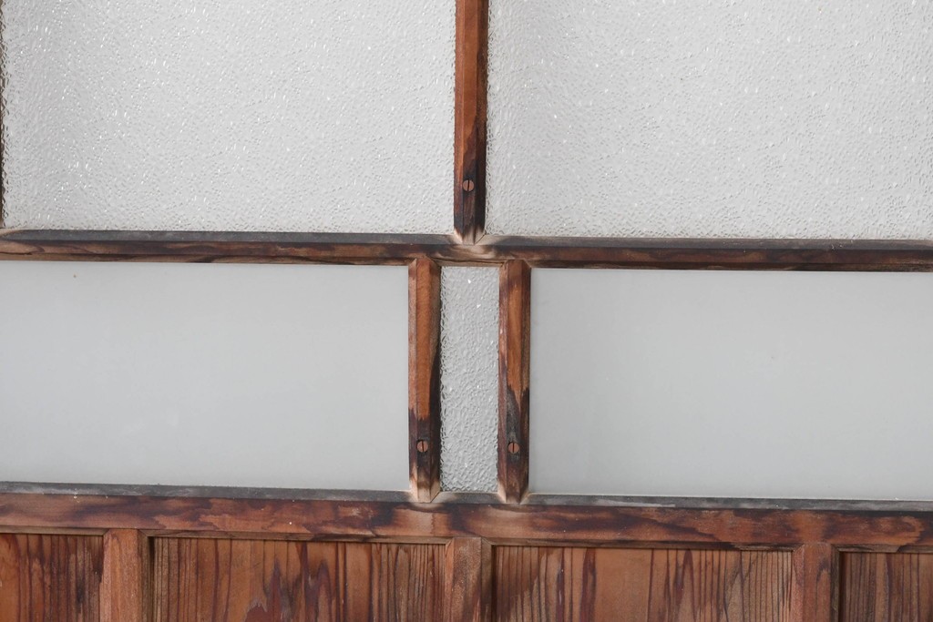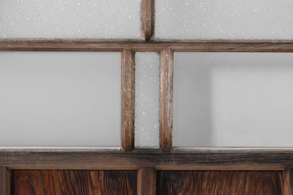 下部の板材には、長い年月を経て深まった木味がしっかりと残っており、個性豊かな風合いが魅力です。節や木目の動きが自然な表情をつくり、アンティーク建具ならではの味わいを楽しめる点がポイントです。和室はもちろん、古民家風インテリアや店舗演出にもよく馴染みます。