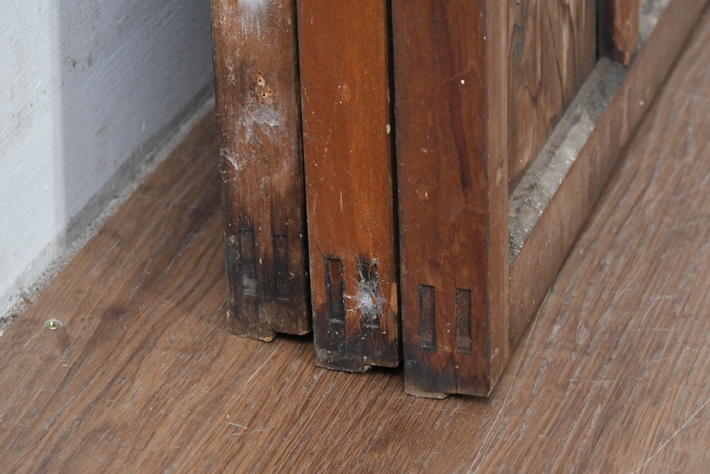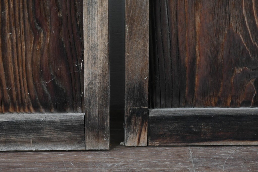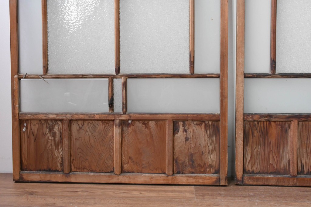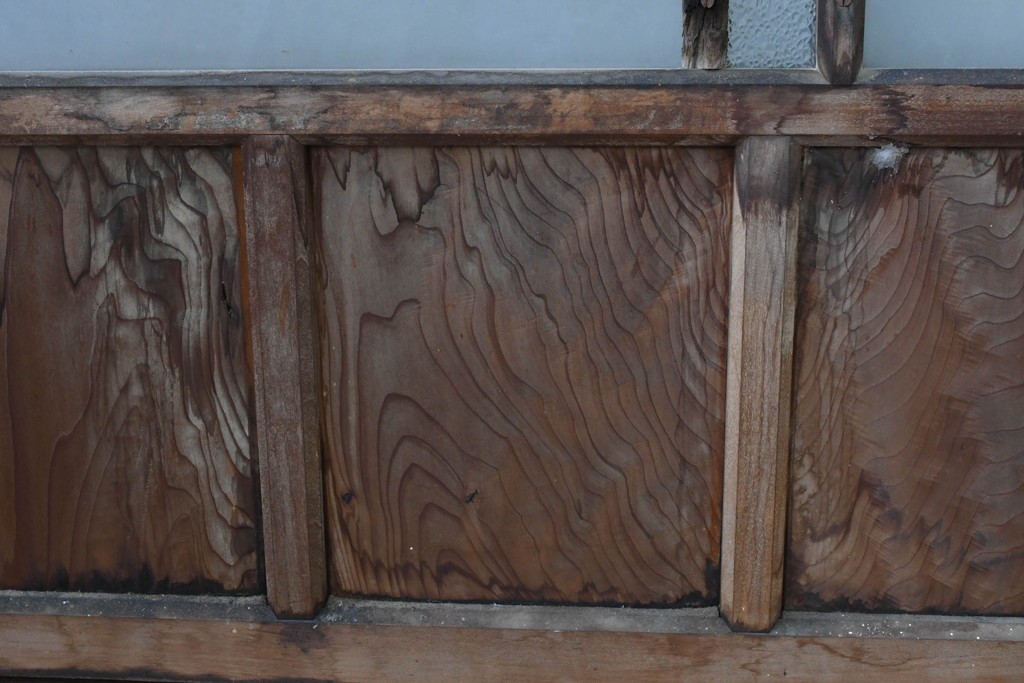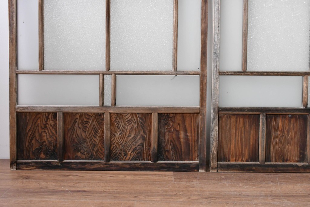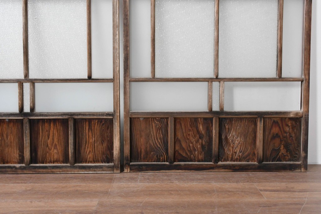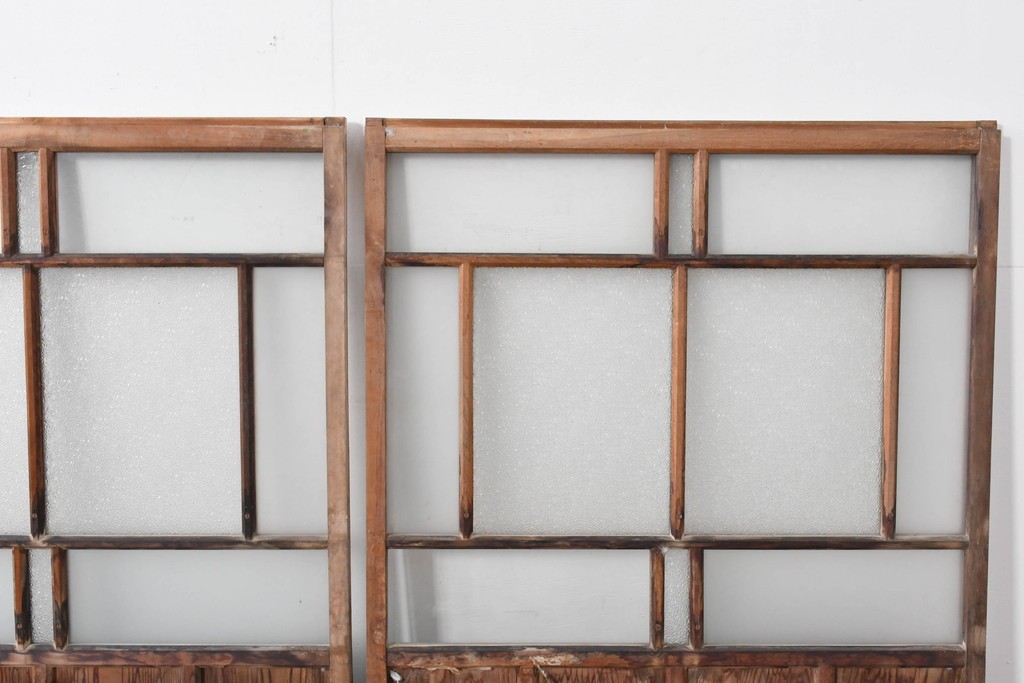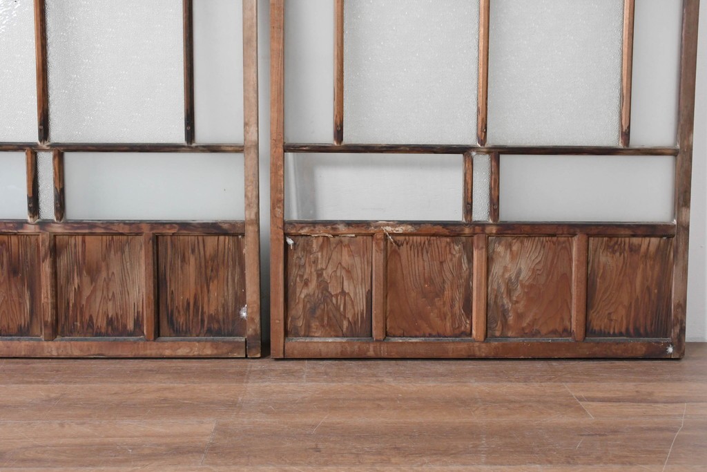 下部の板材には、長い年月を経て深まった木味がしっかりと残っており、個性豊かな風合いが魅力です。節や木目の動きが自然な表情をつくり、アンティーク建具ならではの味わいを楽しめる点がポイントです。和室はもちろん、古民家風インテリアや店舗演出にもよく馴染みます。