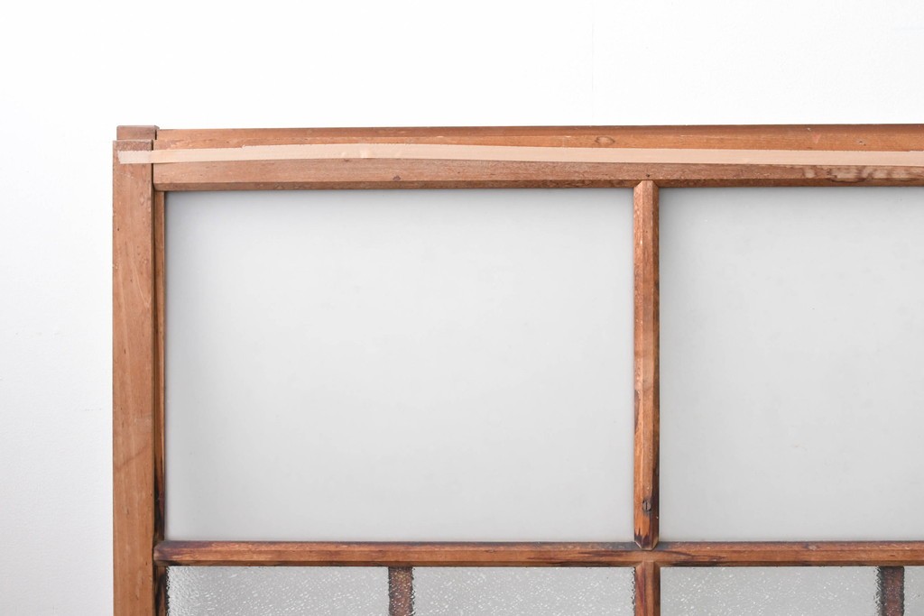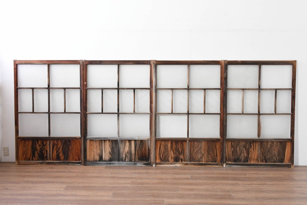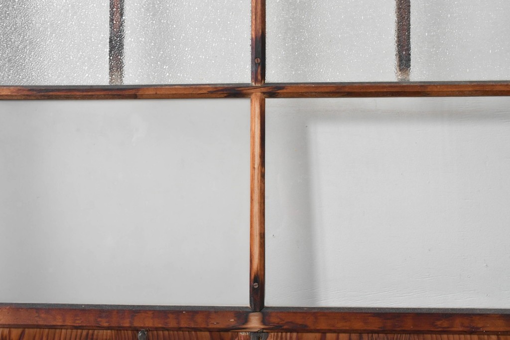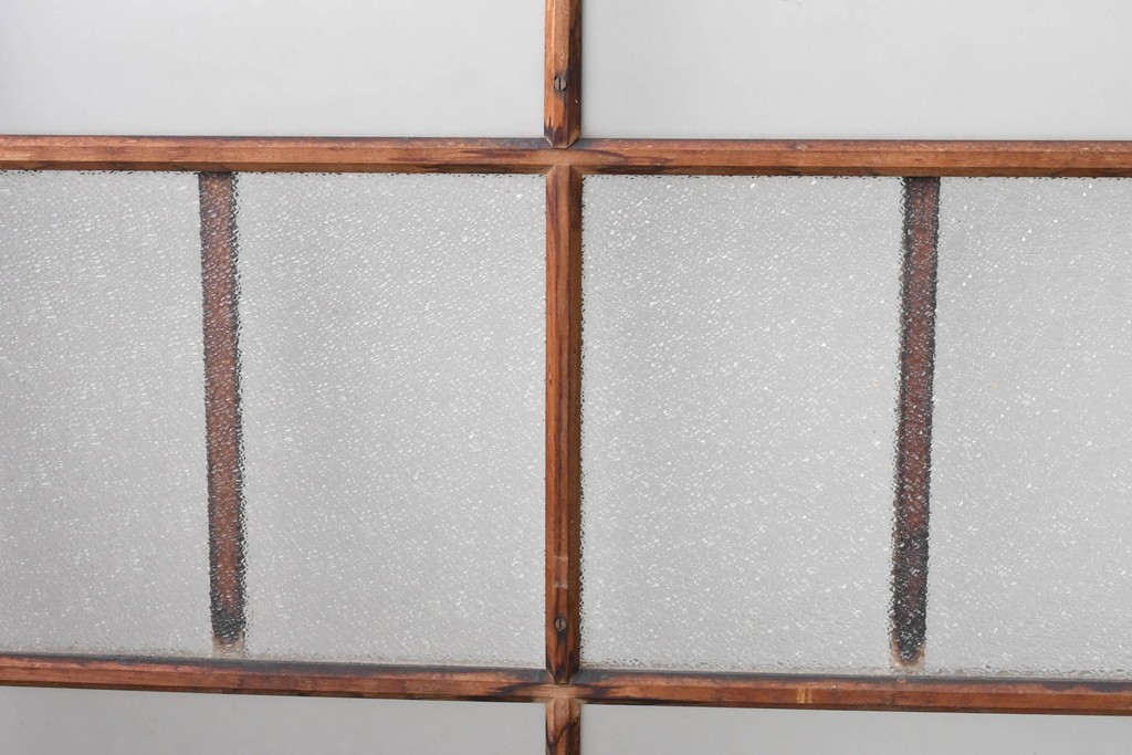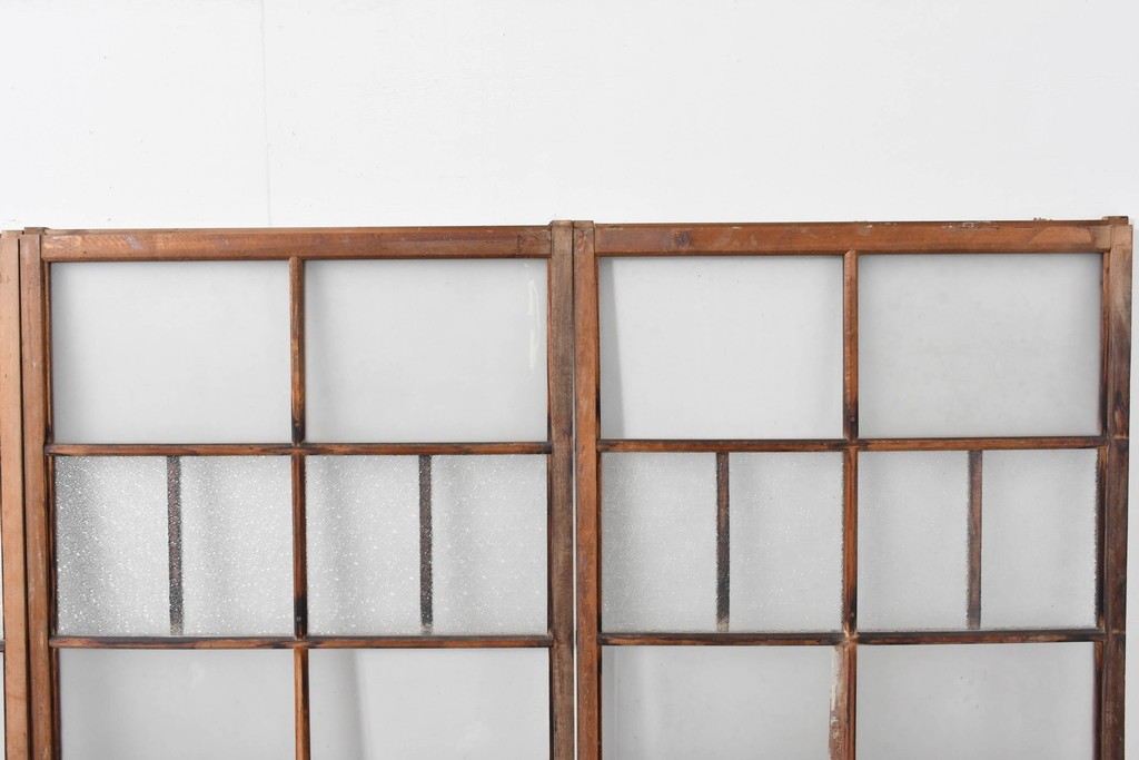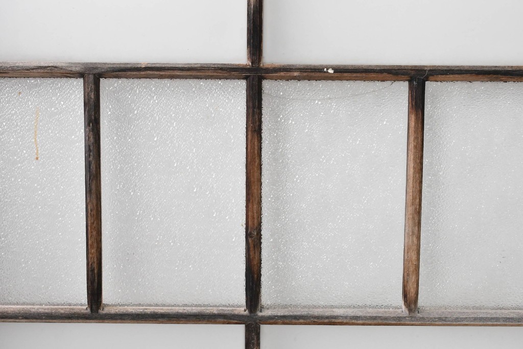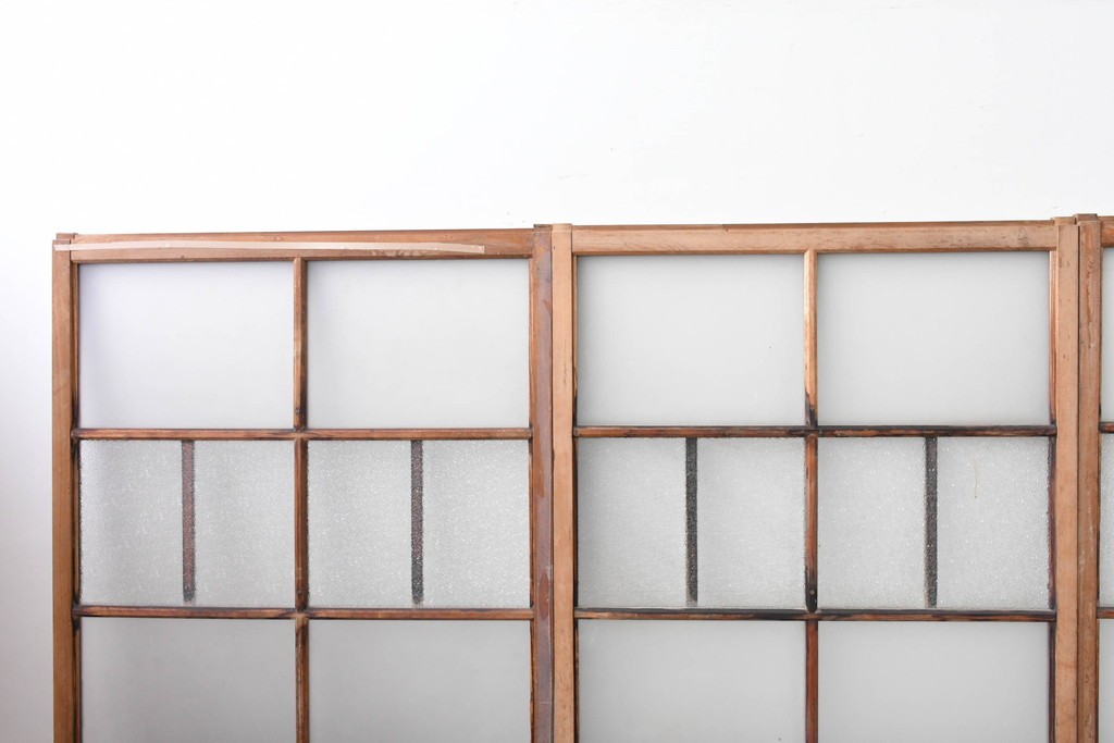 昭和初期につくられたガラス窓4枚セットです。上下と中央で表情の異なる格子を組み合わせたつくりは、当時の和住宅に見られる落ち着いた佇まいをしっかりと感じさせます。直線的な意匠の中に、手仕事ならではの柔らかい風合いが残り、和室・古民家の雰囲気づくりに馴染みます。