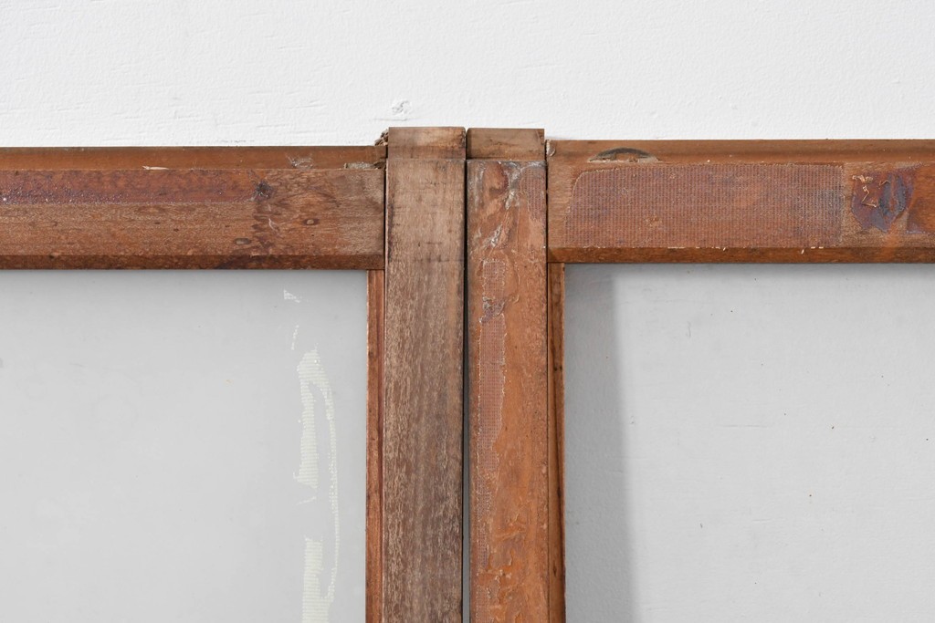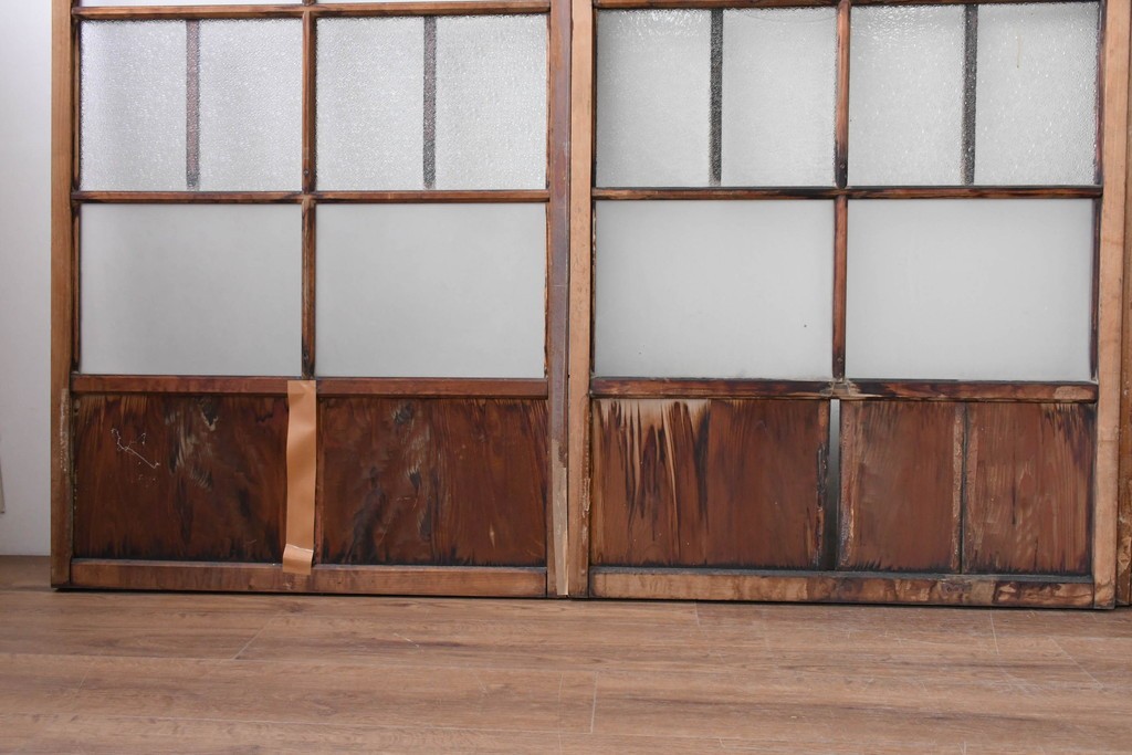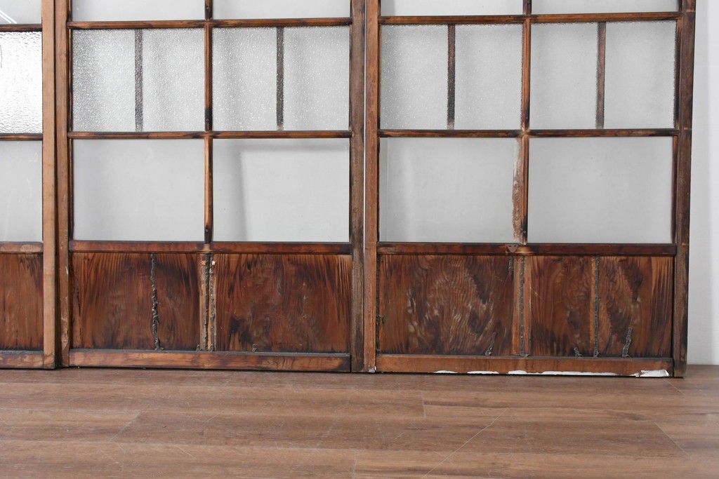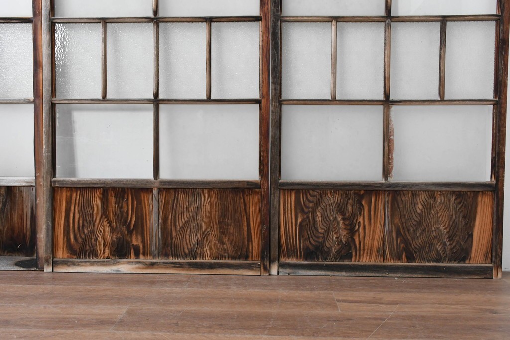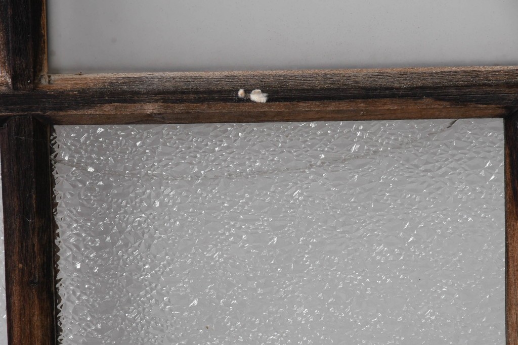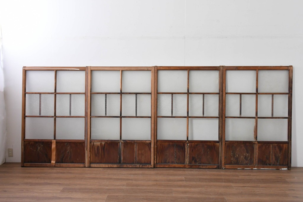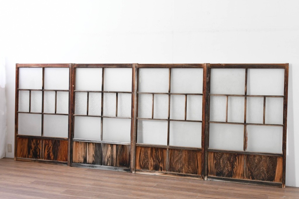昭和初期につくられたガラス窓4枚セットです。上下と中央で表情の異なる格子を組み合わせたつくりは、当時の和住宅に見られる落ち着いた佇まいをしっかりと感じさせます。直線的な意匠の中に、手仕事ならではの柔らかい風合いが残り、和室・古民家の雰囲気づくりに馴染みます。